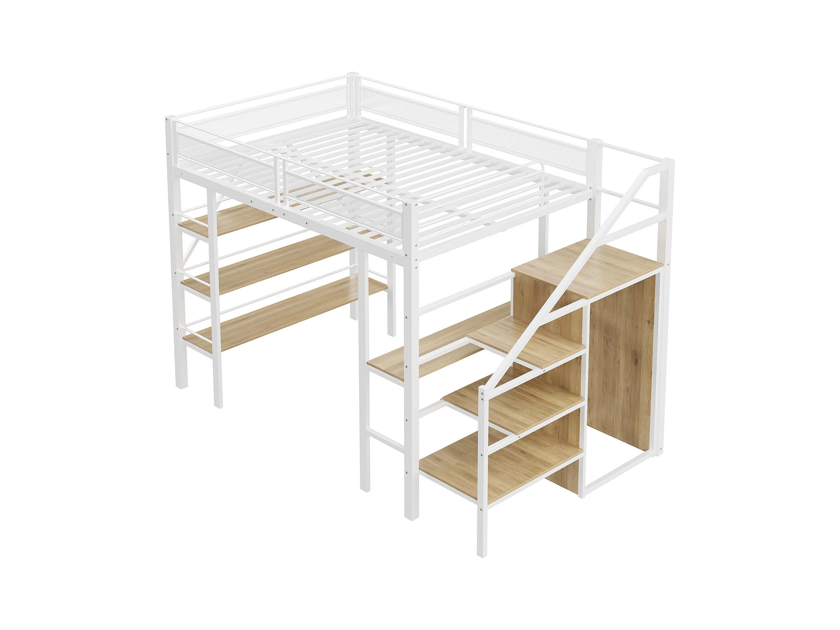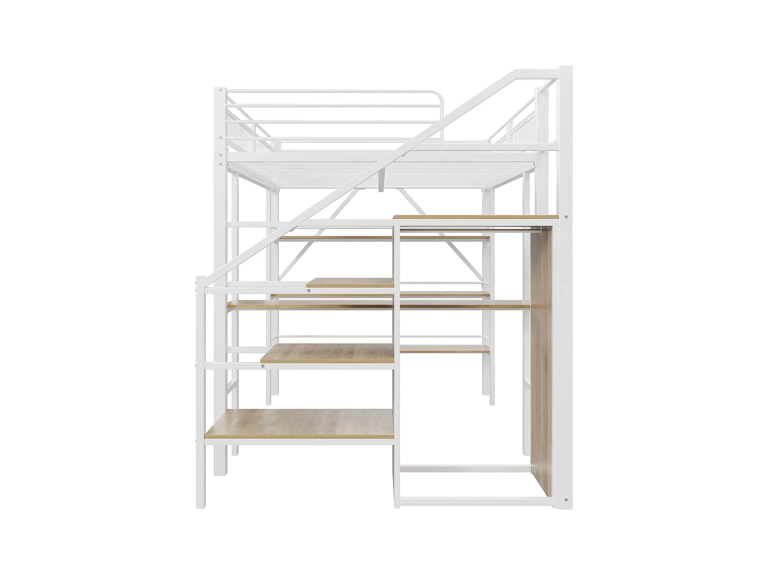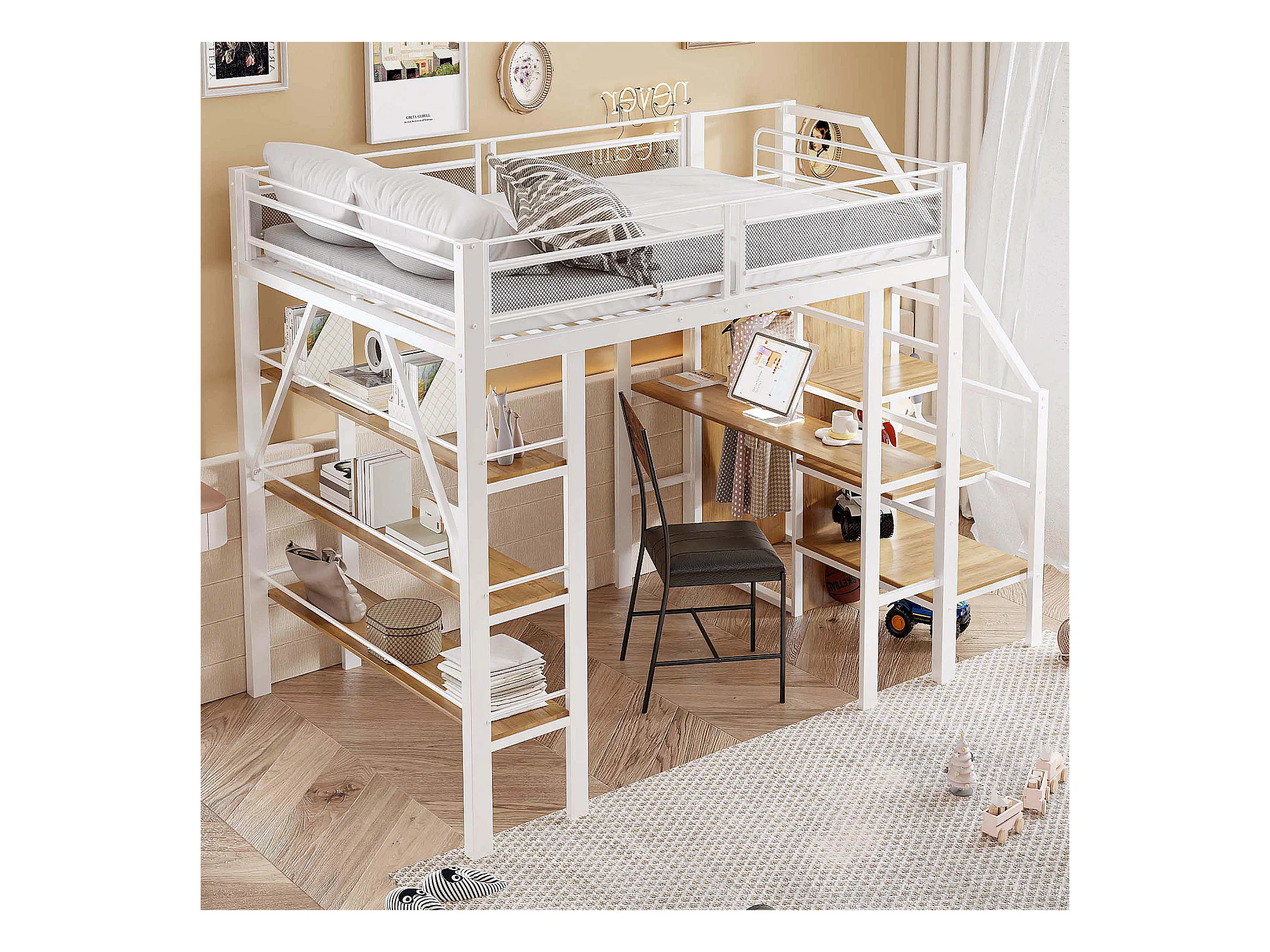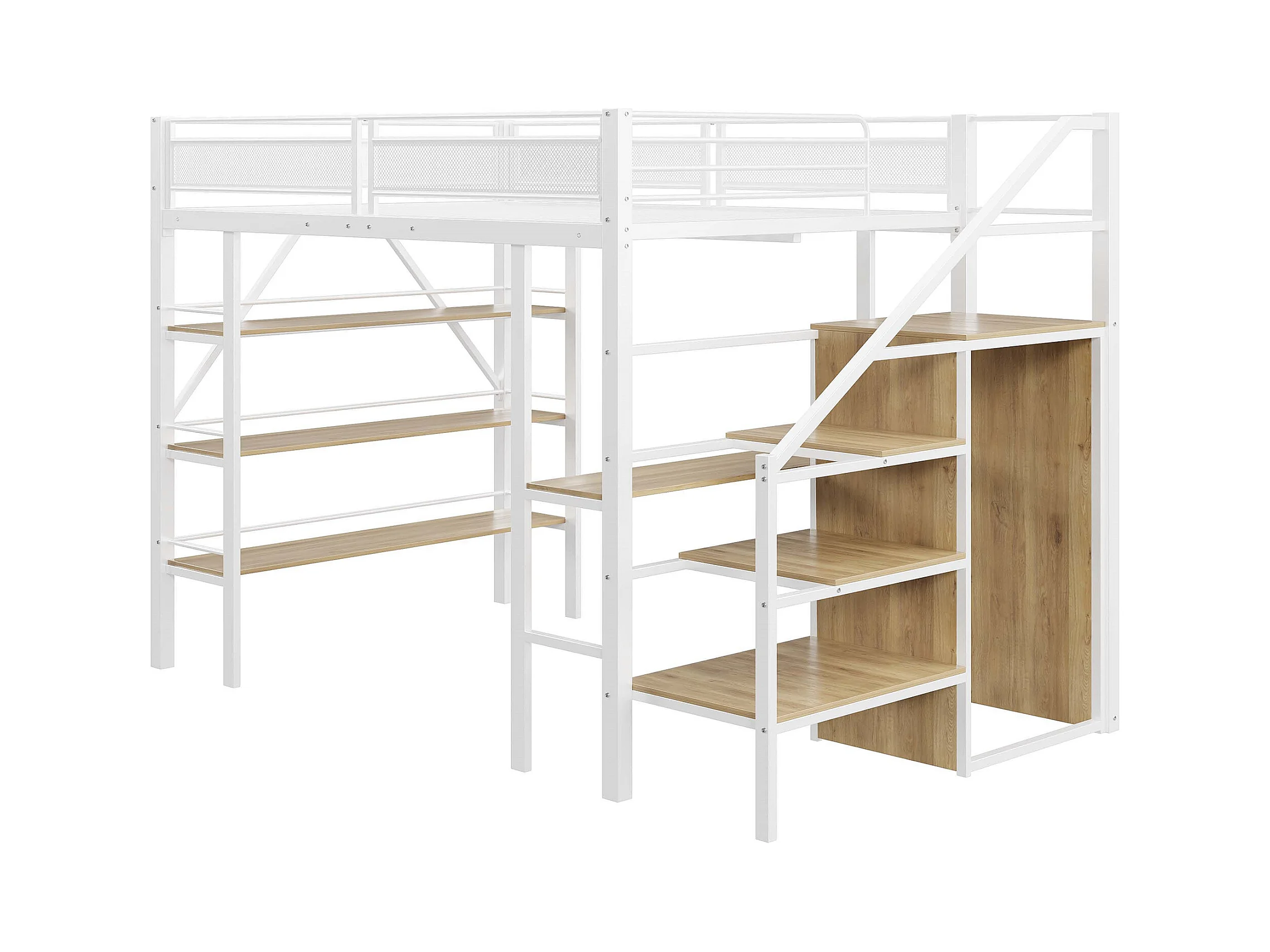 Hochbett aus Metall 140x200cm - mit einem Schreibtisch und Staufächern - Weiß