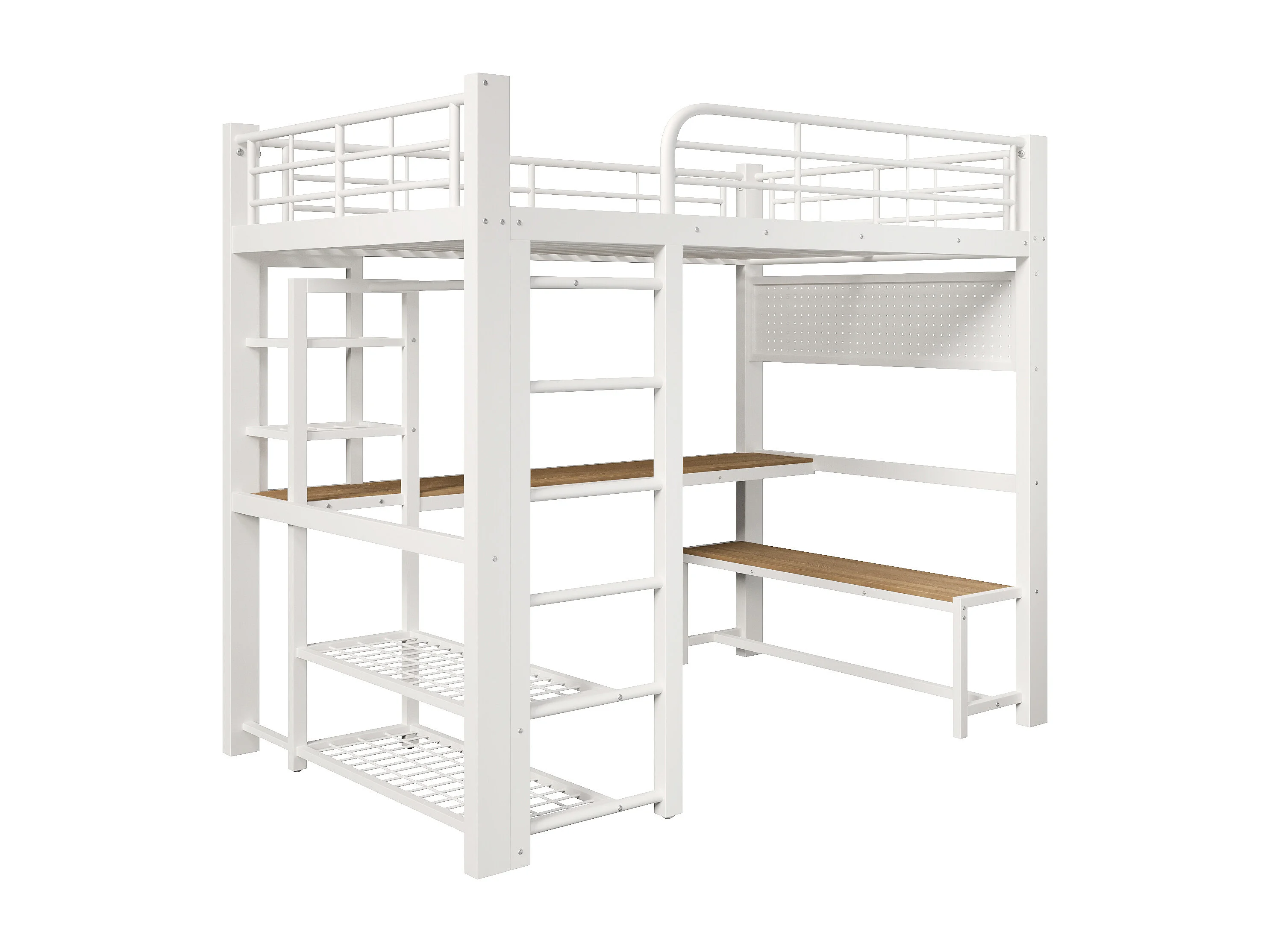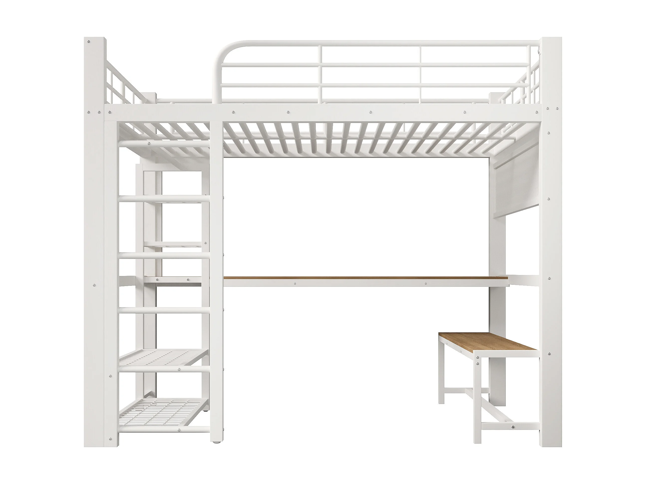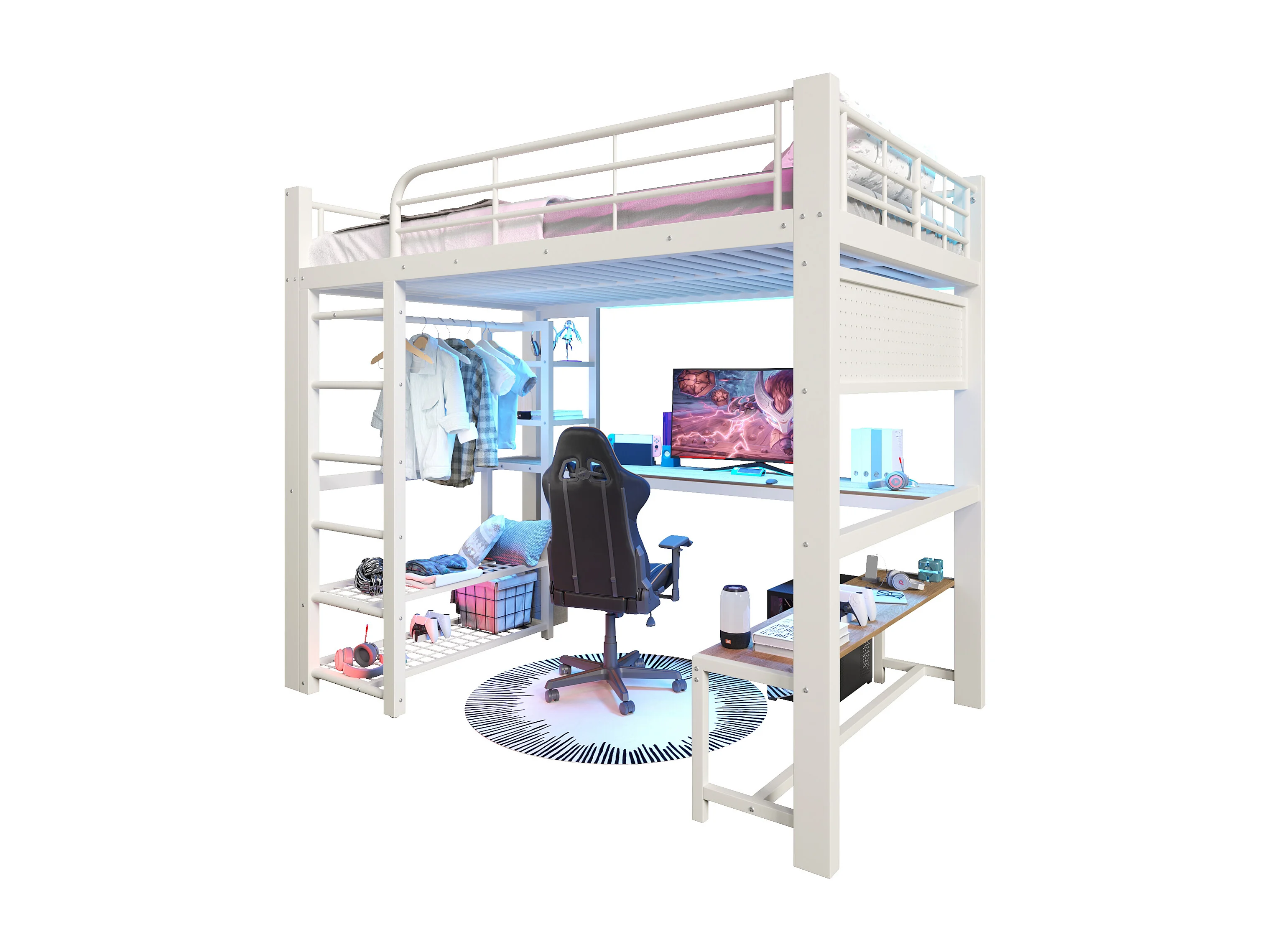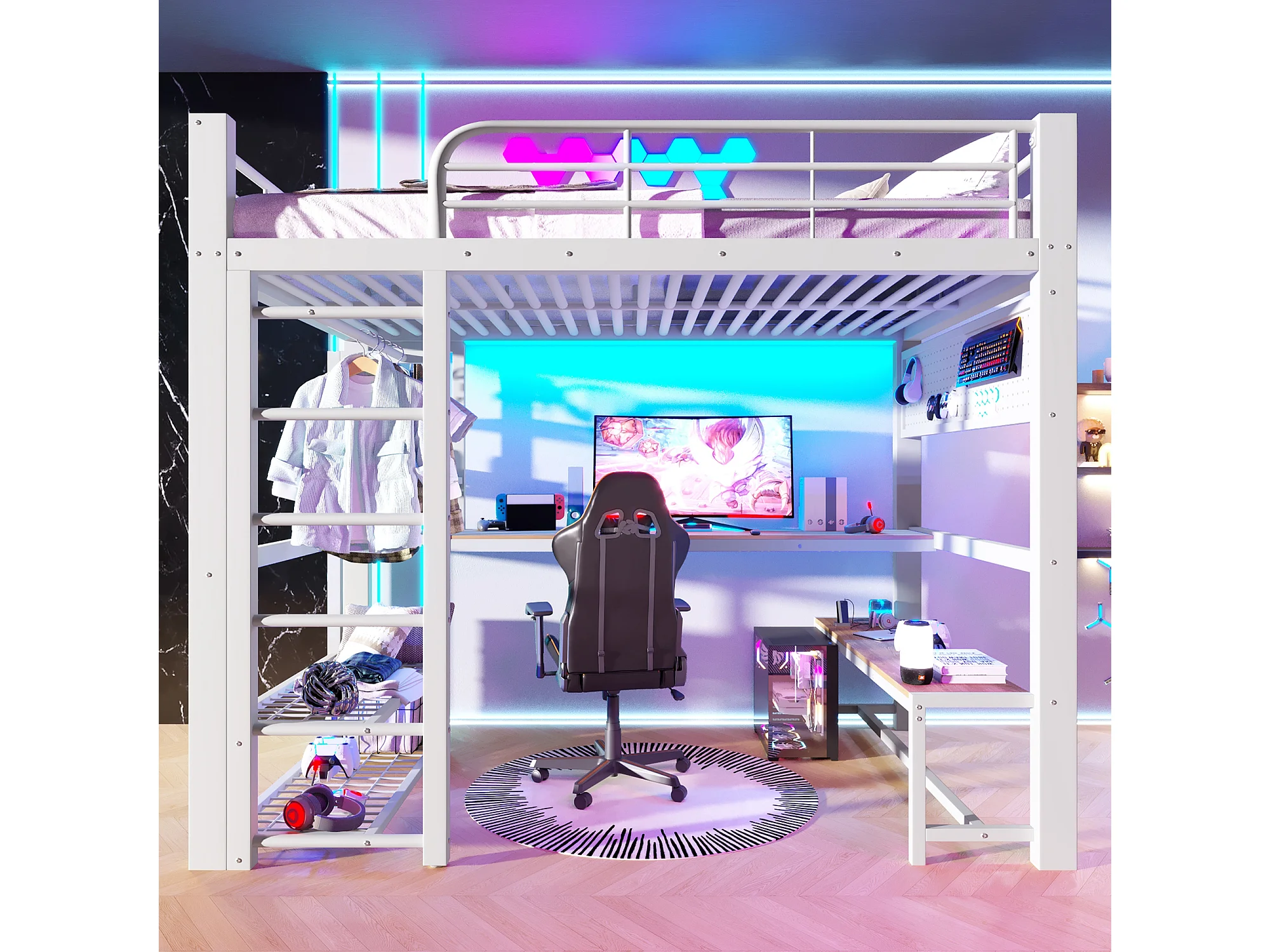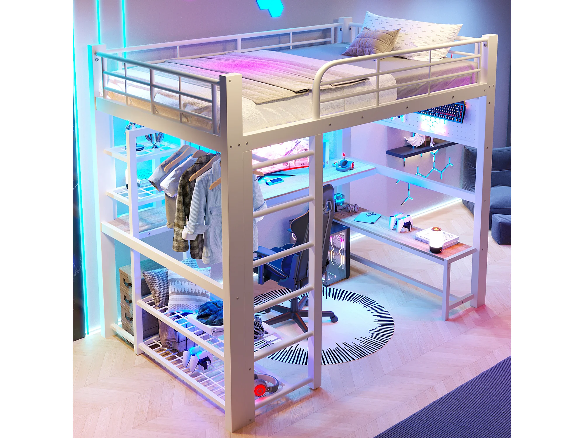 Hochbett aus Metall für Kinder – 140 x 200 cm – mit LED-Beleuchtung, Ablagefächern, Schreibtisch und Wäscheständer – weiß