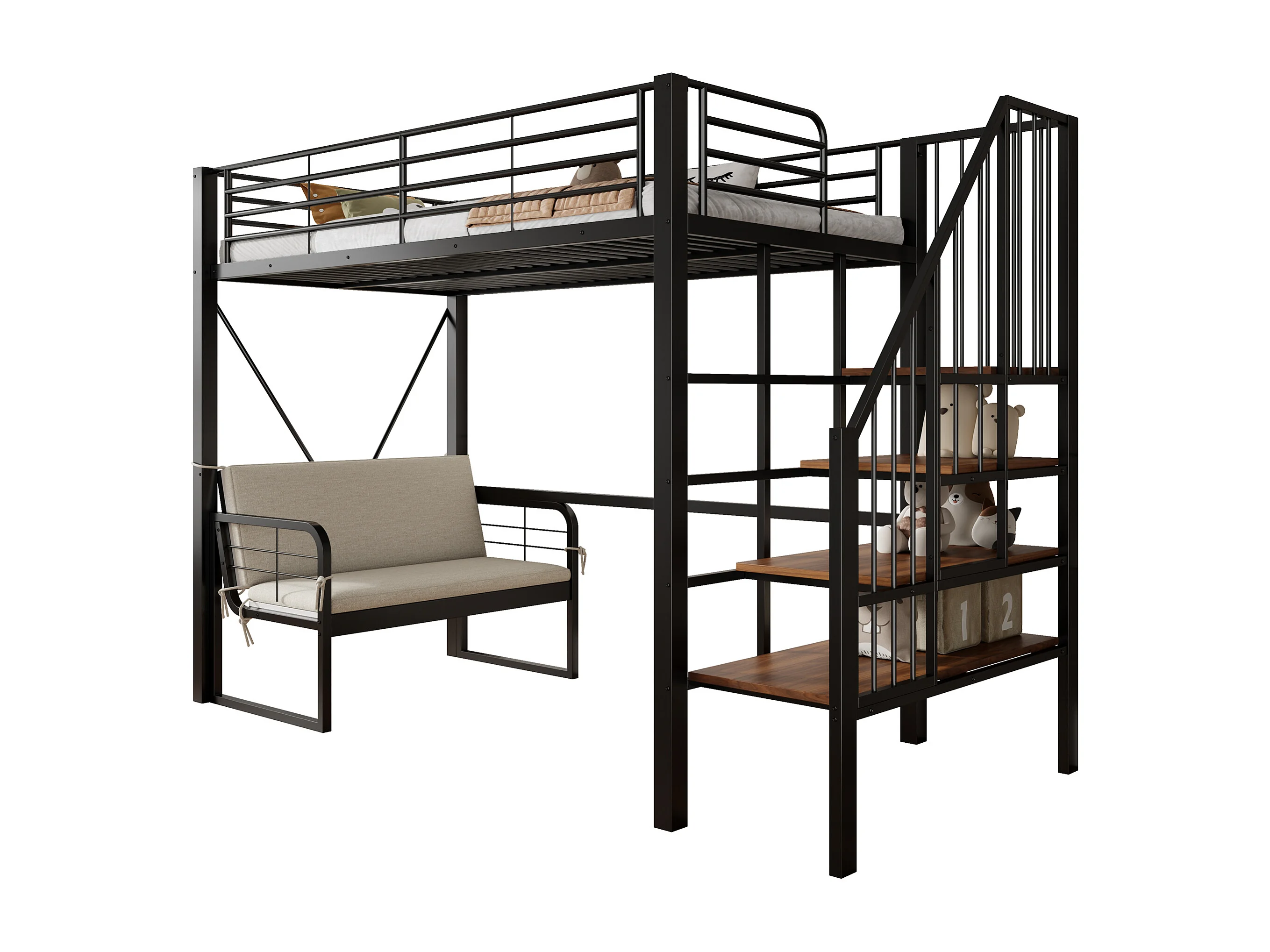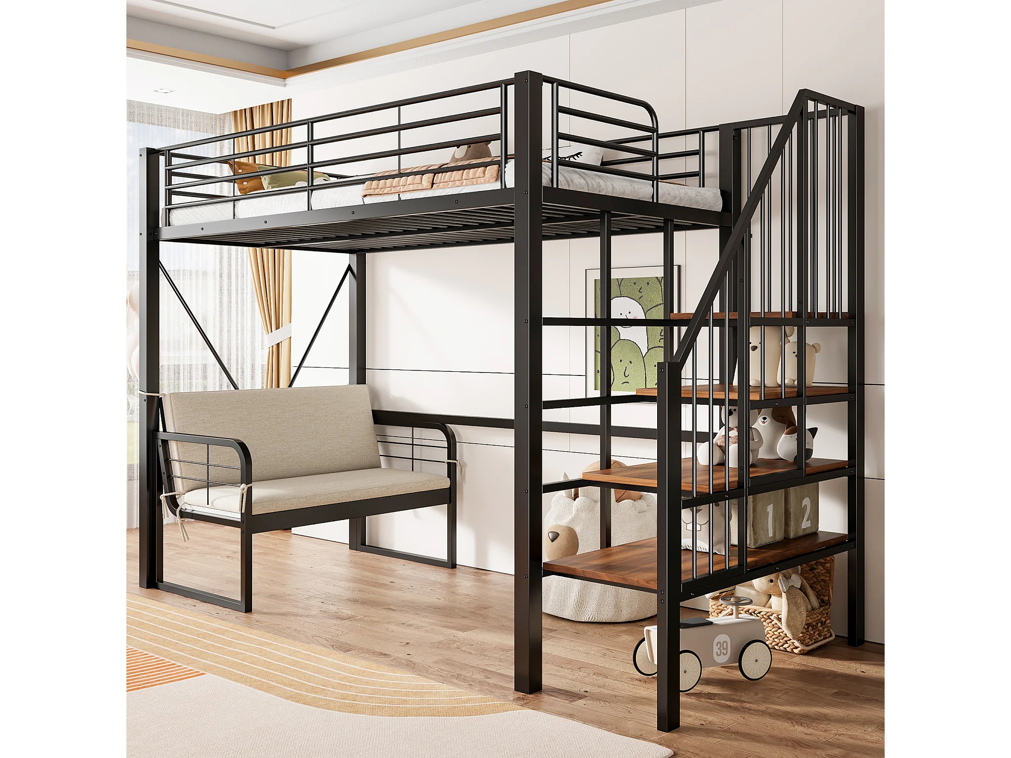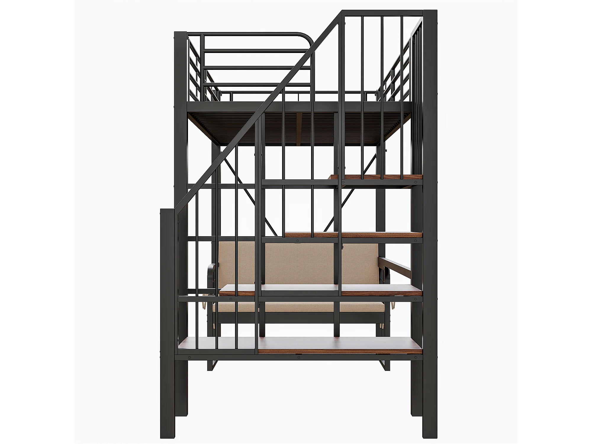 Hochbett für Kinder – 90 x 200 cm – mit abnehmbarem Sofa und Leiter mit Stauraum – Metallrahmen – schwarz