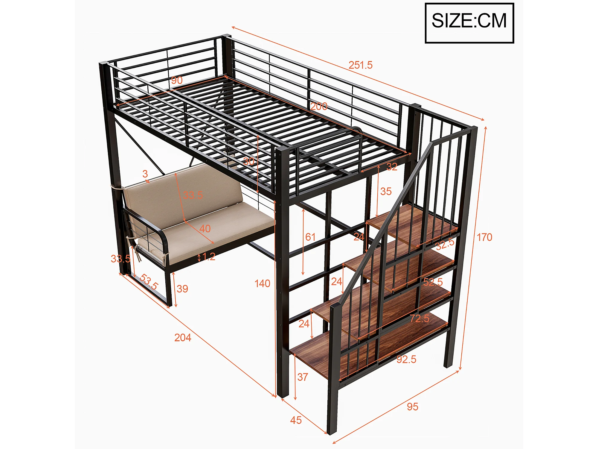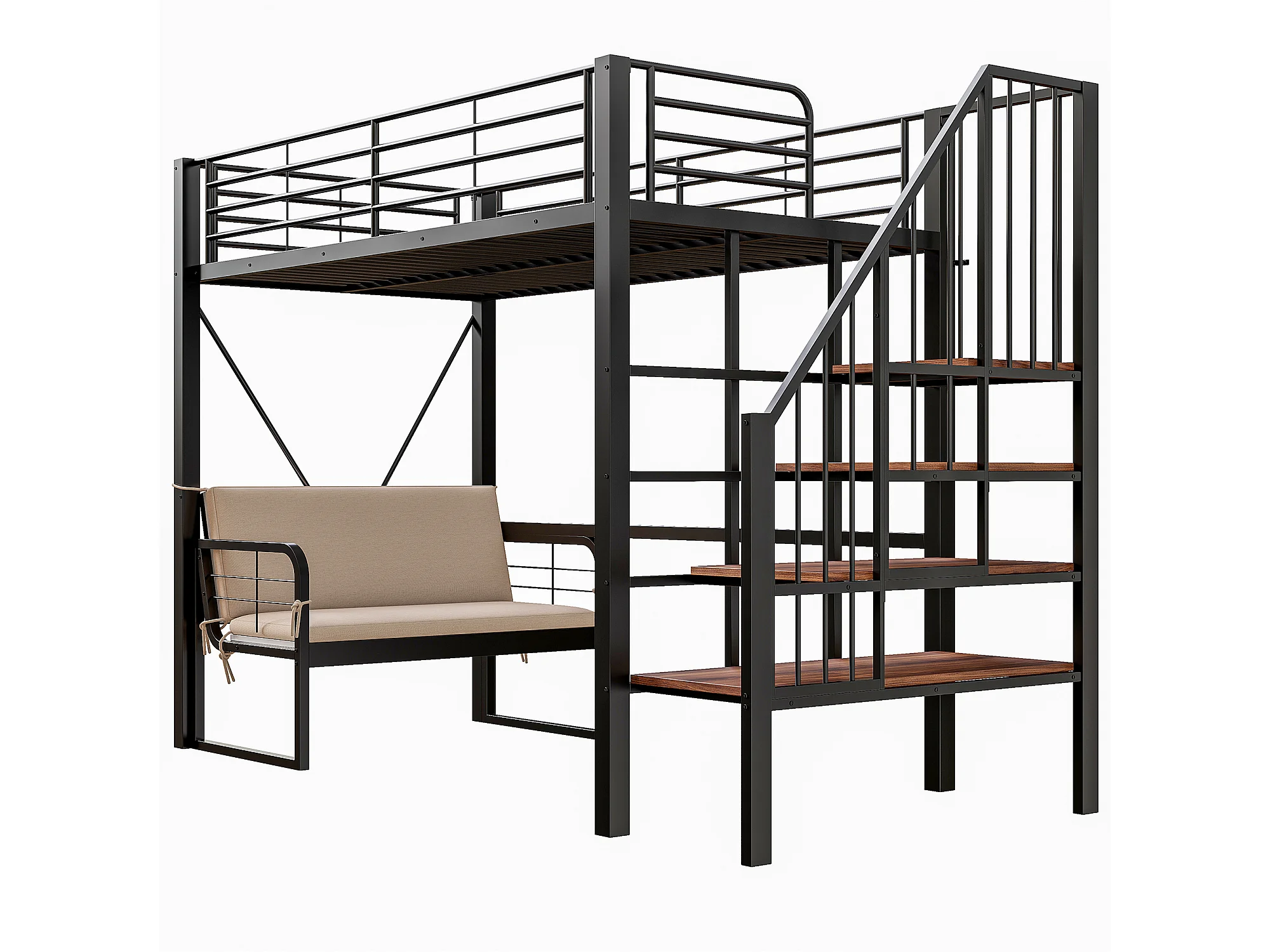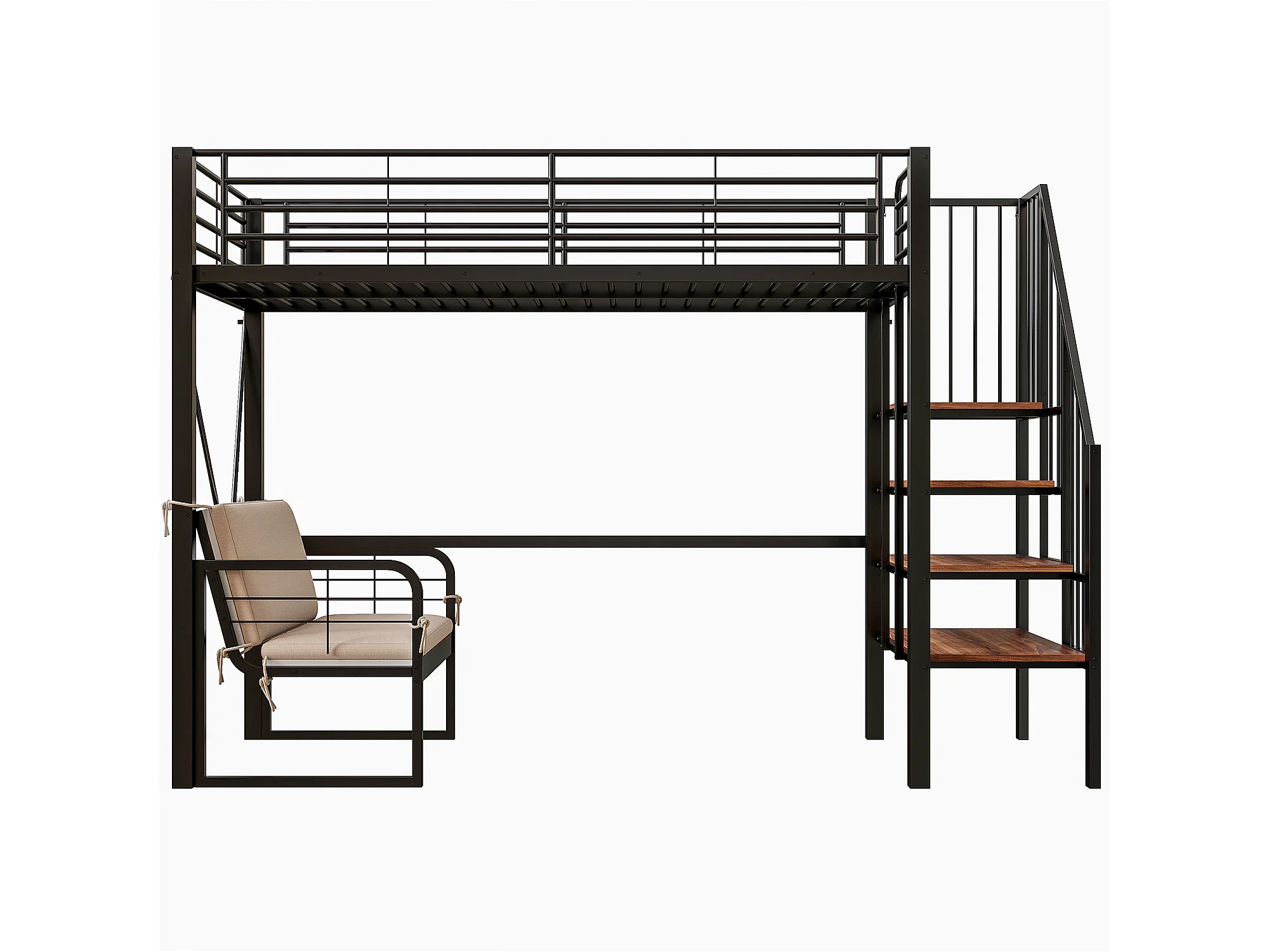 Hochbett für Kinder – 90 x 200 cm – mit abnehmbarem Sofa und Leiter mit Stauraum – Metallrahmen – schwarz