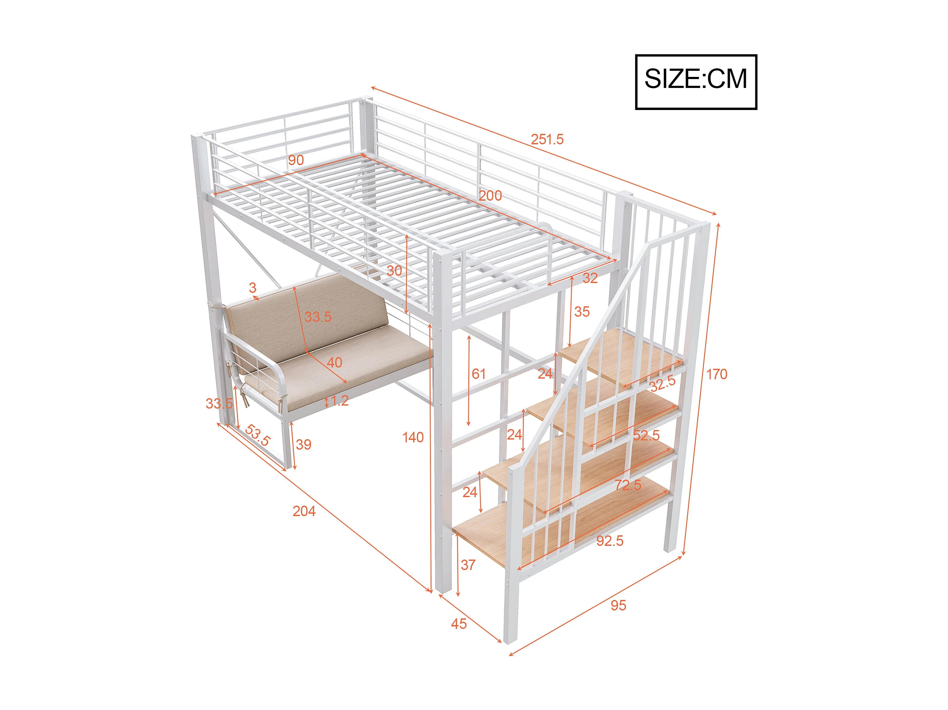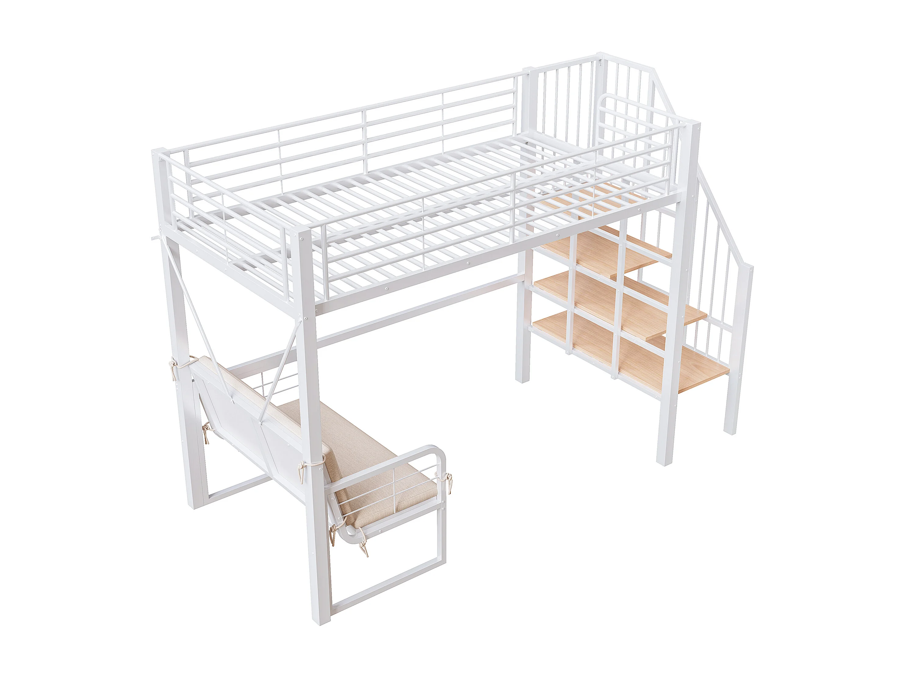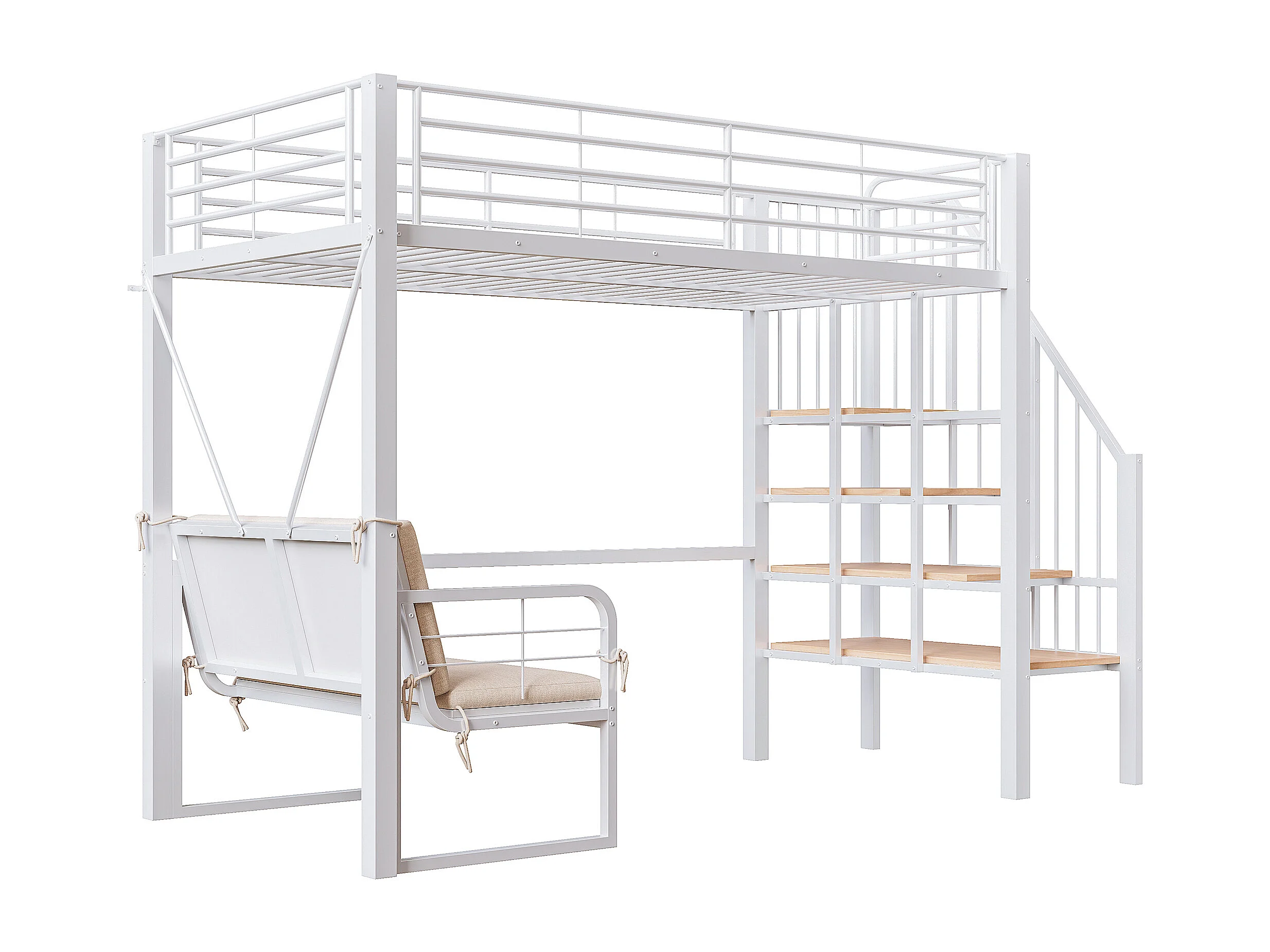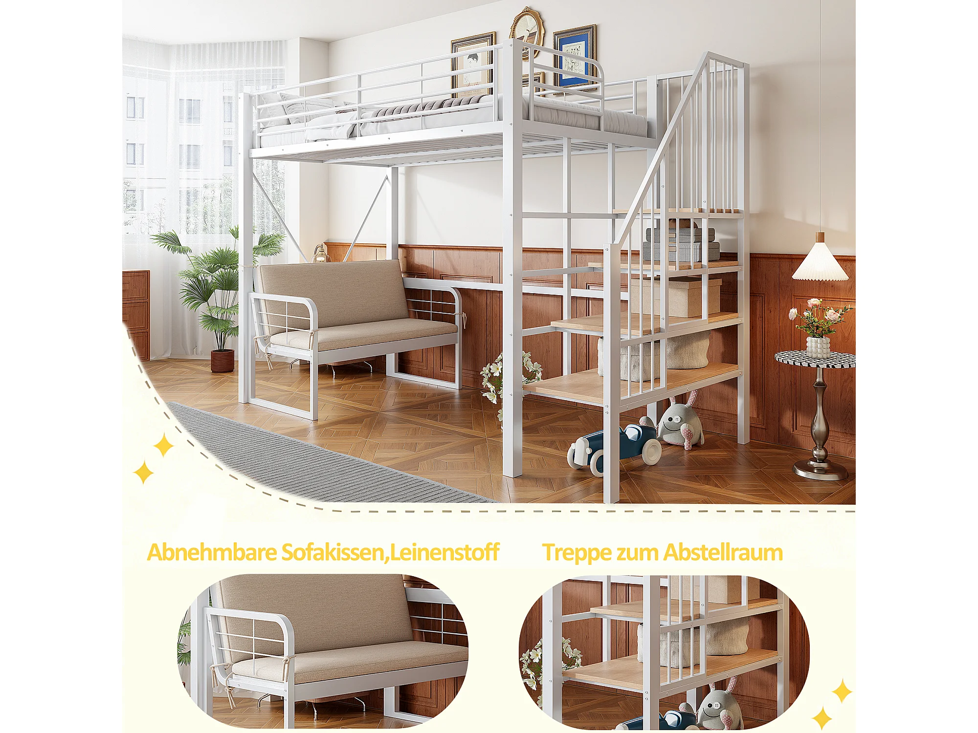 Hochbett für Kinder – 90 x 200 cm – mit abnehmbarem Sofa und Leiter mit Stauraum – Metallrahmen – weiß