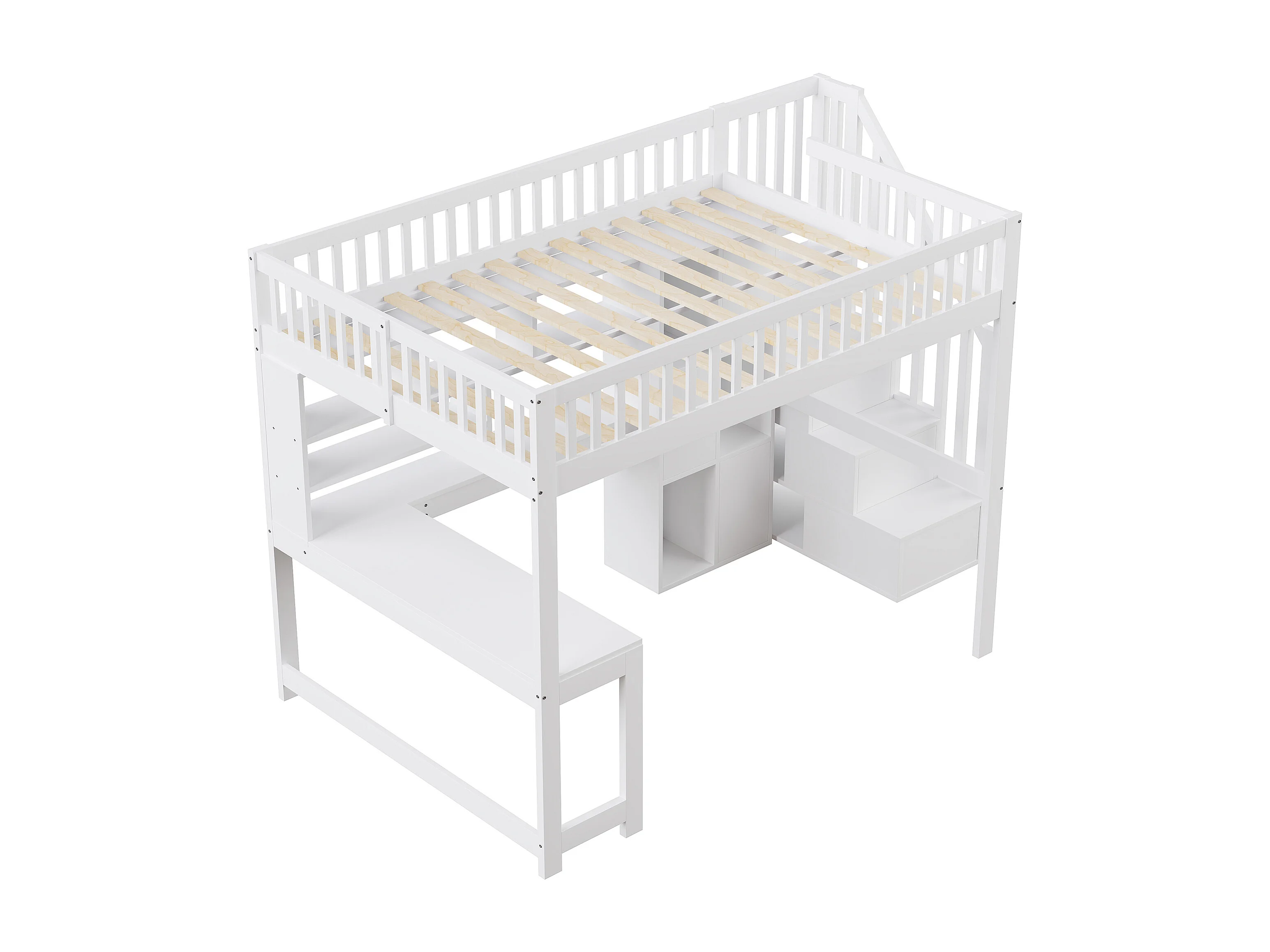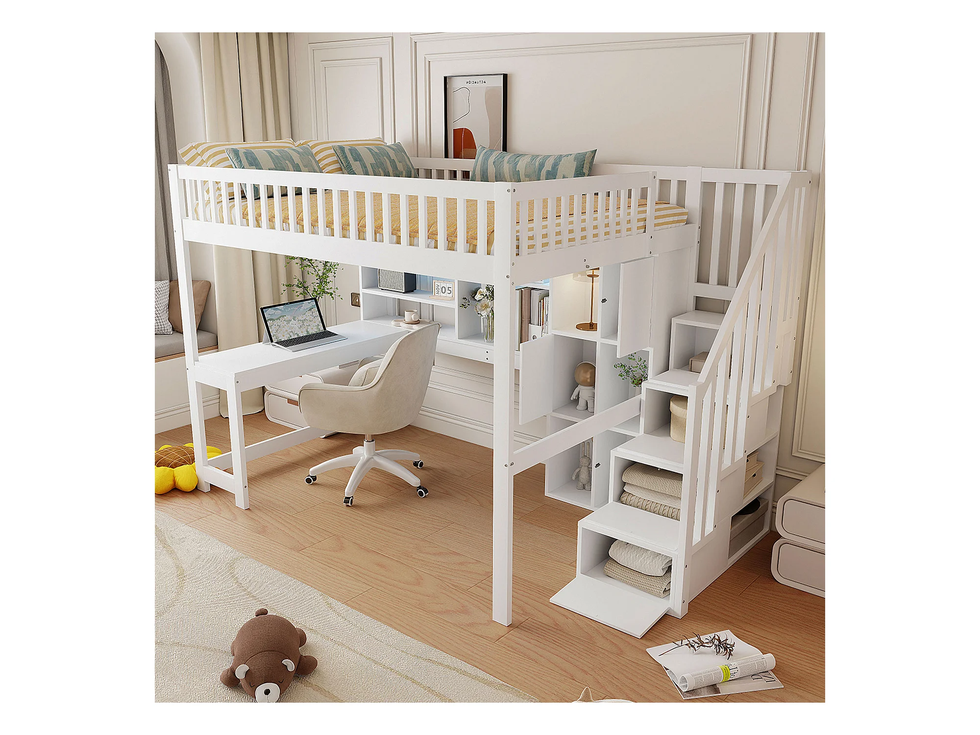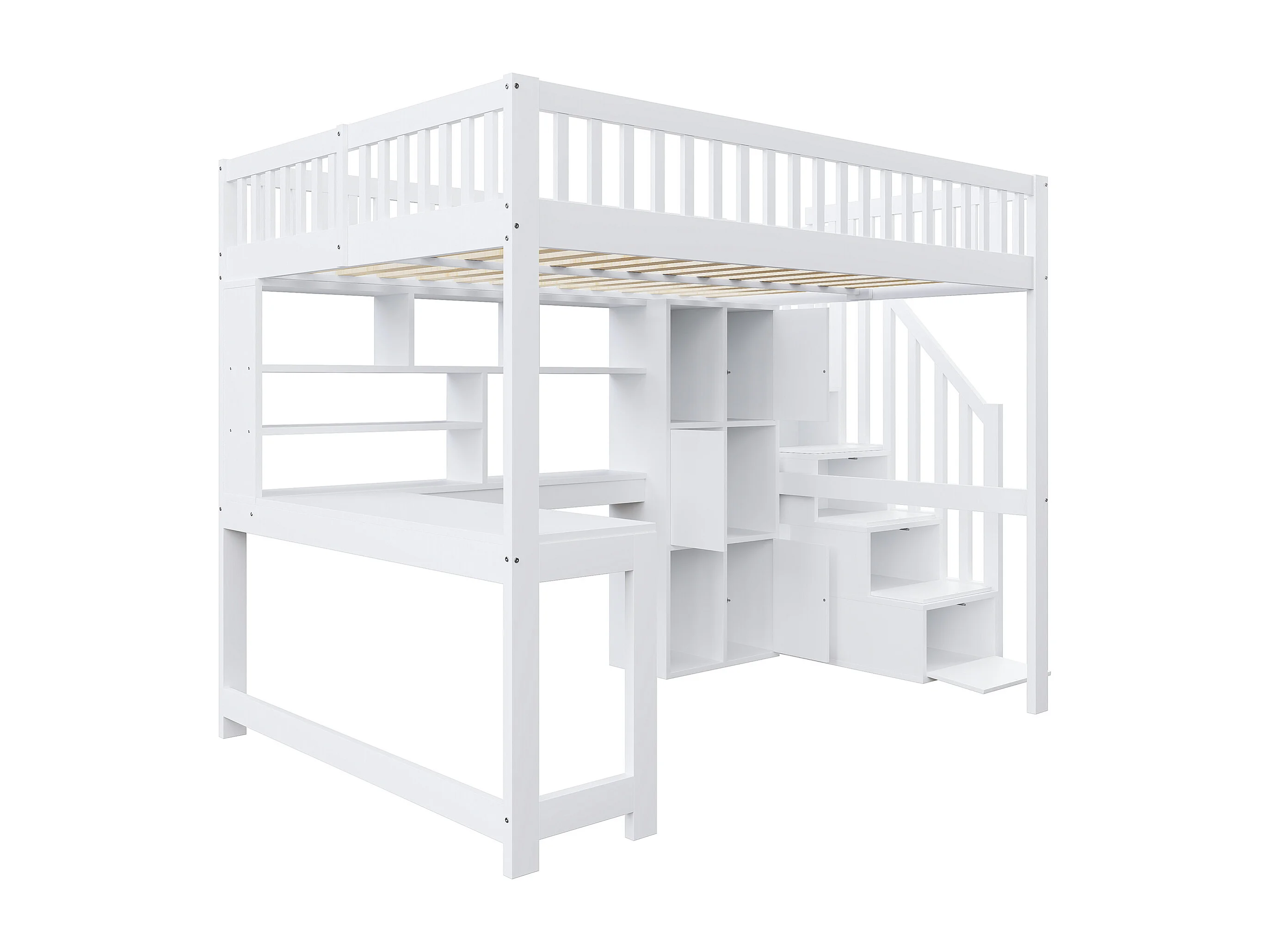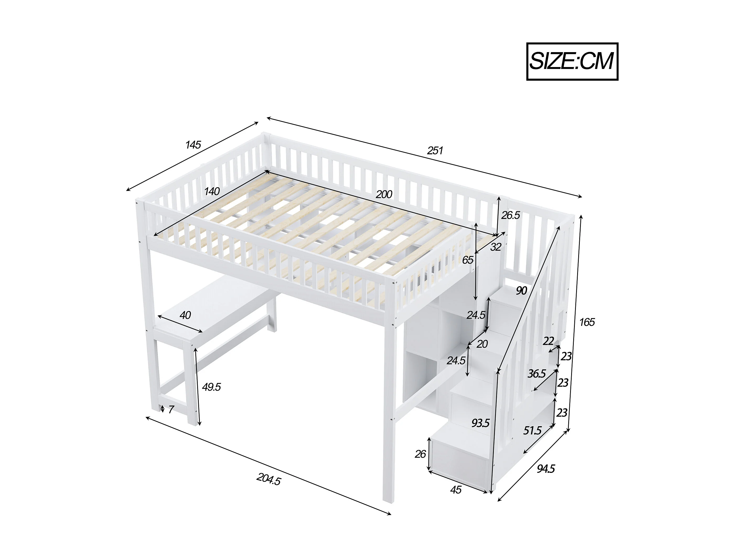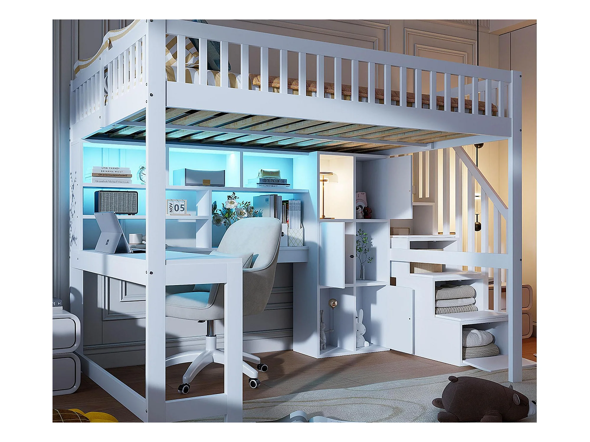 Hochbett-Kombination 140×200 cm - mit LED-Beleuchtung - Treppe mit Stauraum - mit Regalen - mit Schreibtisch - Weiß (Matratze nicht inbegriffen)