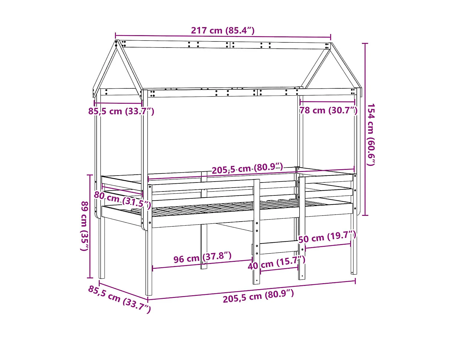 Hochbett mit Dach 80x200 cm Massivholz Kiefer