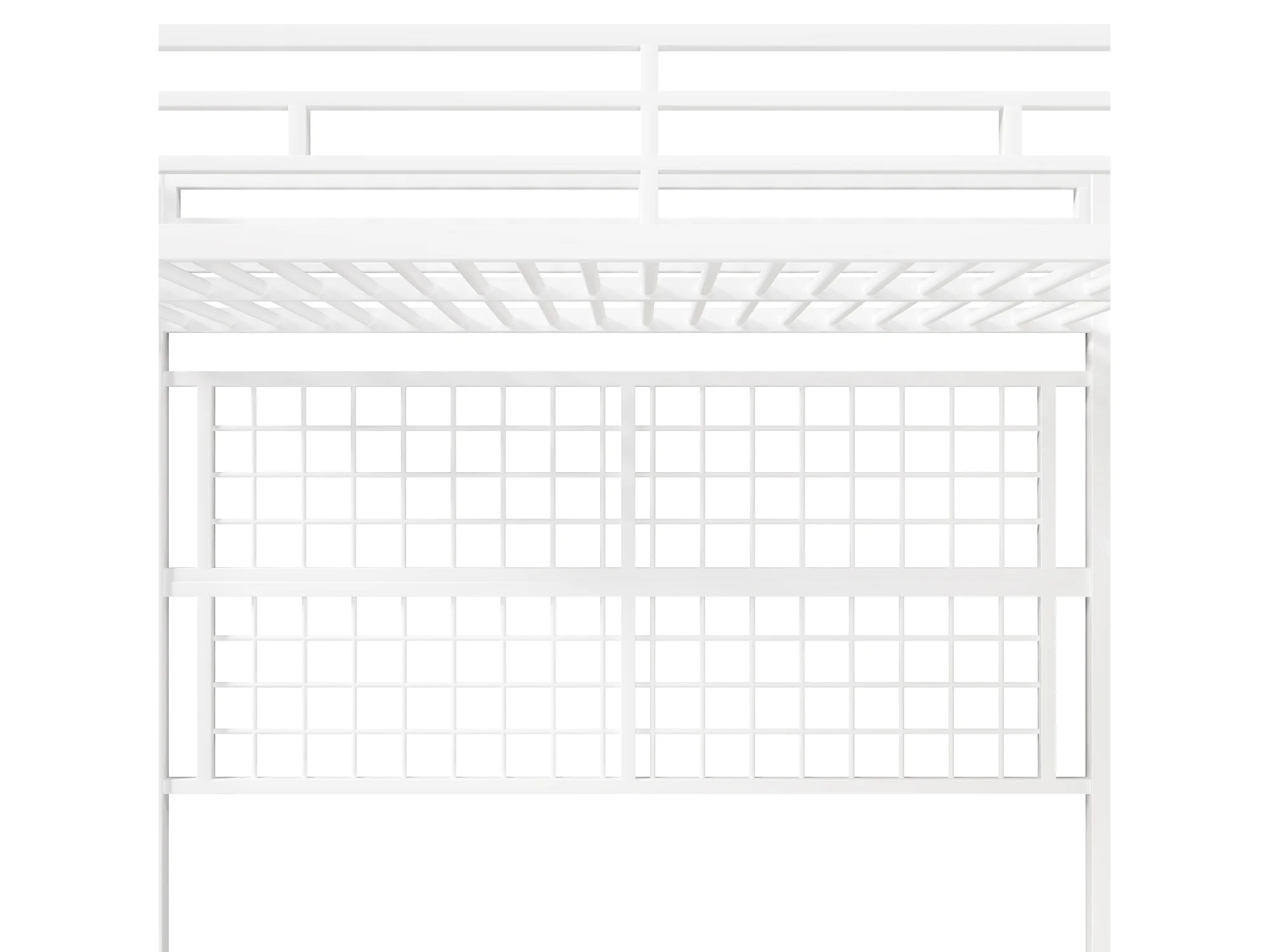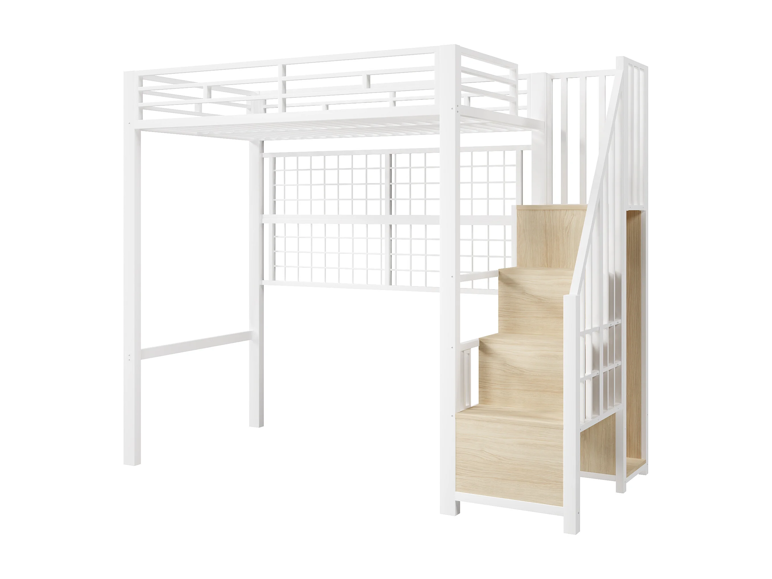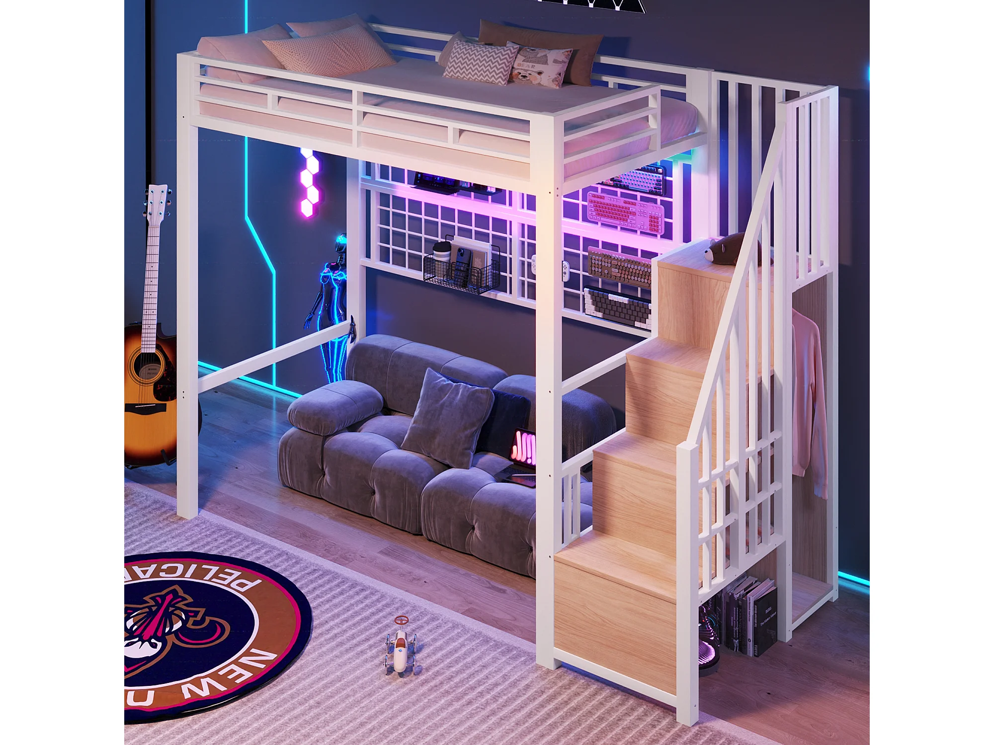 Hochbett mit Eisenrahmen – 90 x 200 cm – mit Kleiderschrank, Leiter mit Stauraum und LED-Beleuchtung – Metall + MDF – weiß