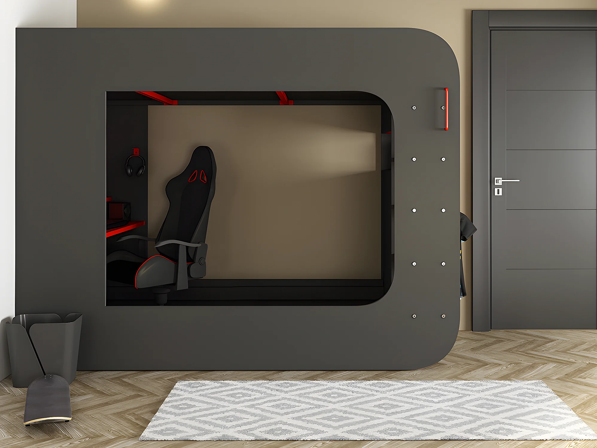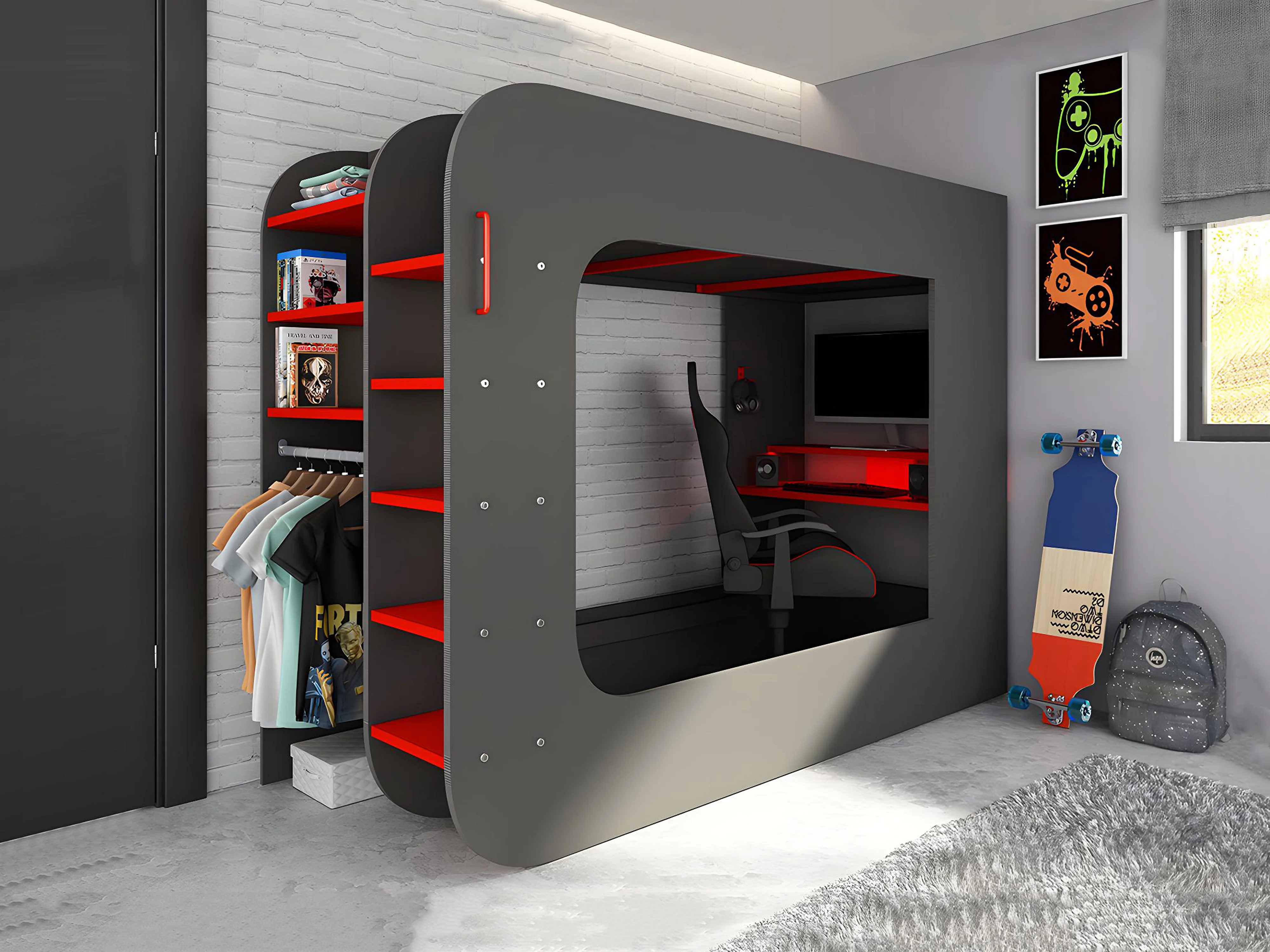 Hochbett mit Gaming-Schreibtisch & Stauraum + LEDs - 90 x 200 cm - Anthrazit & Rot - WARRIOR