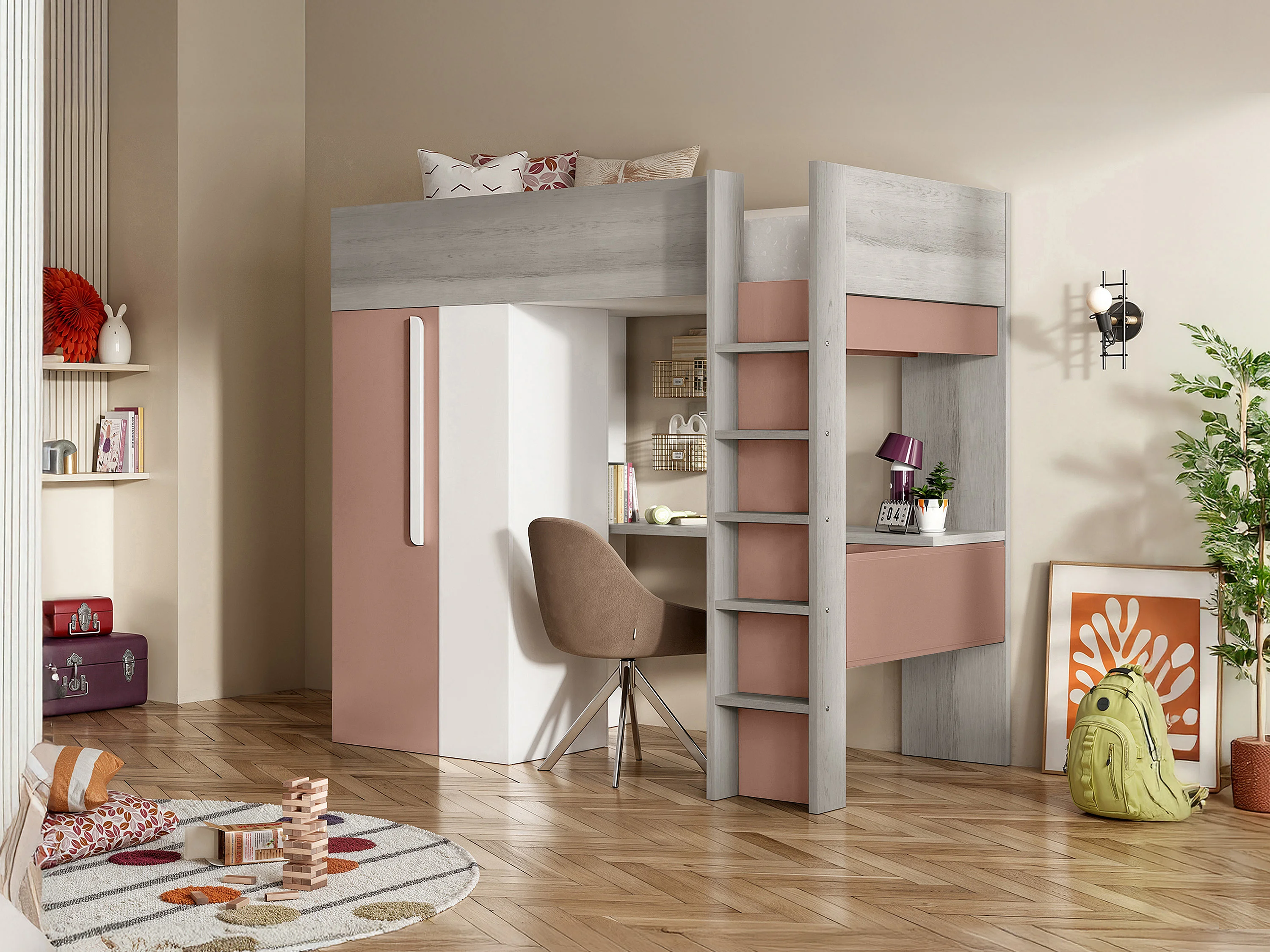 Hochbett mit Schreibtisch & Kleiderschrank - 90 x 200 cm - Rosa & Weiß - NICOLAS