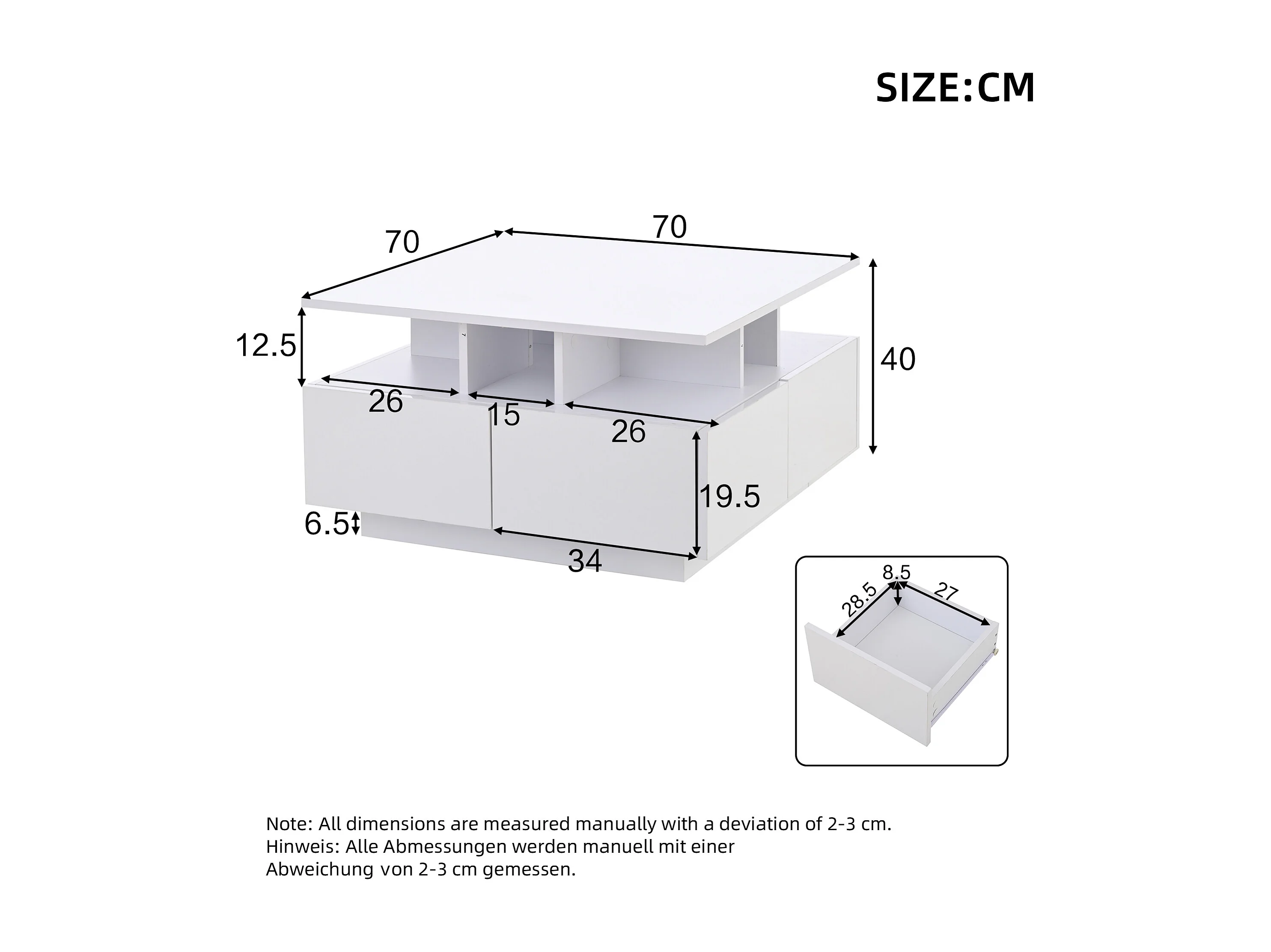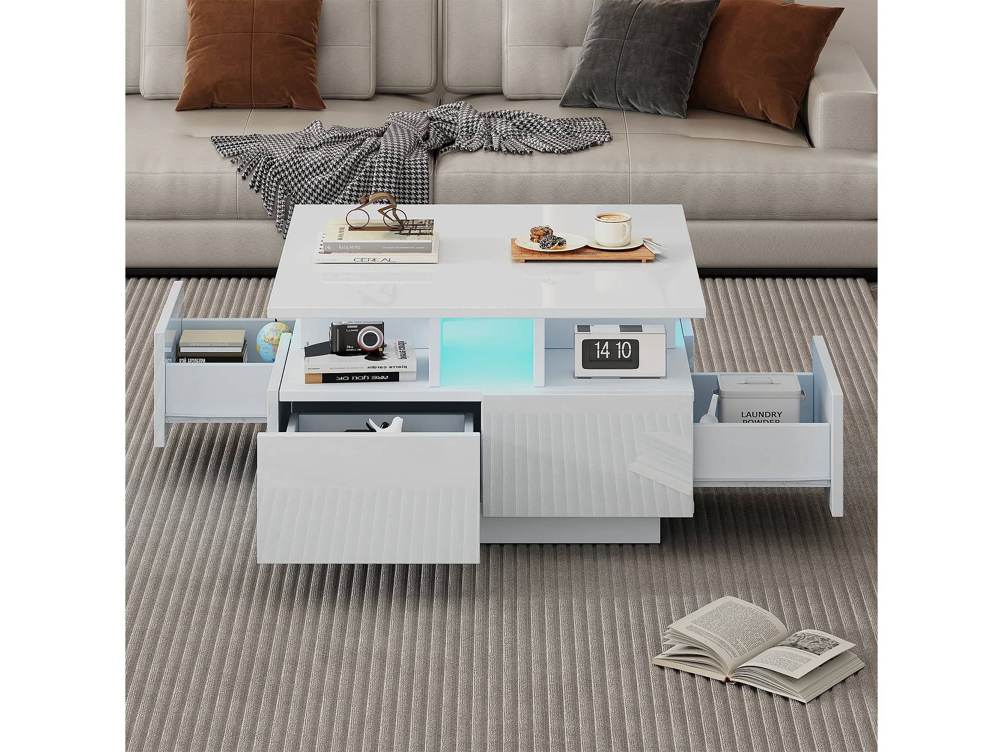 Hochglanz Quadrat-Couchtisch 70×70×40 cm - mit LED-Beleuchtung - 4 Schubladen - weiß