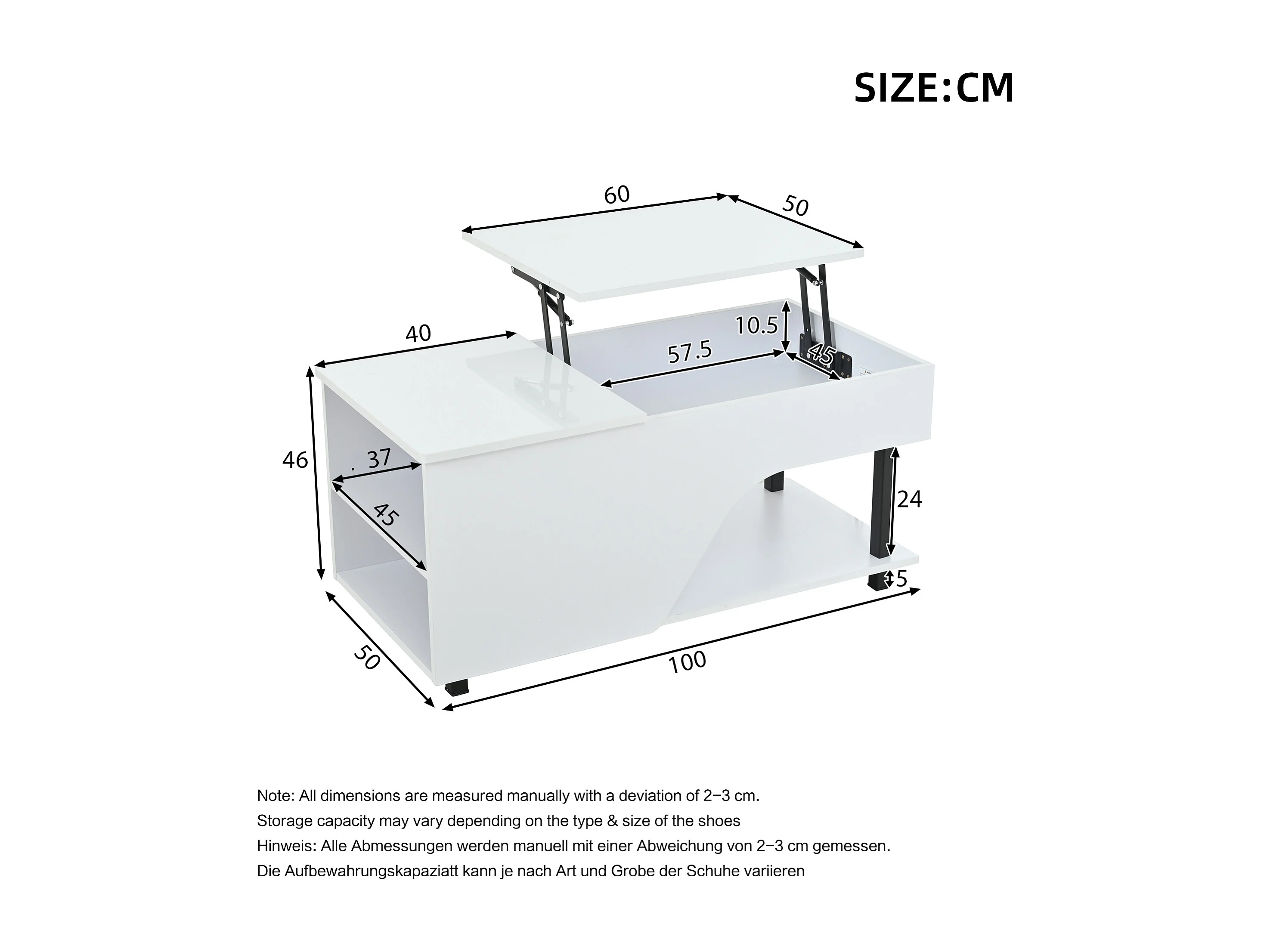 Hochglanzlackierter Couchtisch mit Hubfunktion – 100 x 50 x 46 cm – mit integriertem Stauraum, LED-Beleuchtung und Ablage – Spanplatte – weiß