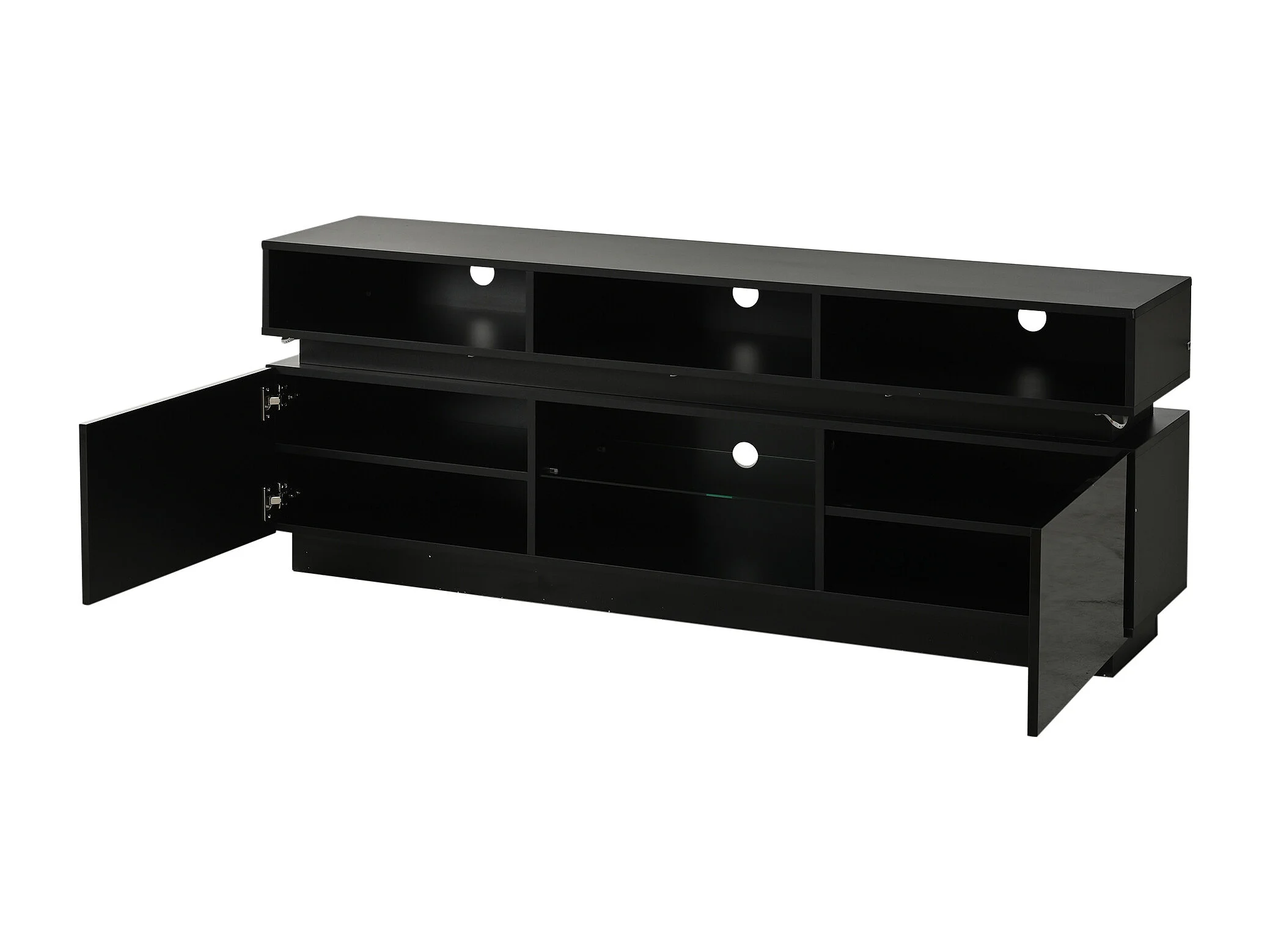 Hochglanzlackierter TV-Ständer fürs Wohnzimmer – 160 x 35 x 60 cm – mit Ablage aus Sicherheitsglas, LED-Beleuchtung und Türen – MDF – schwarz