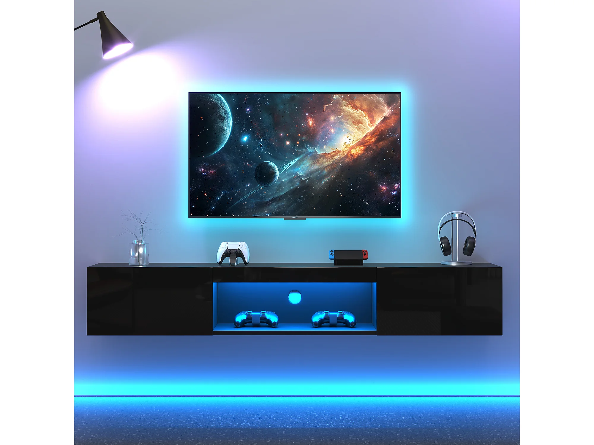 Hochglanzlackiertes, wandmontiertes TV-Möbel – 160 x 31 x 22 cm – mit LED-Beleuchtung und 2 Türen – für 70-Zoll-Fernseher – MDF + Spanplatte – schwarz