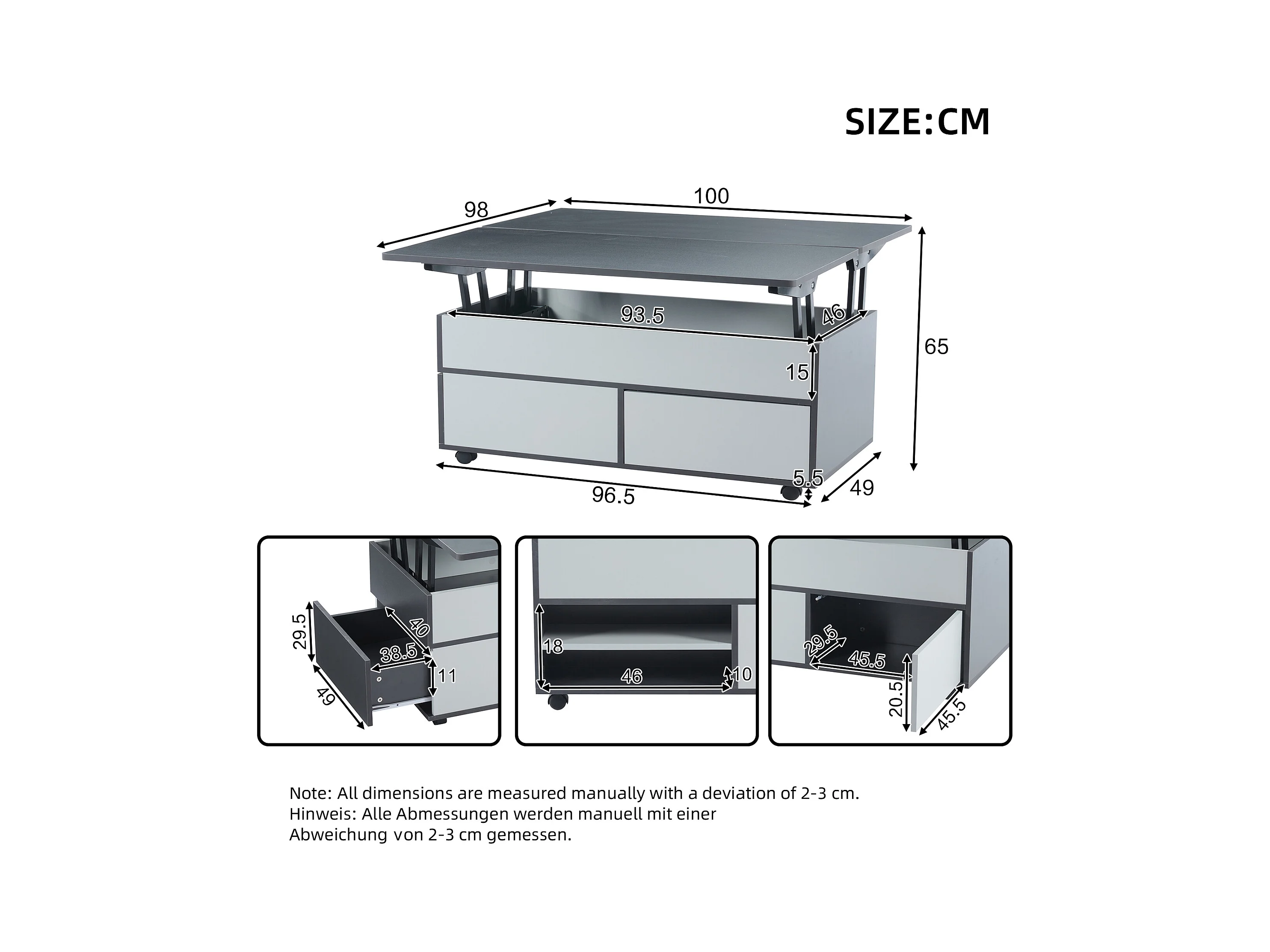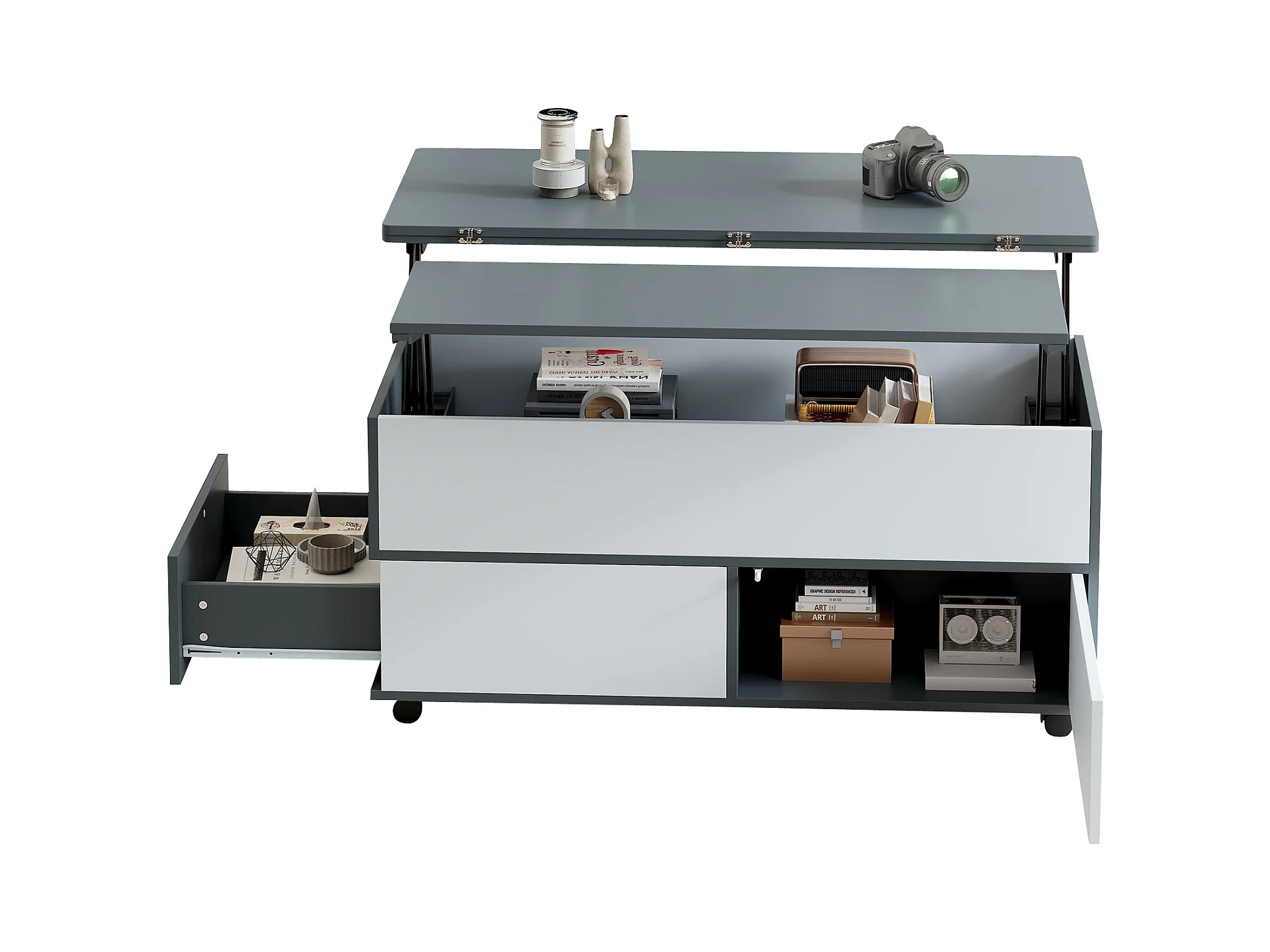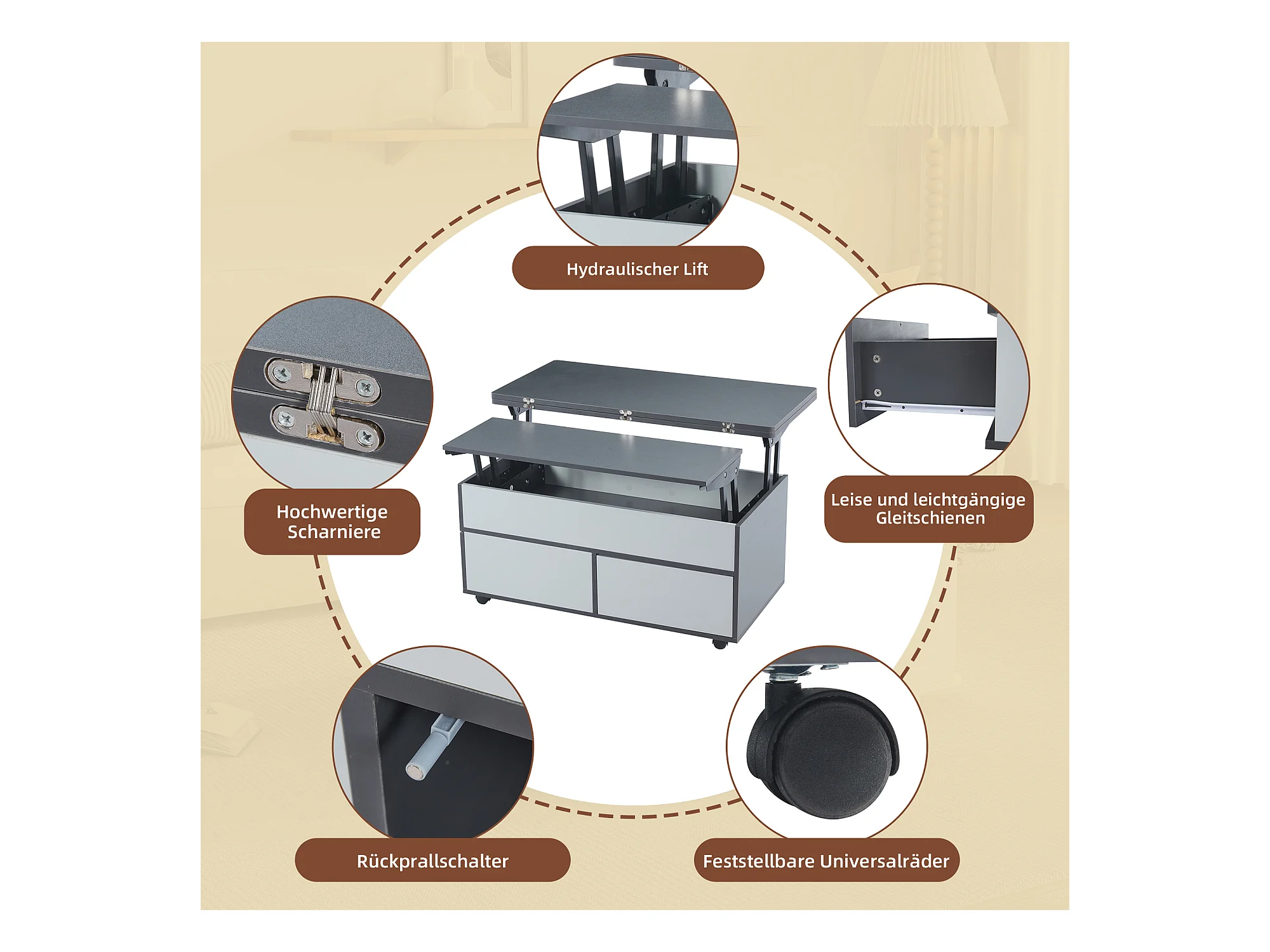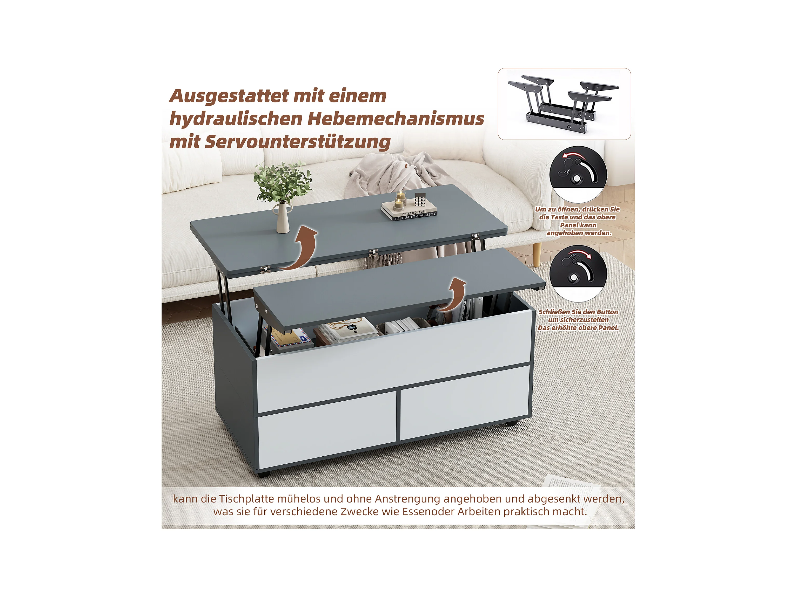 Hochklappbarer Couchtisch – 100 x 98 x 65 cm – mit Stauraum + verstecktem Regal + 1 Schublade – Spanplatte – grau