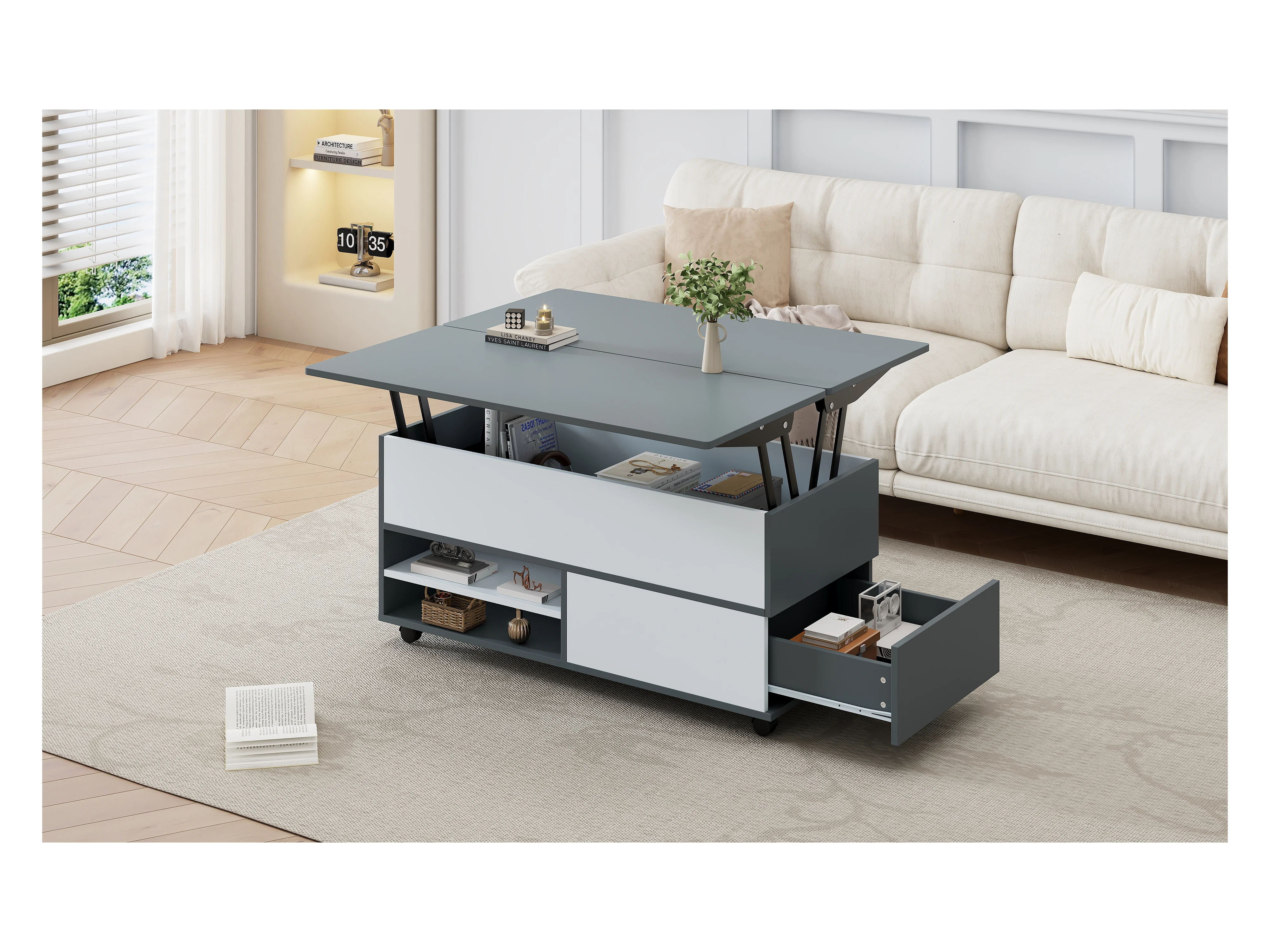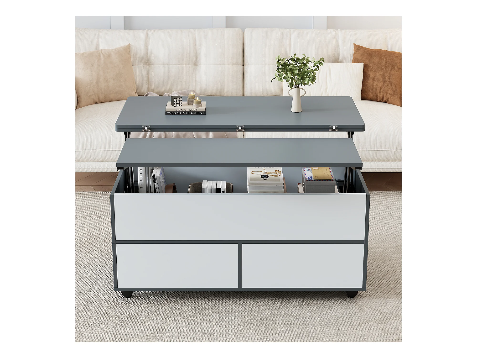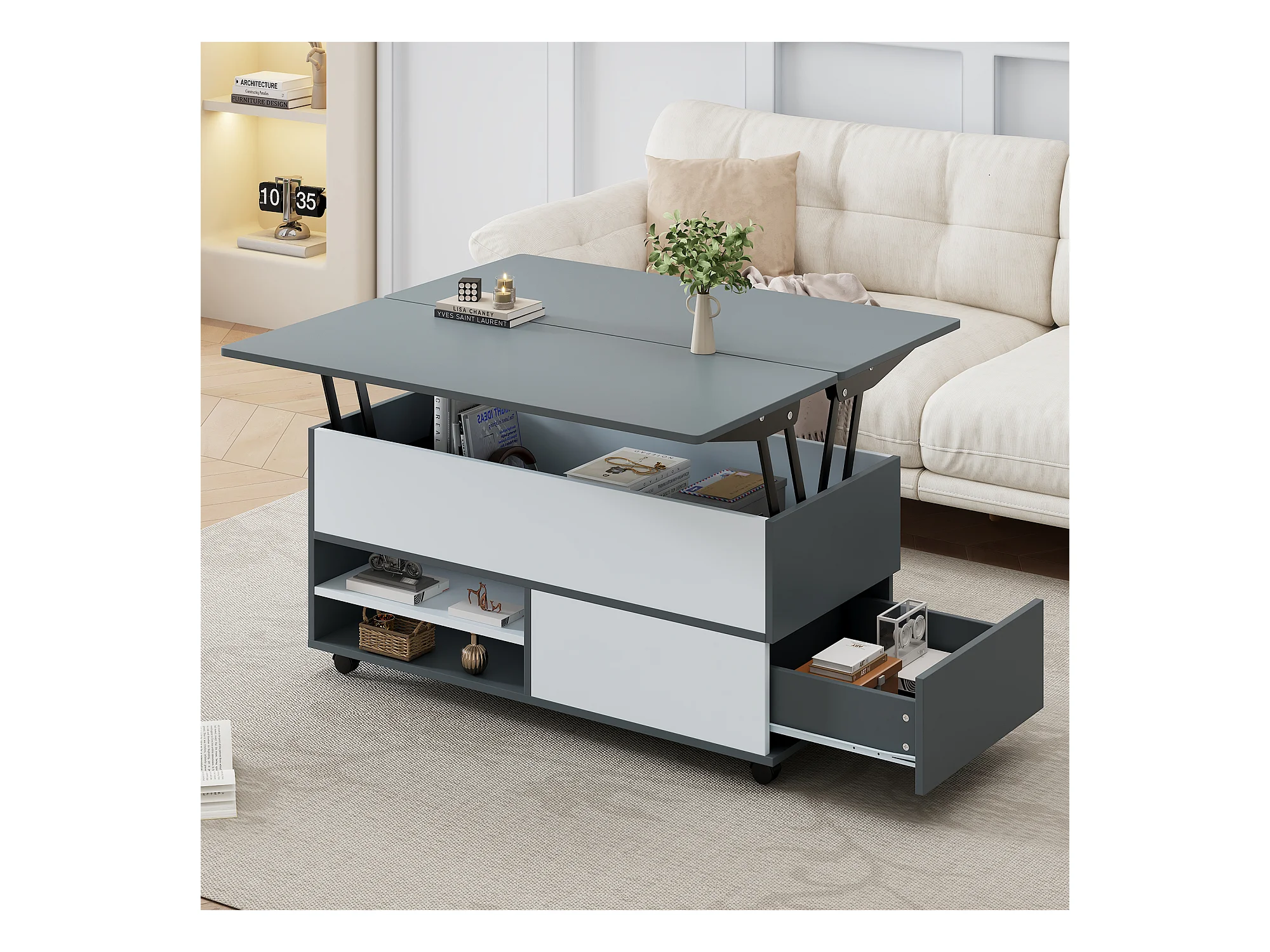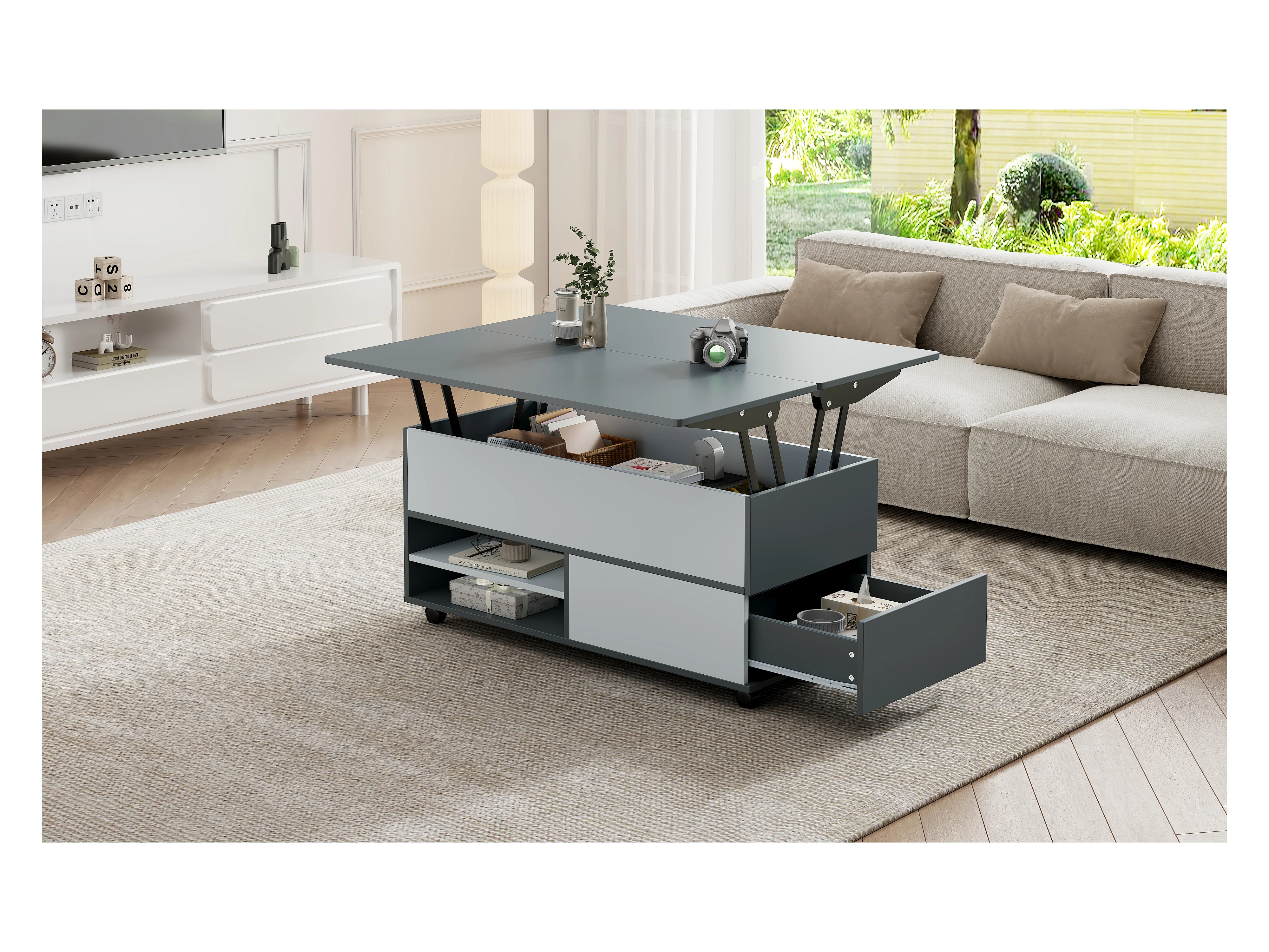 Hochklappbarer Couchtisch – 100 x 98 x 65 cm – mit Stauraum + verstecktem Regal + 1 Schublade – Spanplatte – grau