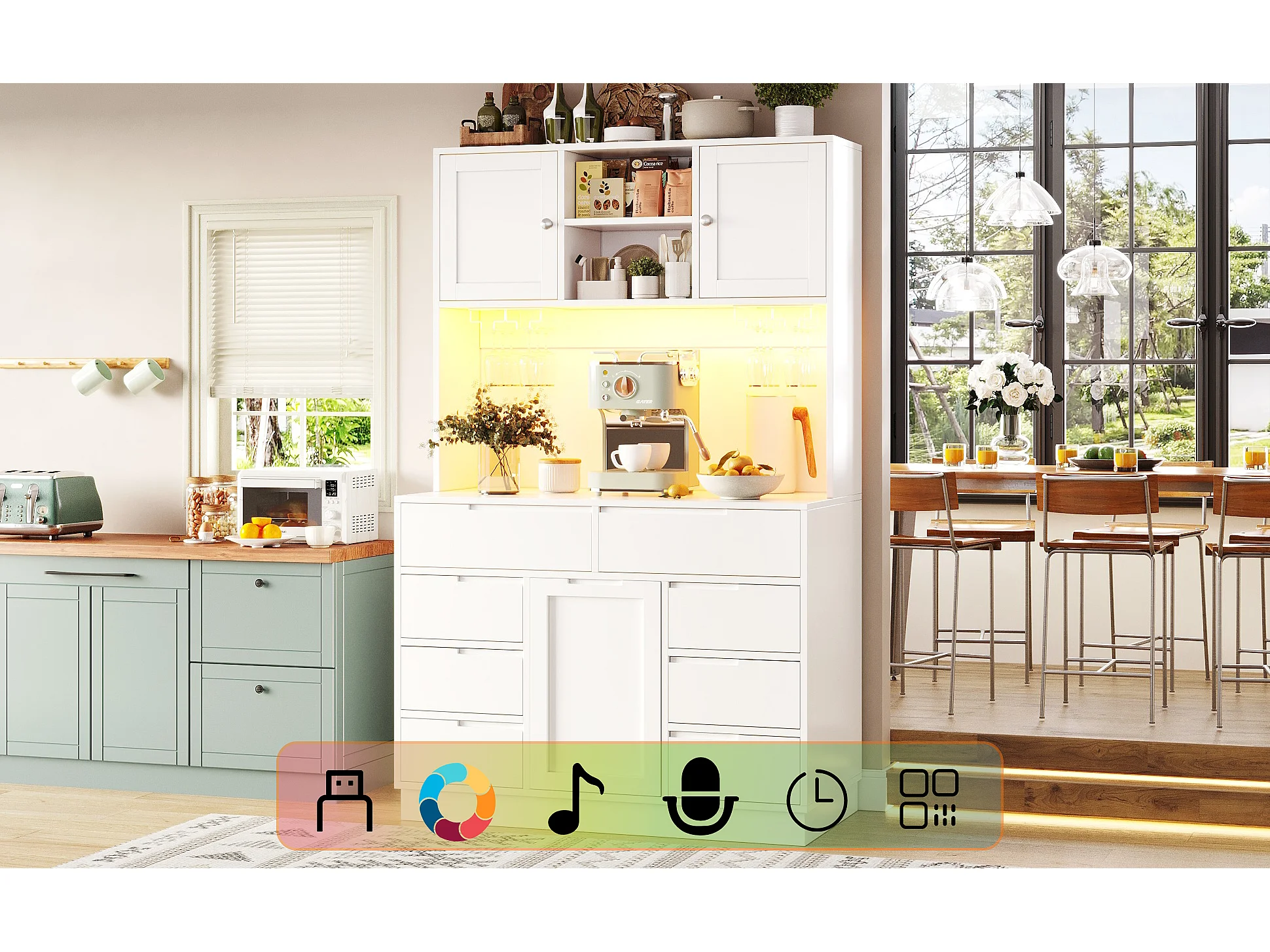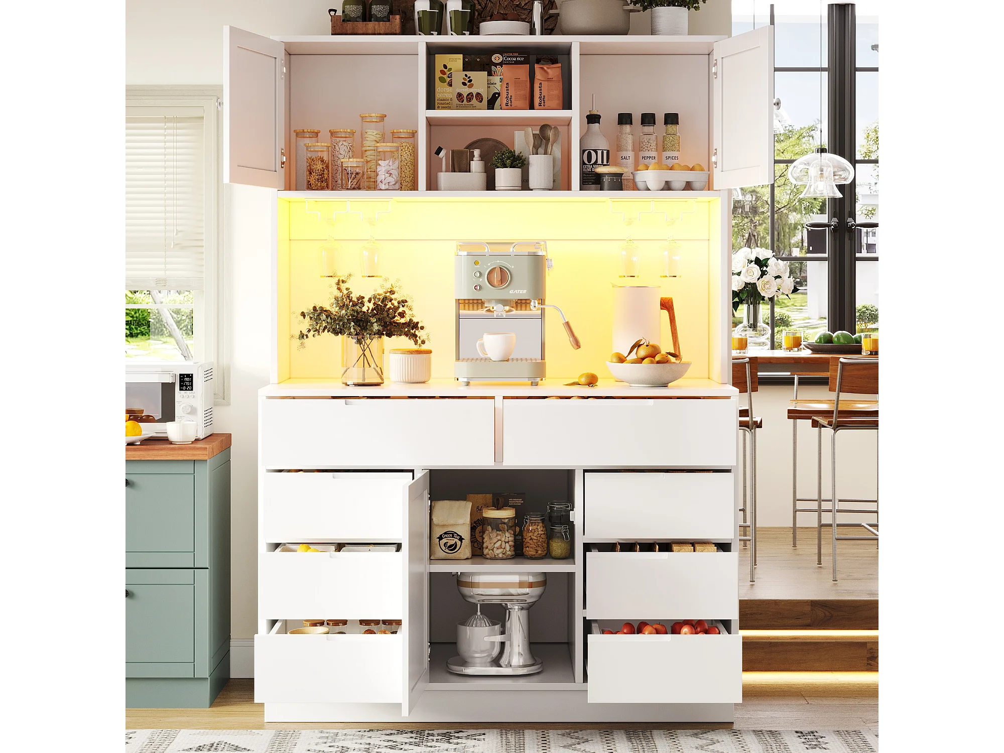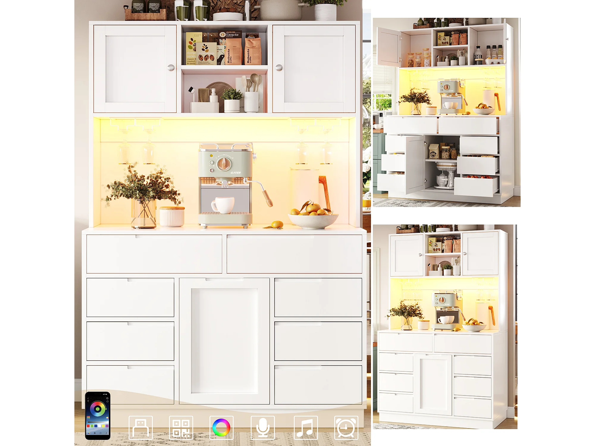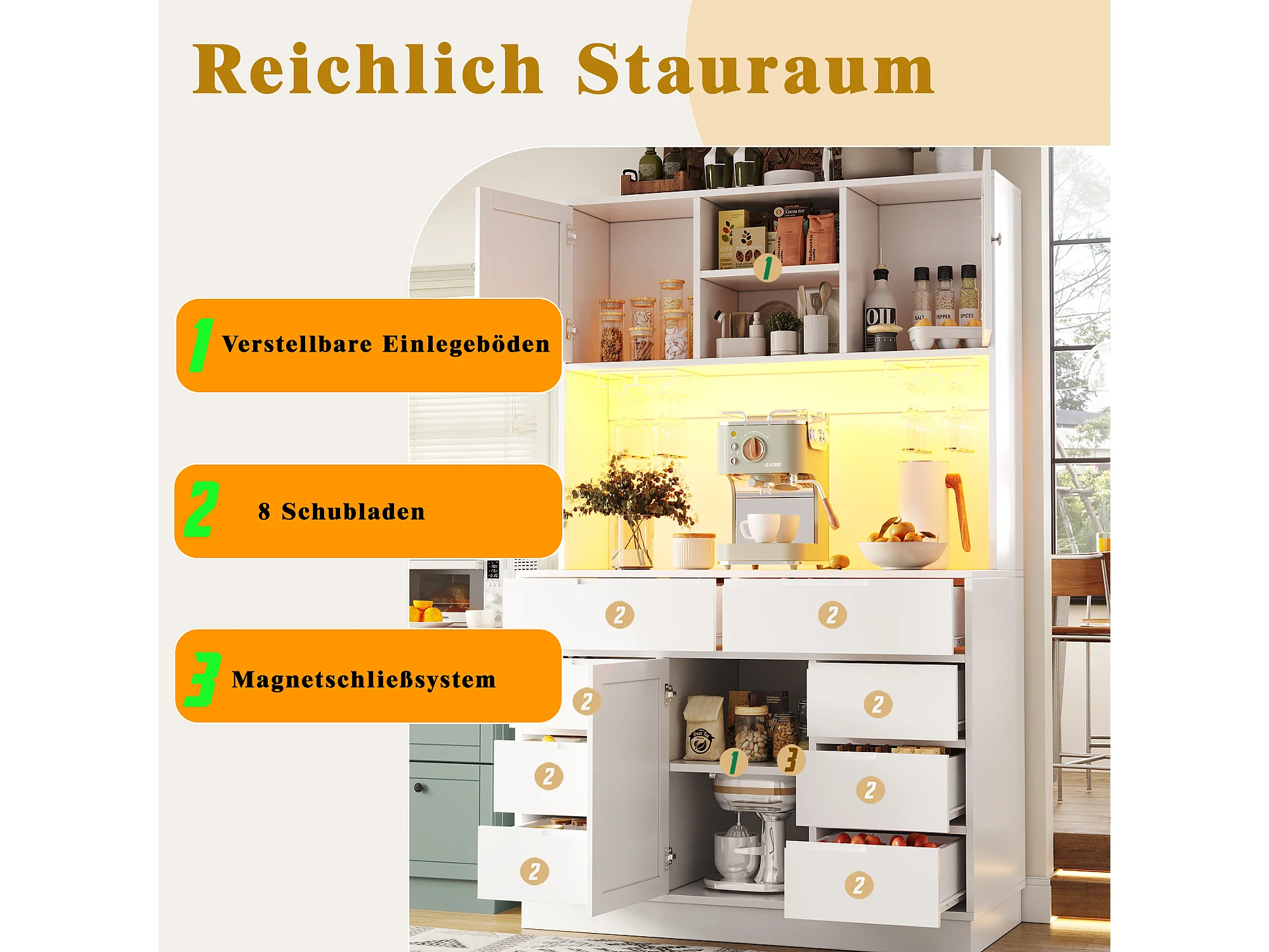 Hohes Küchen-Sideboard – 120 x 40 x 183,5 cm – mit LED-Beleuchtung, USB-Anschluss, Magnettüren und 8 Schubladen – MDF – weiß