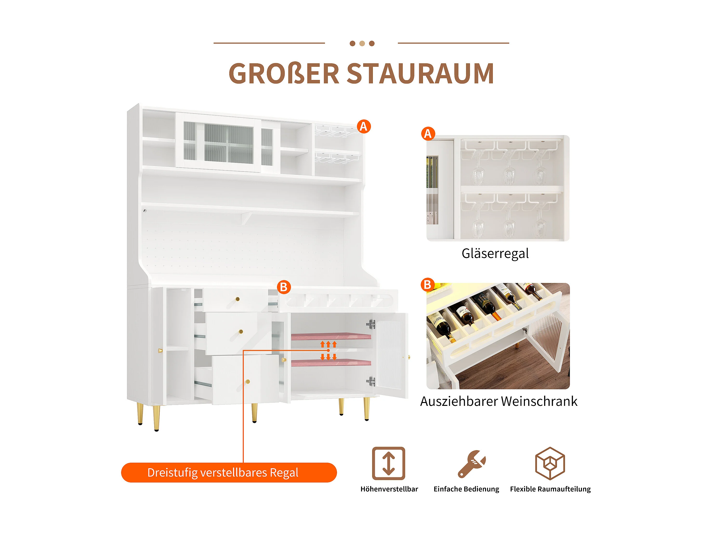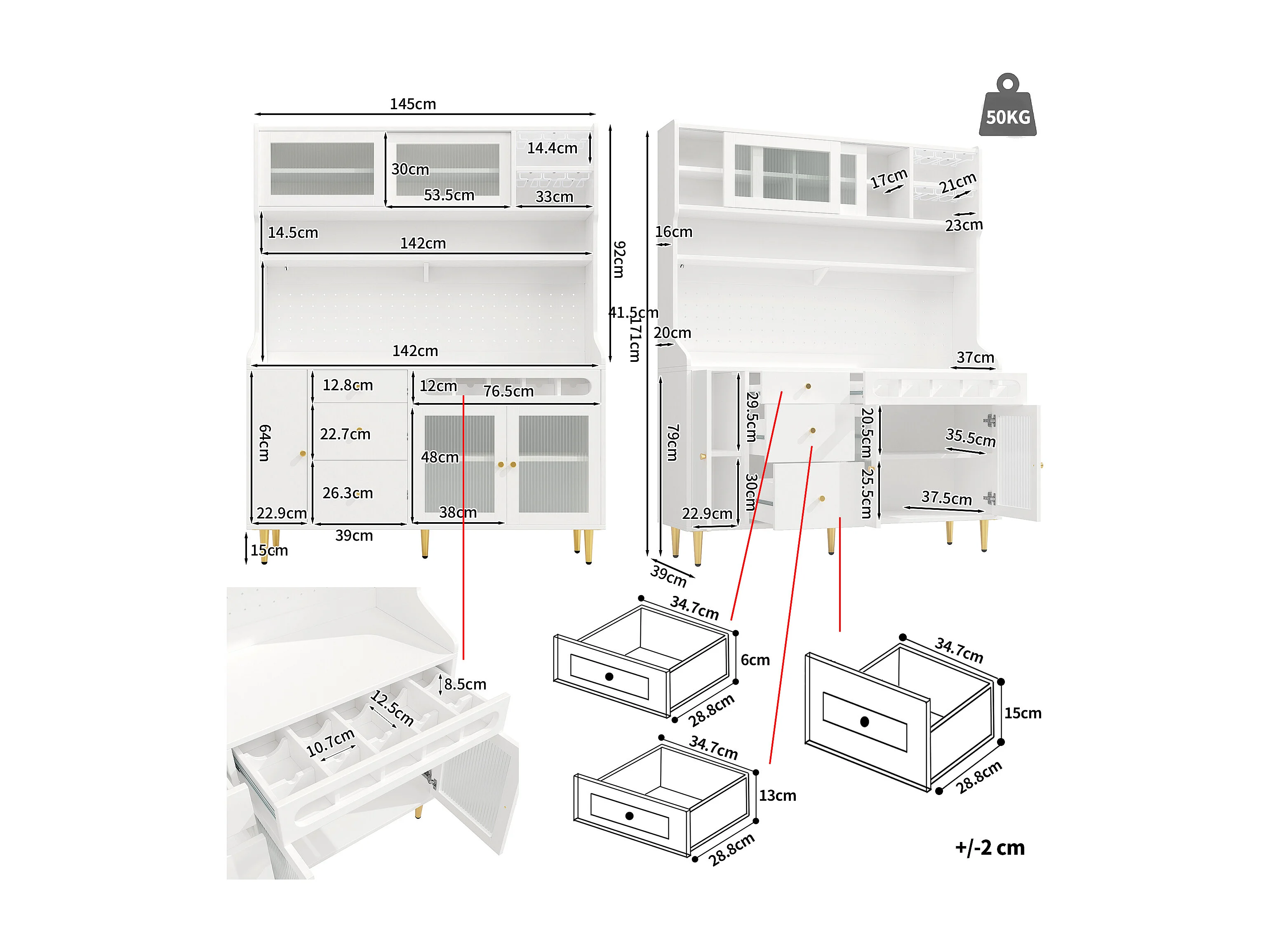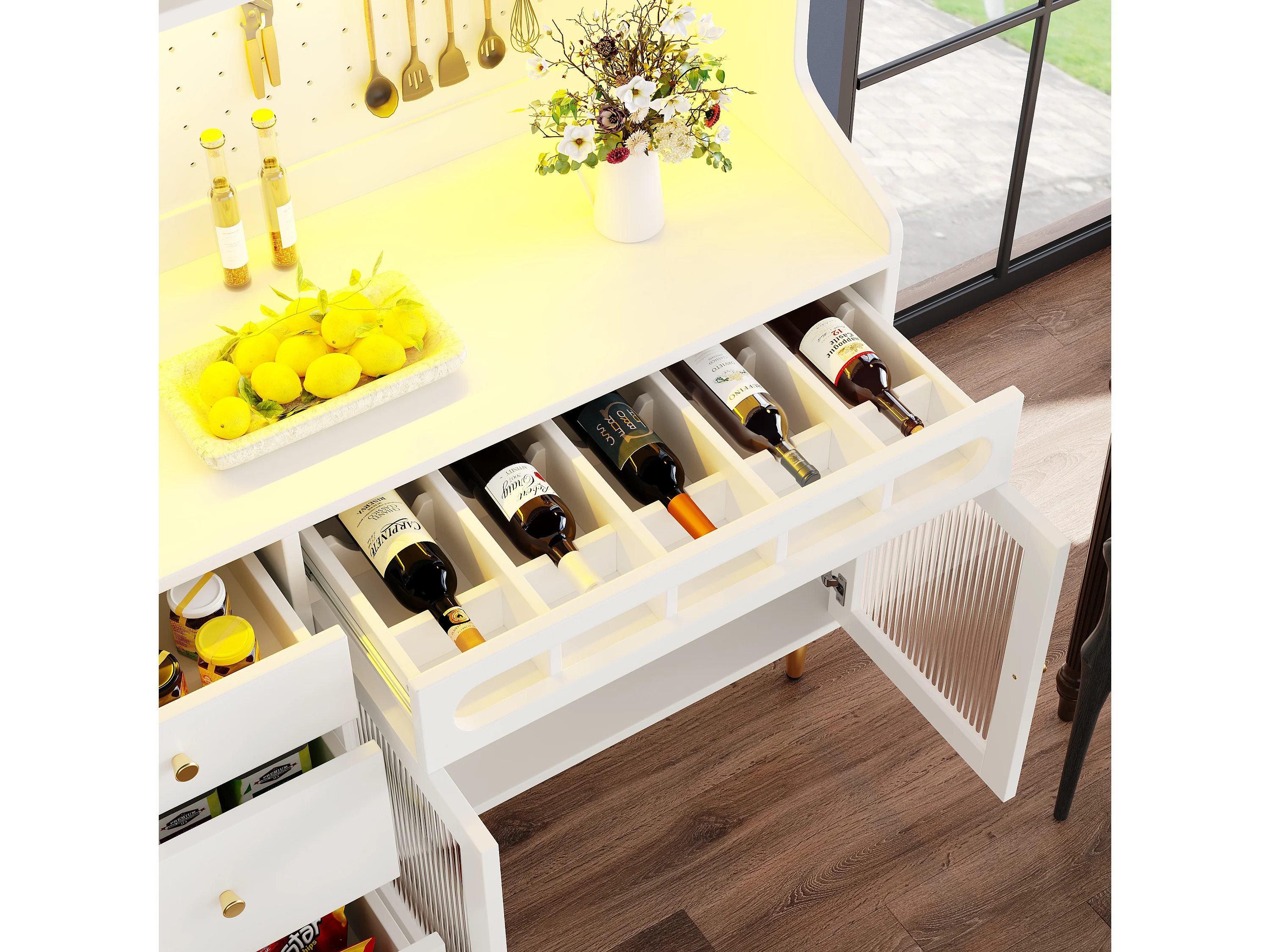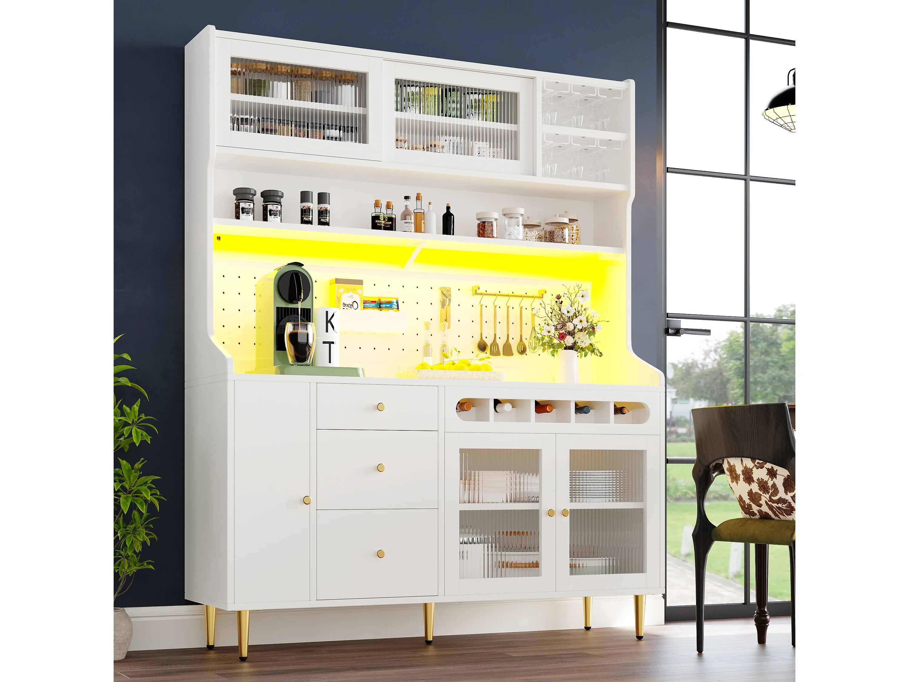 Hohes Küchen-Sideboard – 145 x 39 x 171 cm – mit LED-Beleuchtung, Weinregal, Glastüren und 3 Schubladen – Glas + MDF – weiß