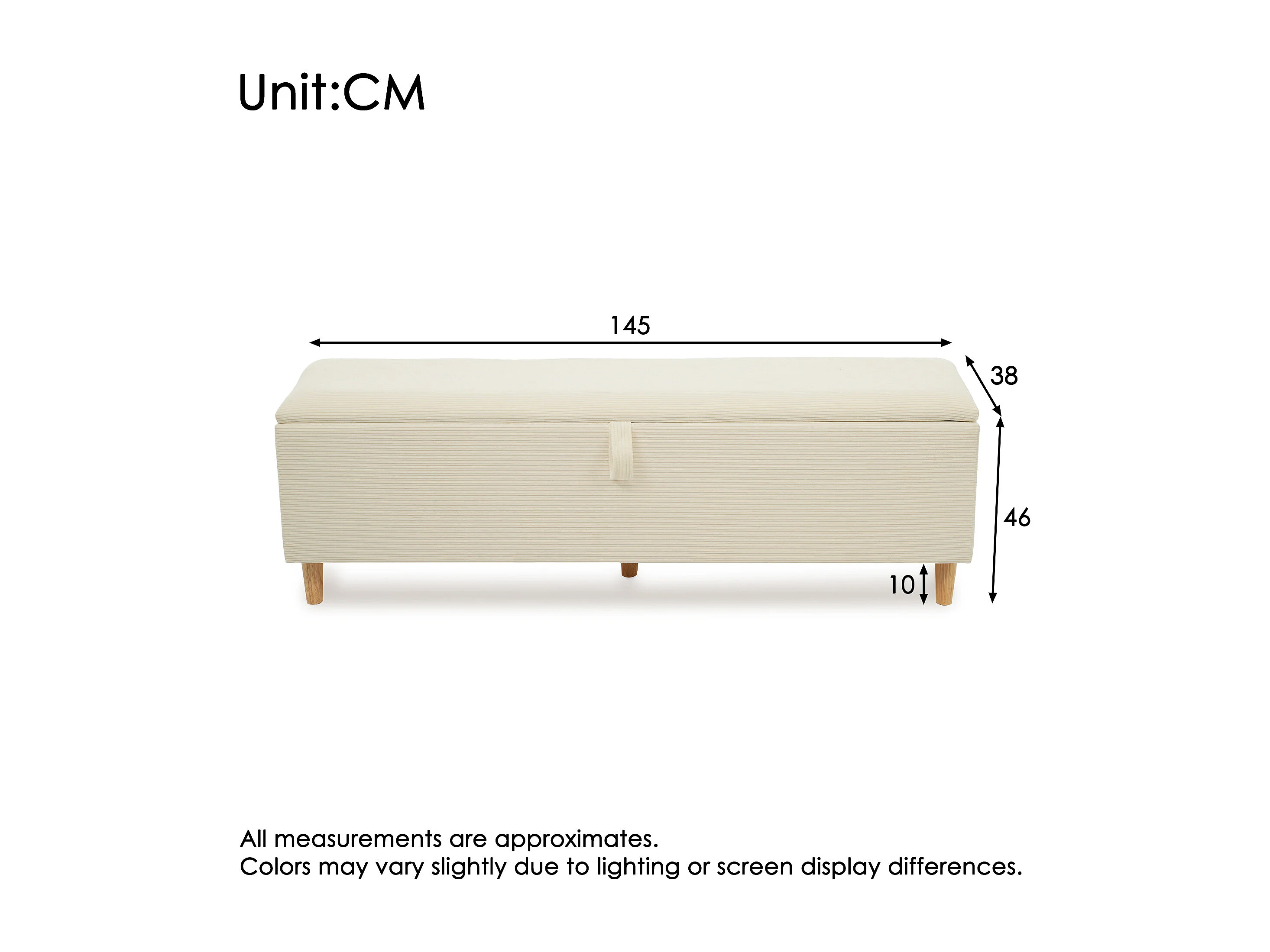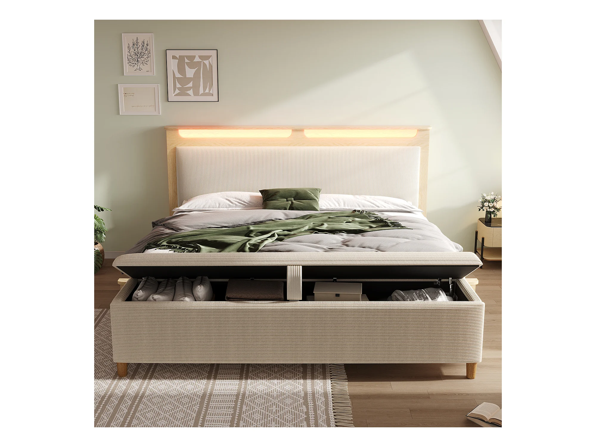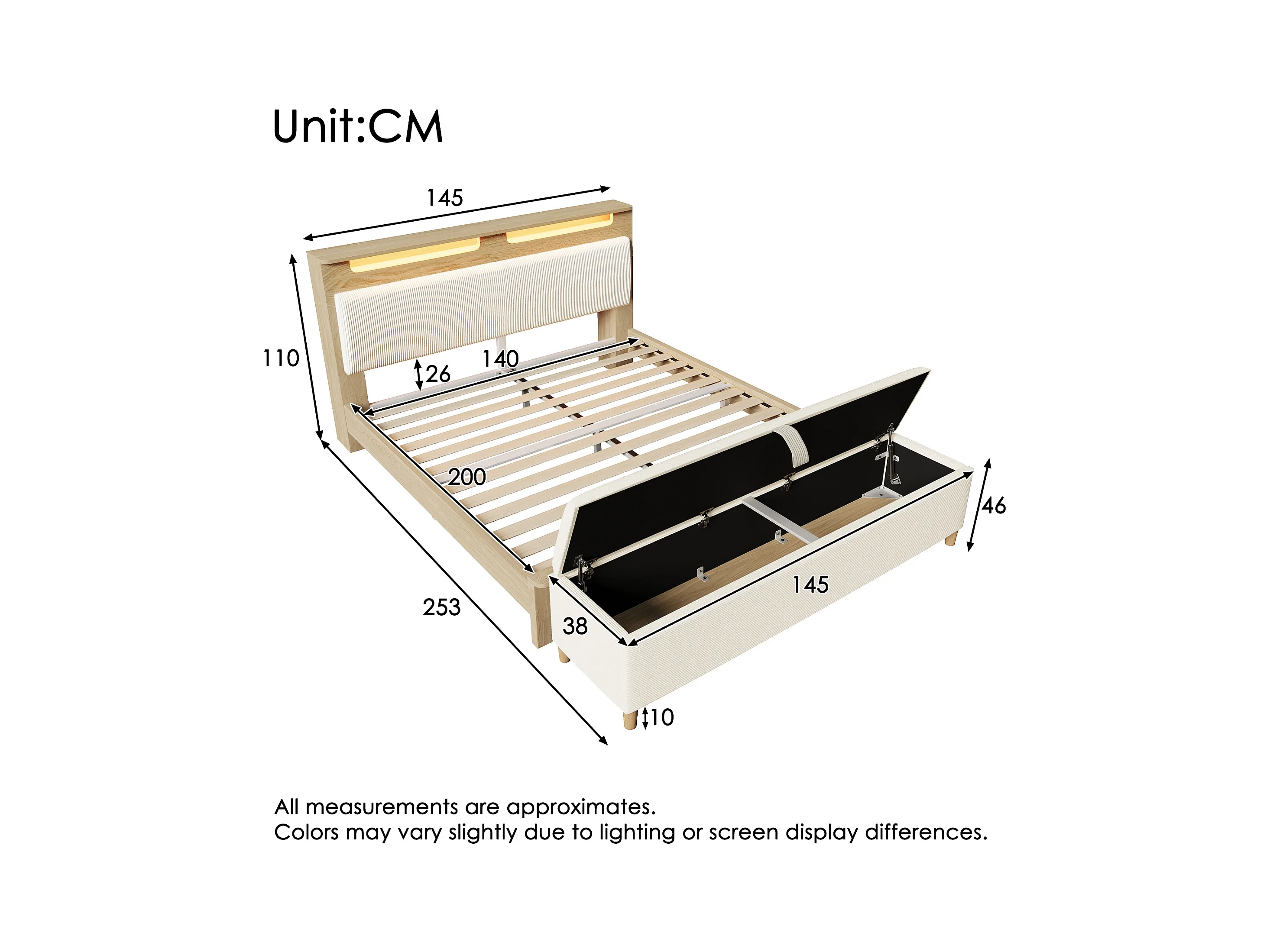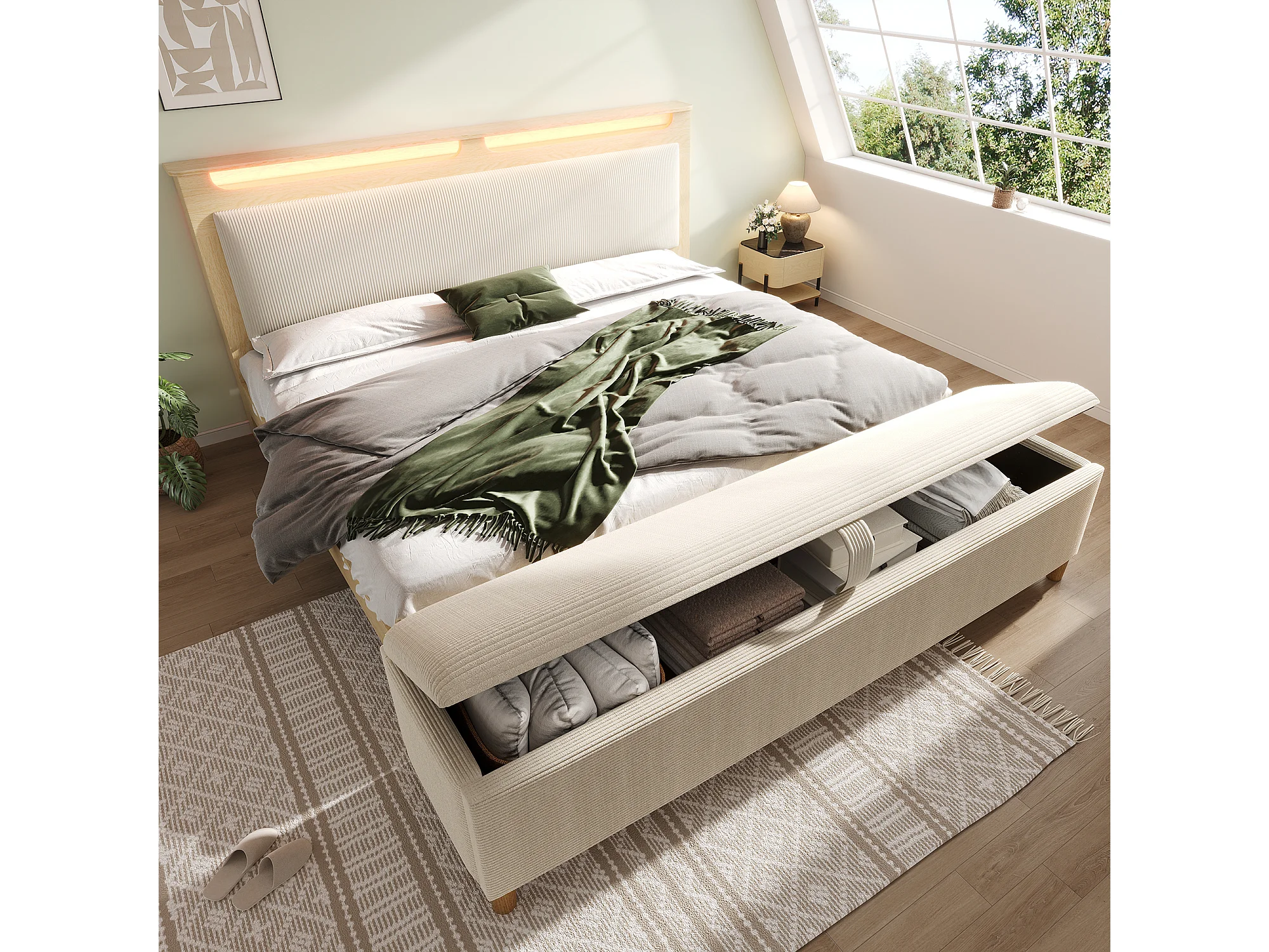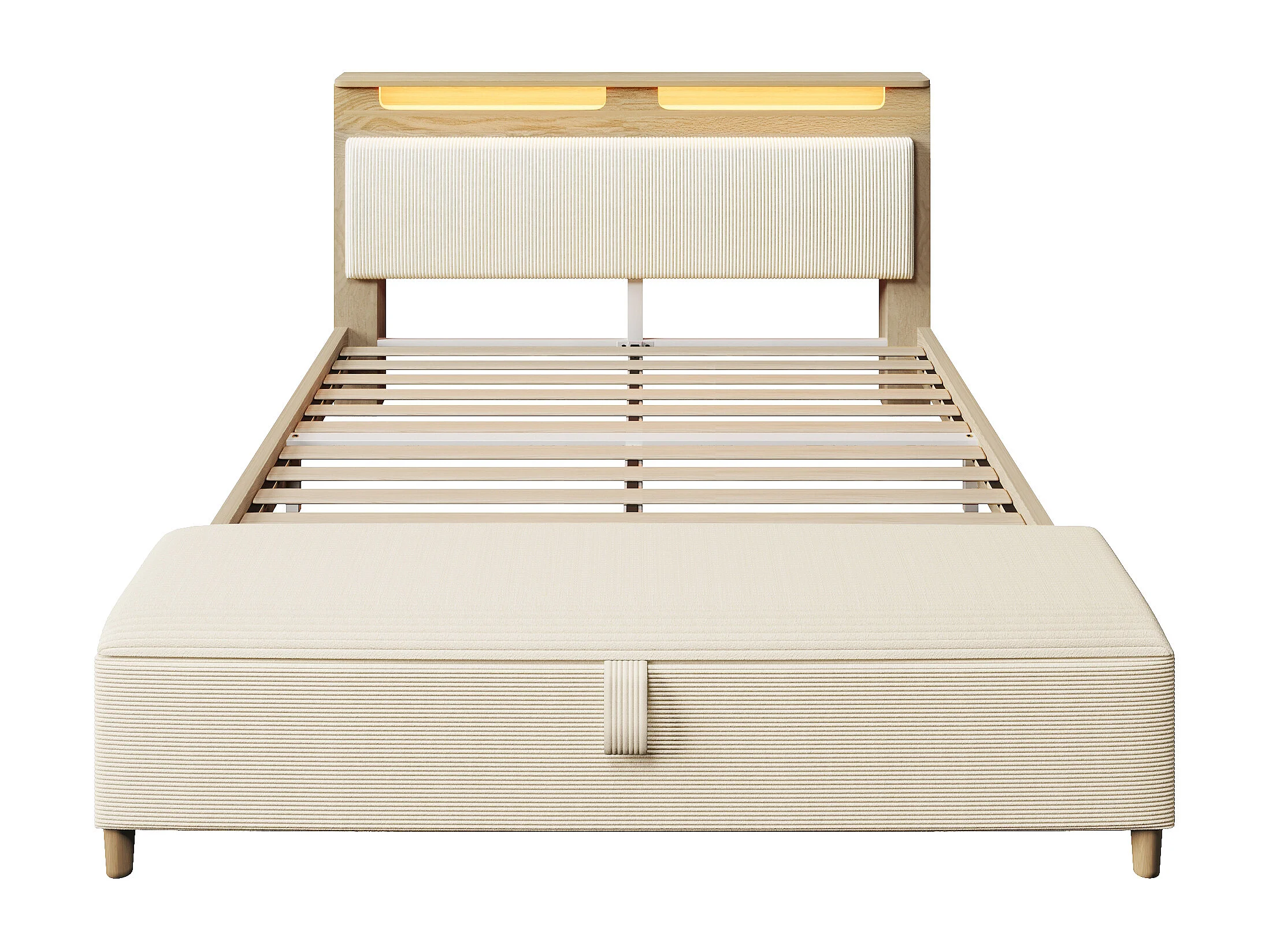 Holz-Doppelbett 140×200 cm - mit gepolsterter Aufbankbank - LED-Beleuchtung - Kopfteil mit Staufach - beige