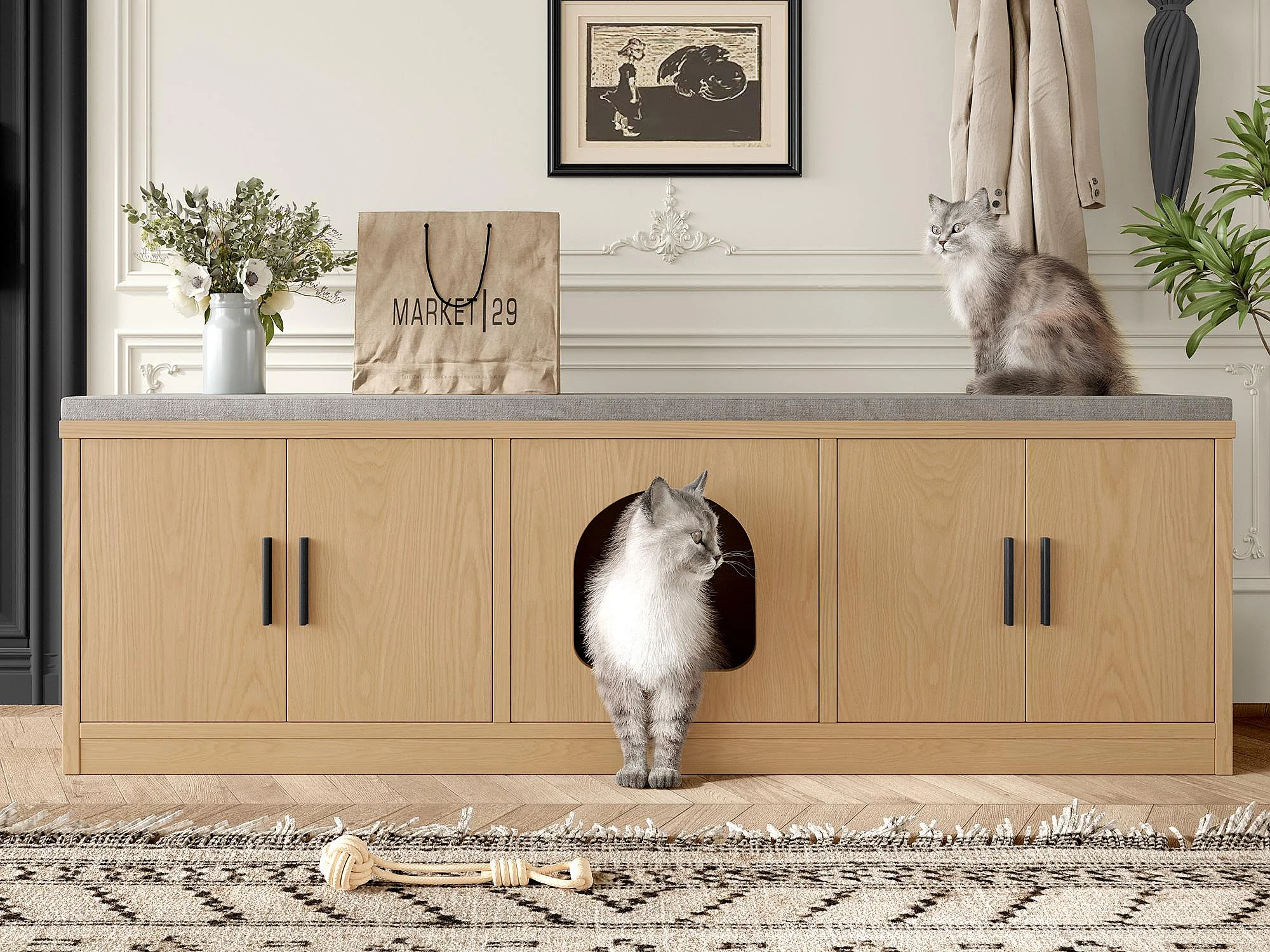 Katzenklo-Schrank - 140x40x45.5 cm - mit Kratzbrett und Belüftungssystem - natur