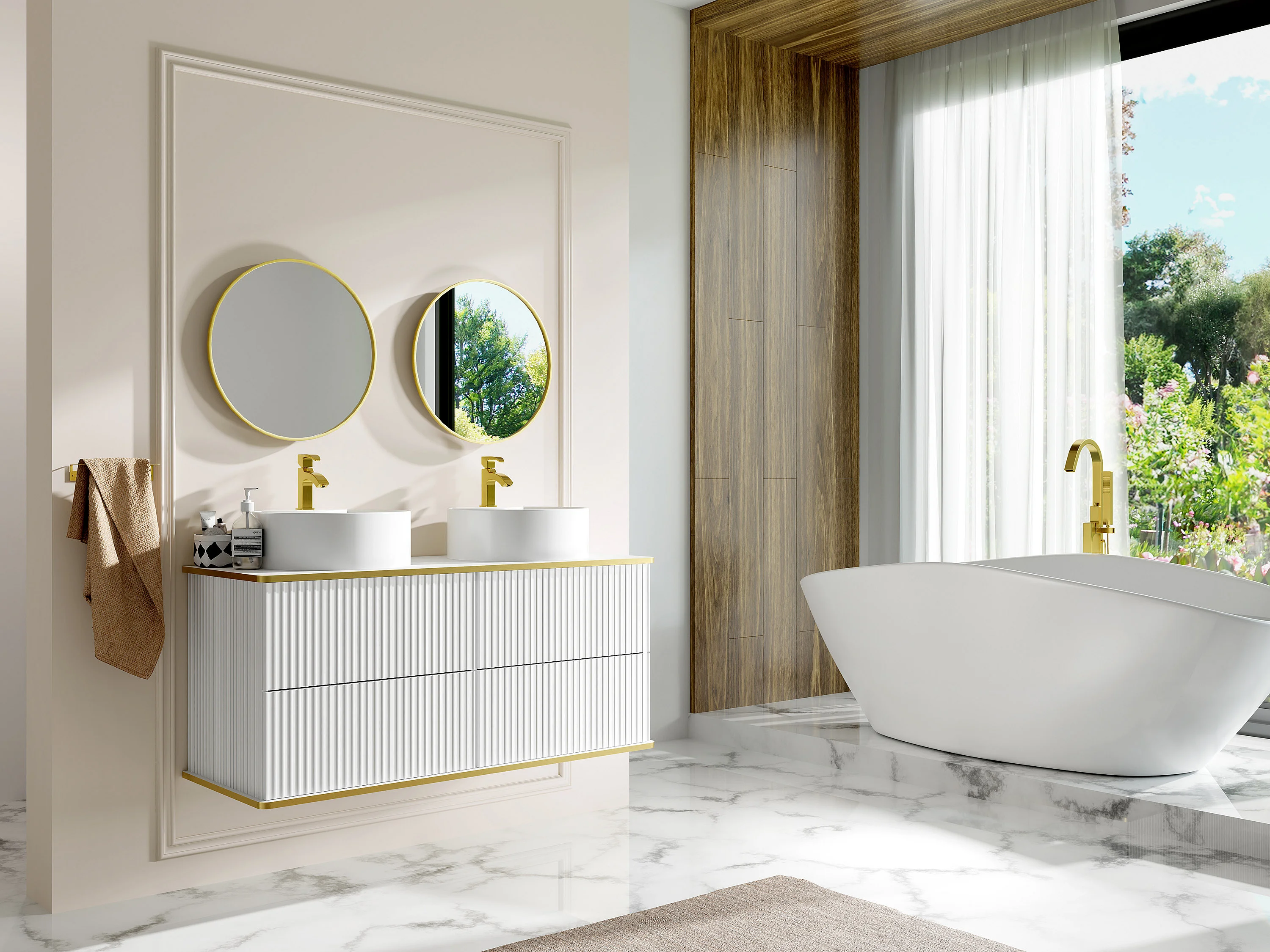 Waschbeckenunterschrank hängend mit rundem Doppelaufsatzwaschbecken - Streifenoptik - Goldfarbene Umrandung - Weiß - 120 cm - KELIZA