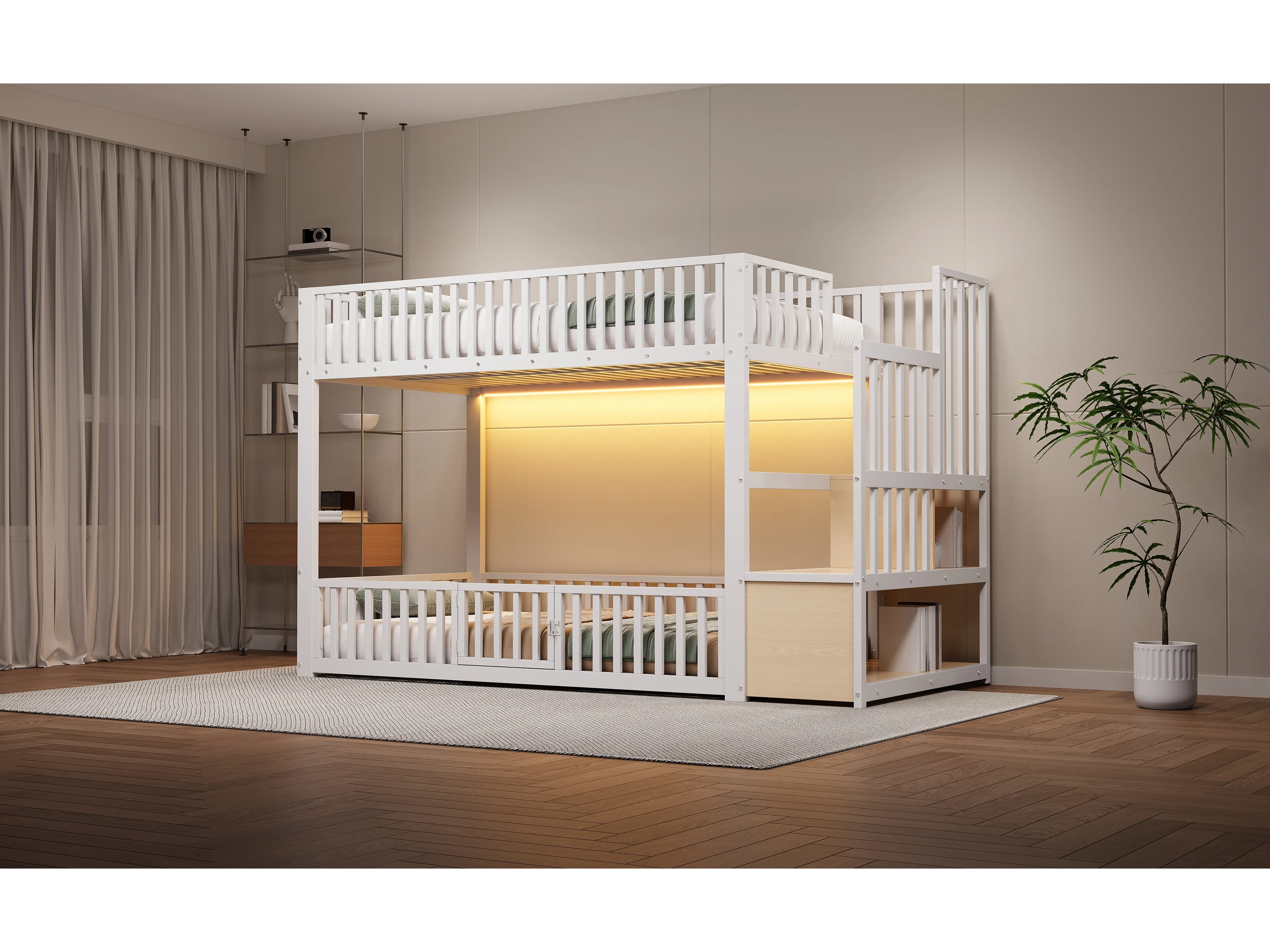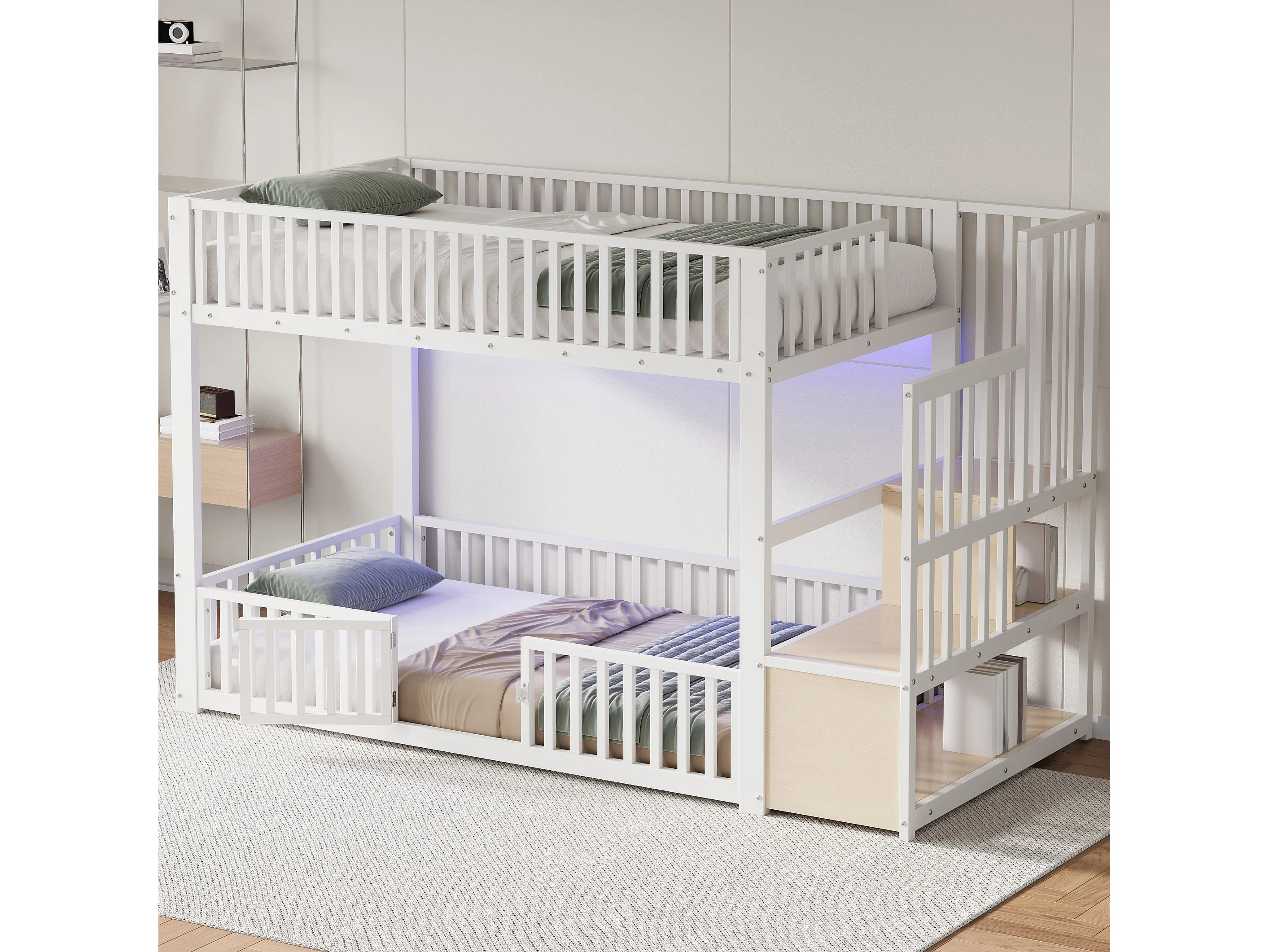 Kinder-Etagenbett – 2 x 90 x 200 cm – mit Leiter mit Stauraum und LED-Beleuchtung – MDF + Metall – weiß