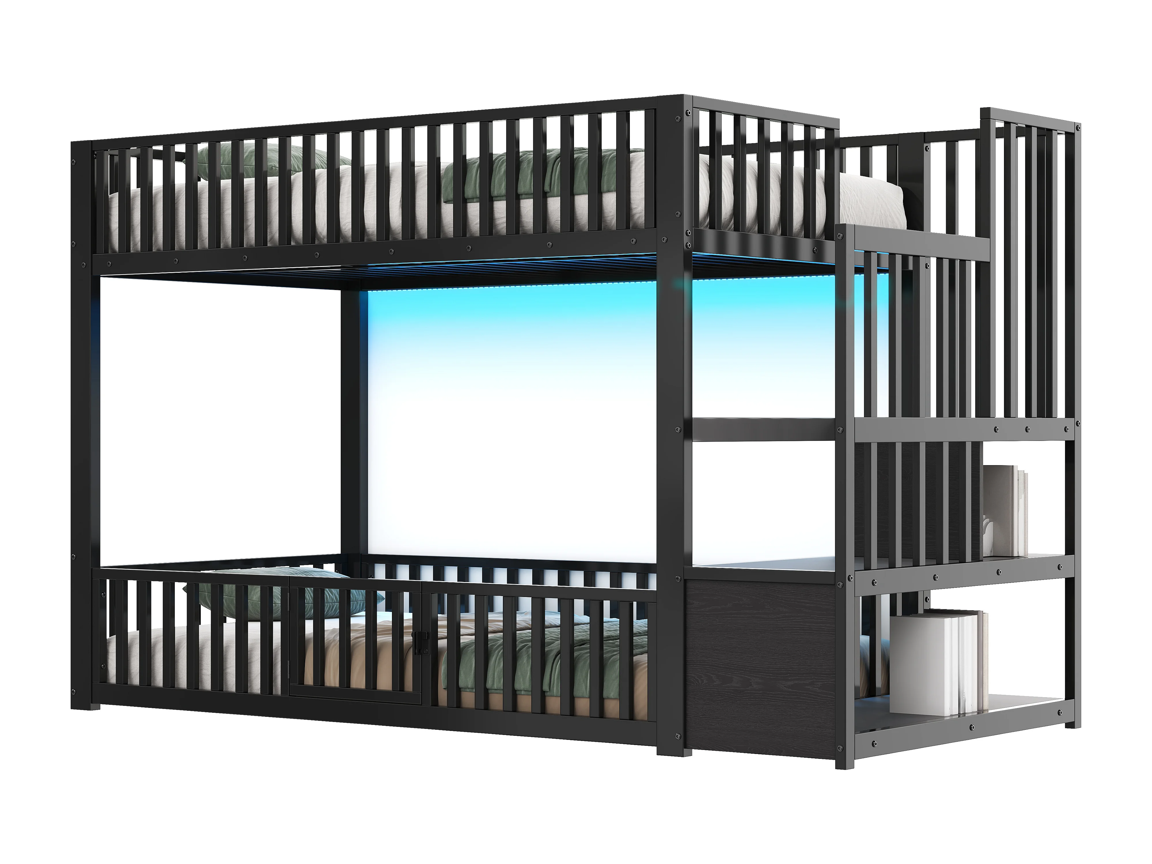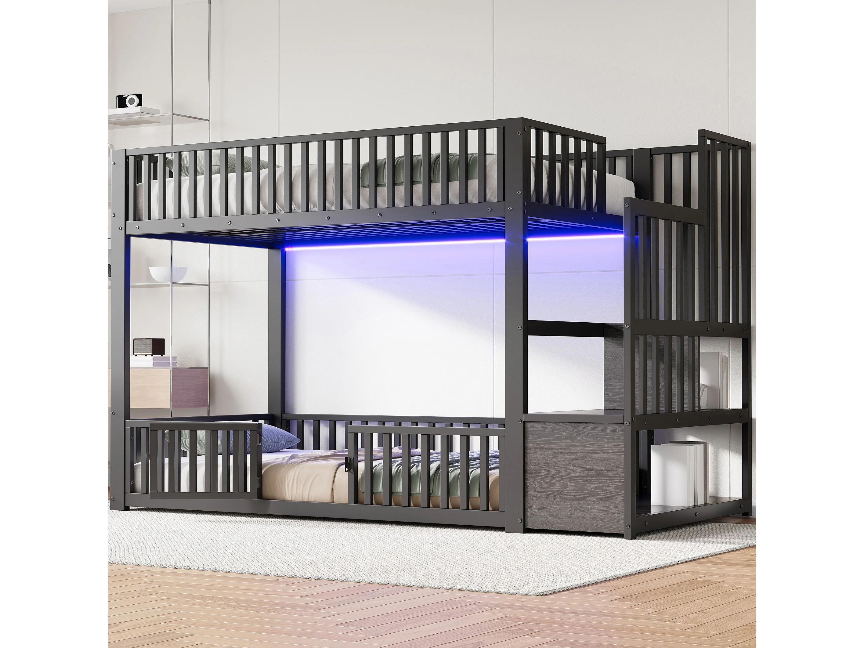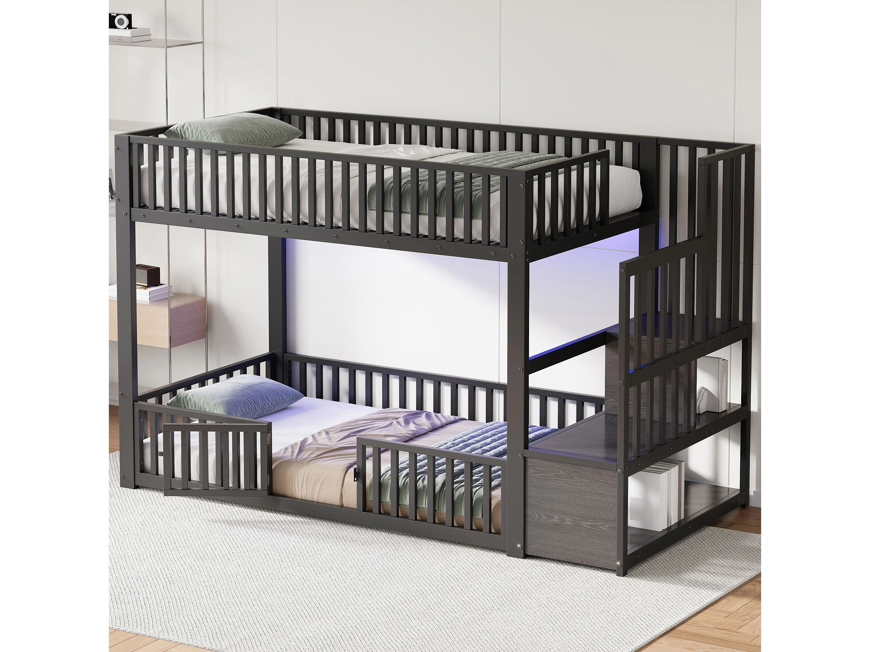 Kinder-Etagenbett – 2 x 90 x 200 cm – mit Leiter und Stauraum + LEDs – MDF + Metall – schwarz