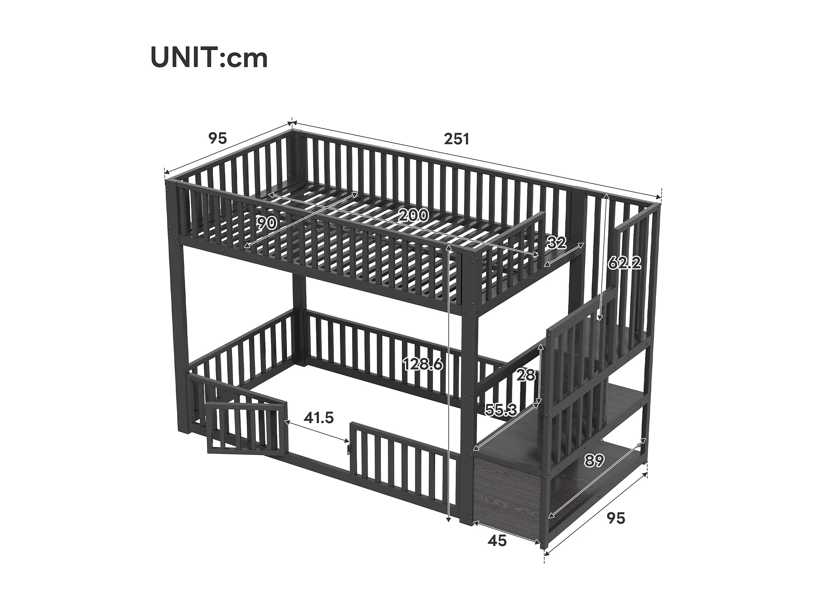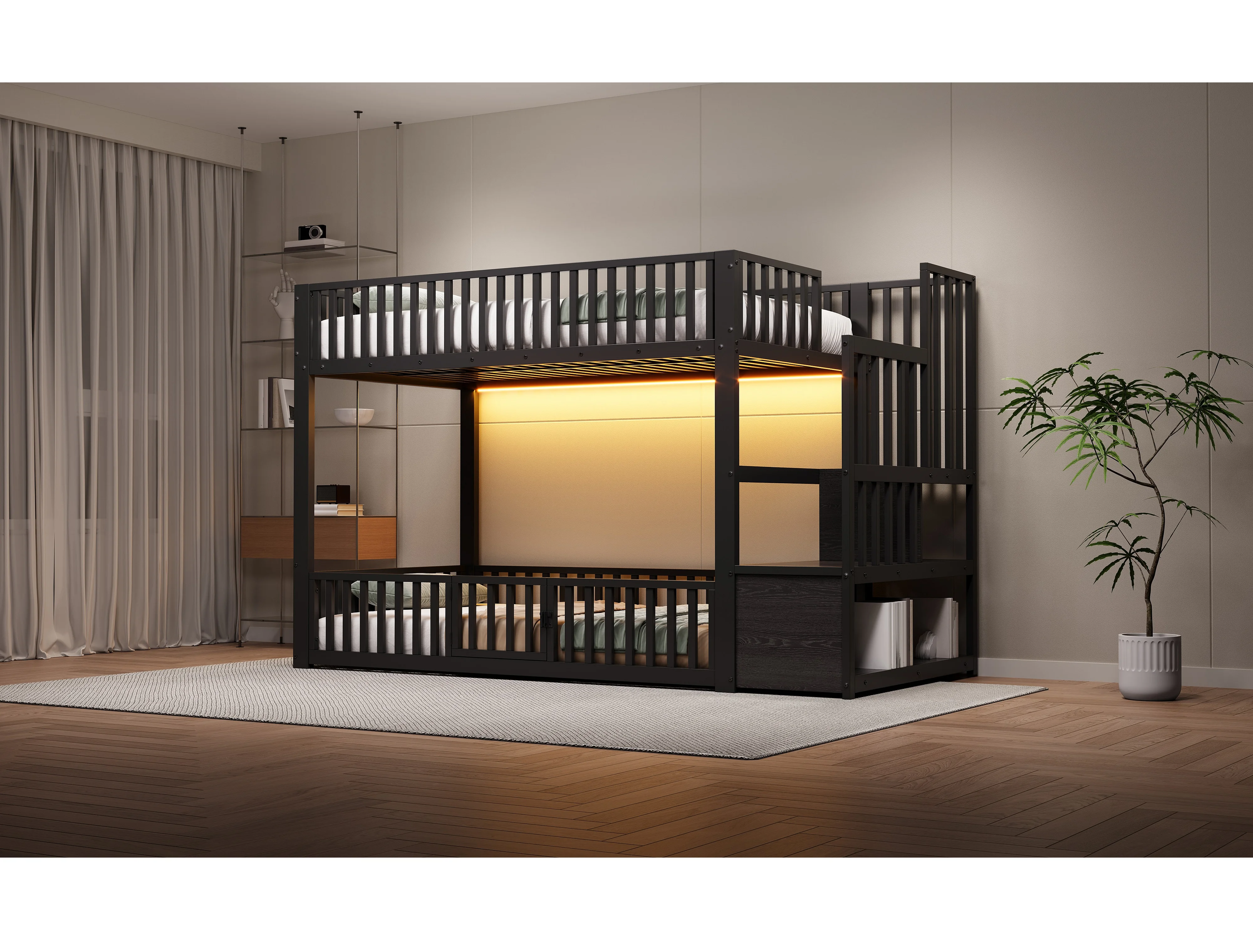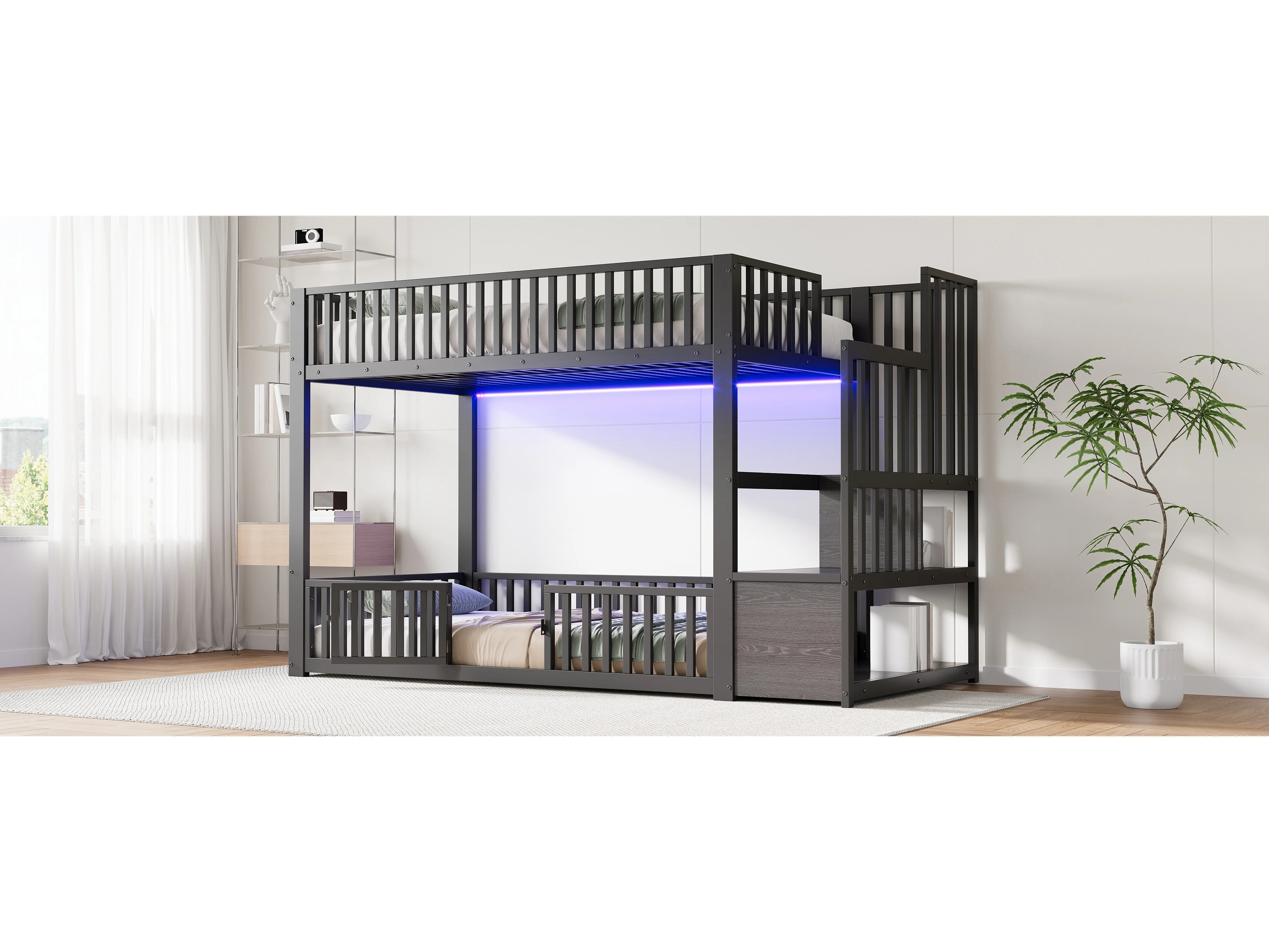 Kinder-Etagenbett – 2 x 90 x 200 cm – mit Leiter und Stauraum + LEDs – MDF + Metall – schwarz
