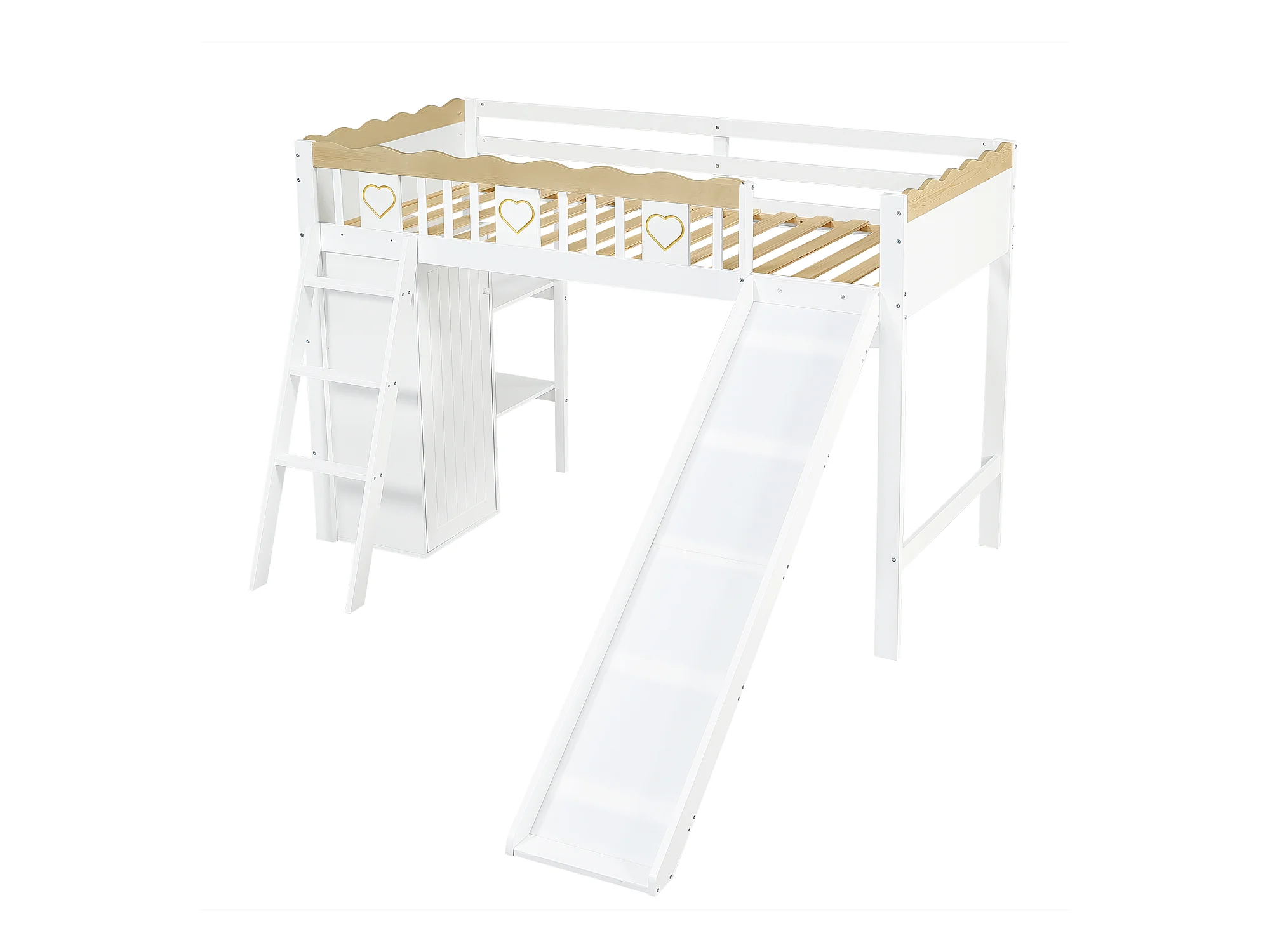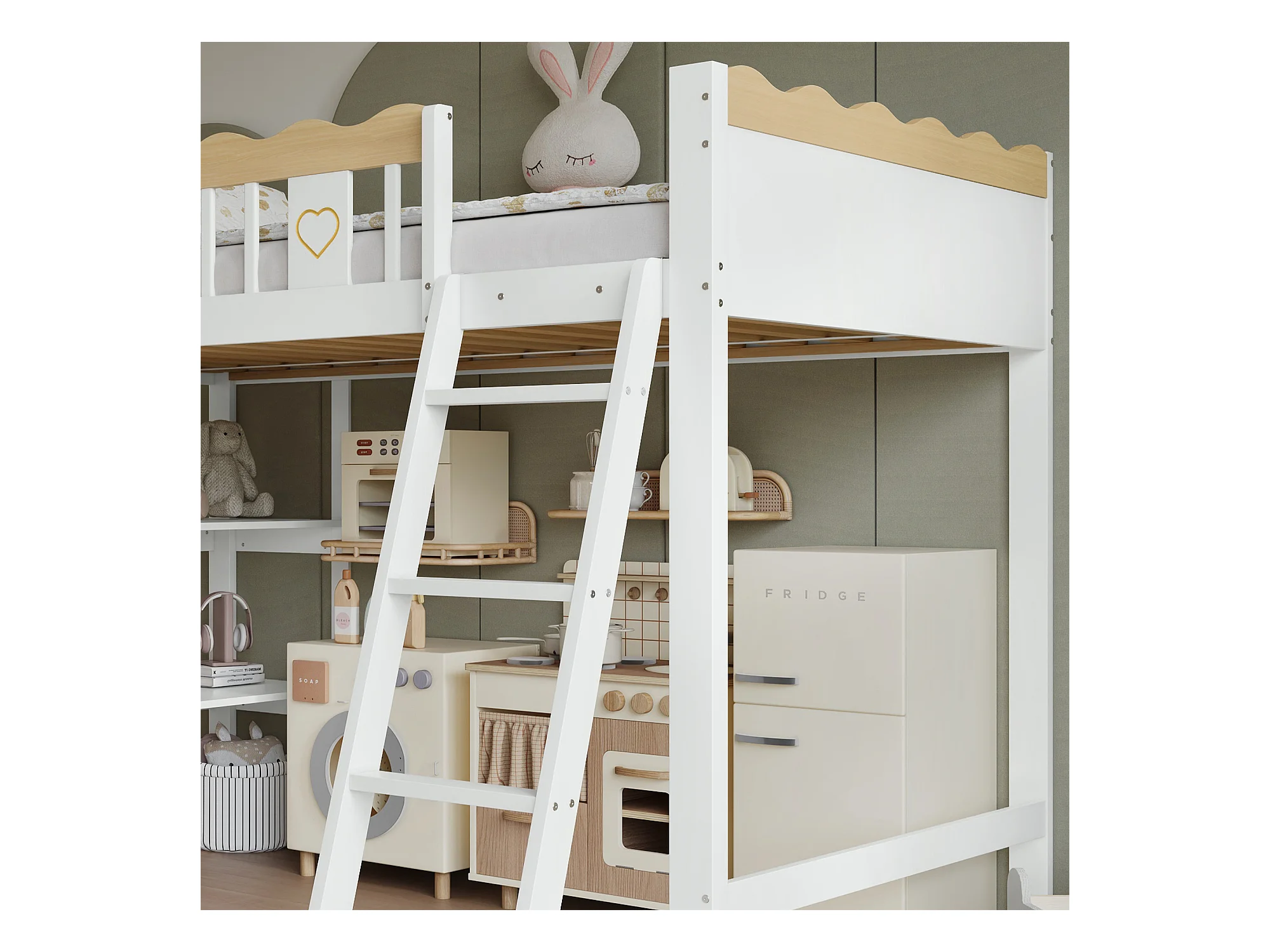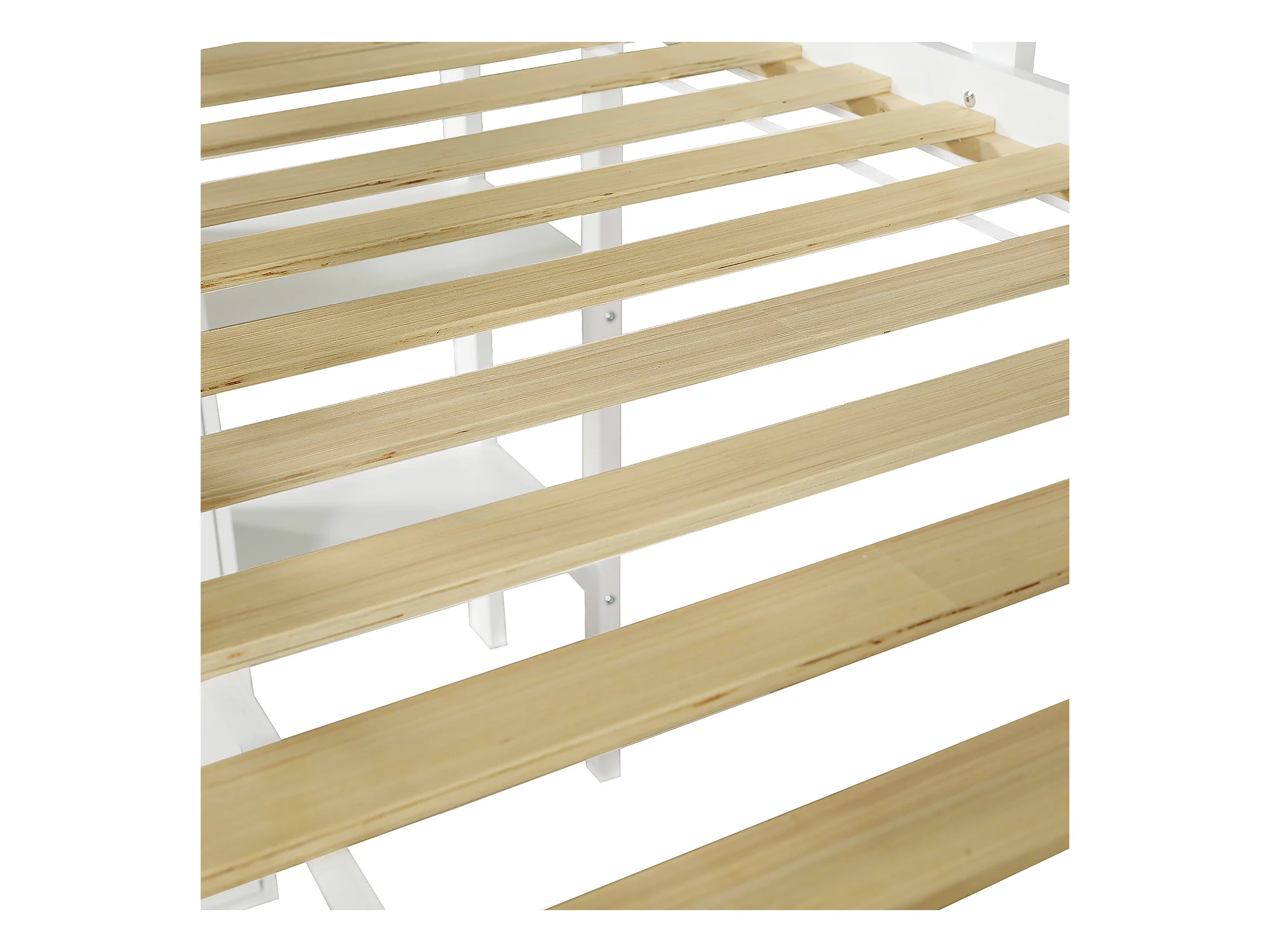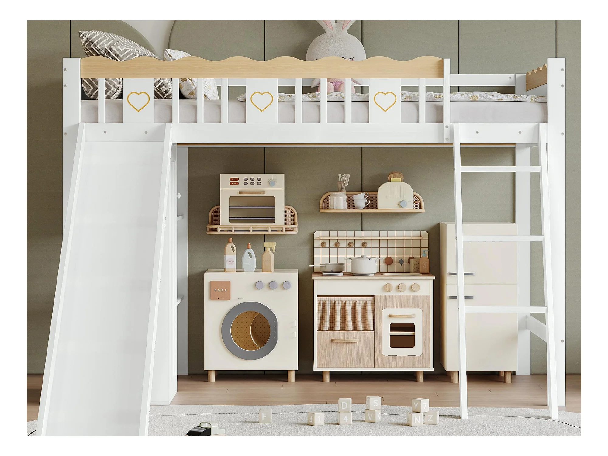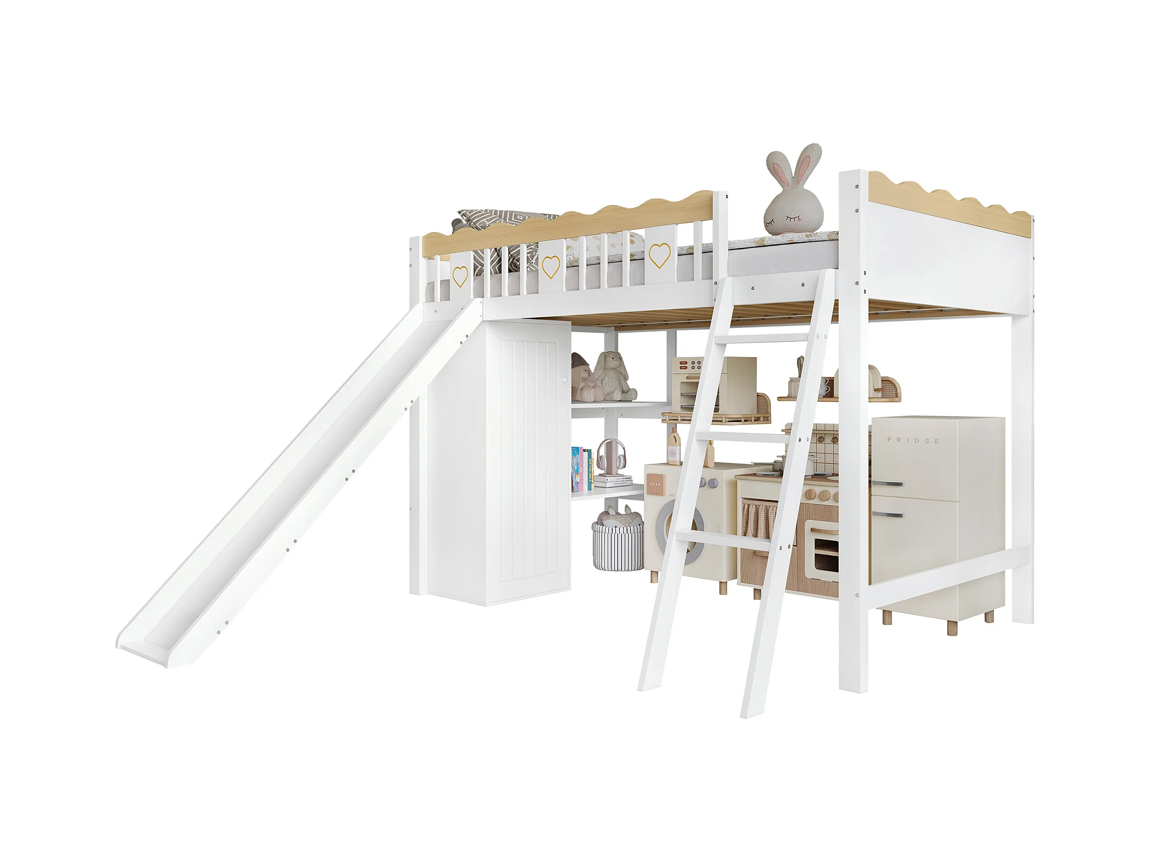 Kinder-Hochbett 90×200 cm - mit Schrank und Fächern - mit Kinderrutsche - Massivholz + MDF - weiß (Matratze nicht inbegriffen)