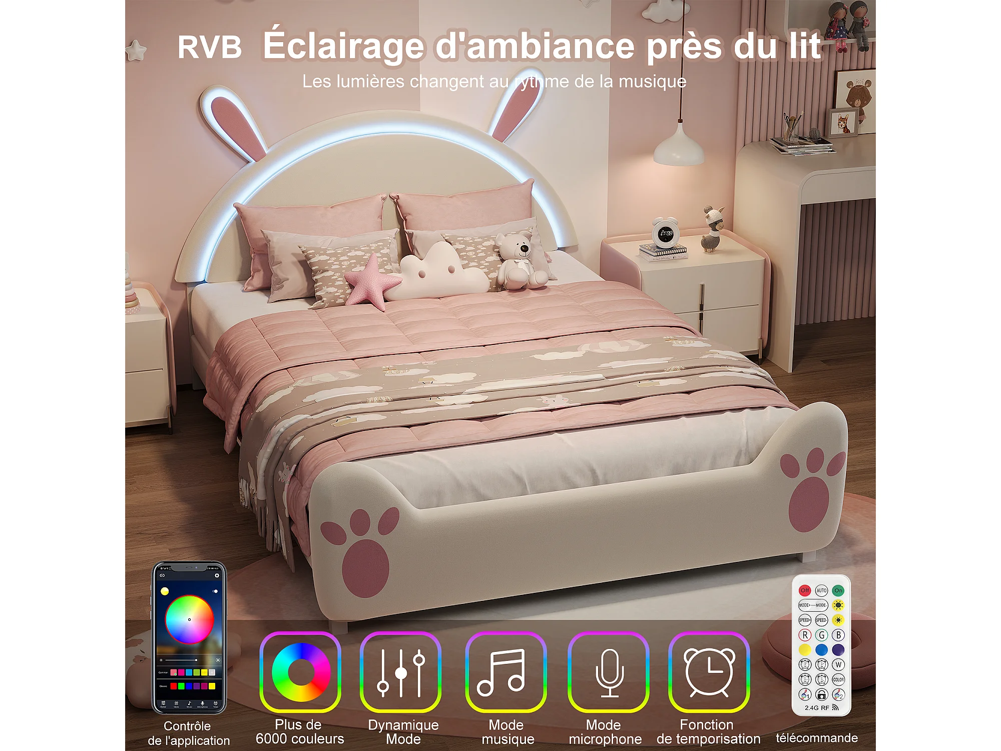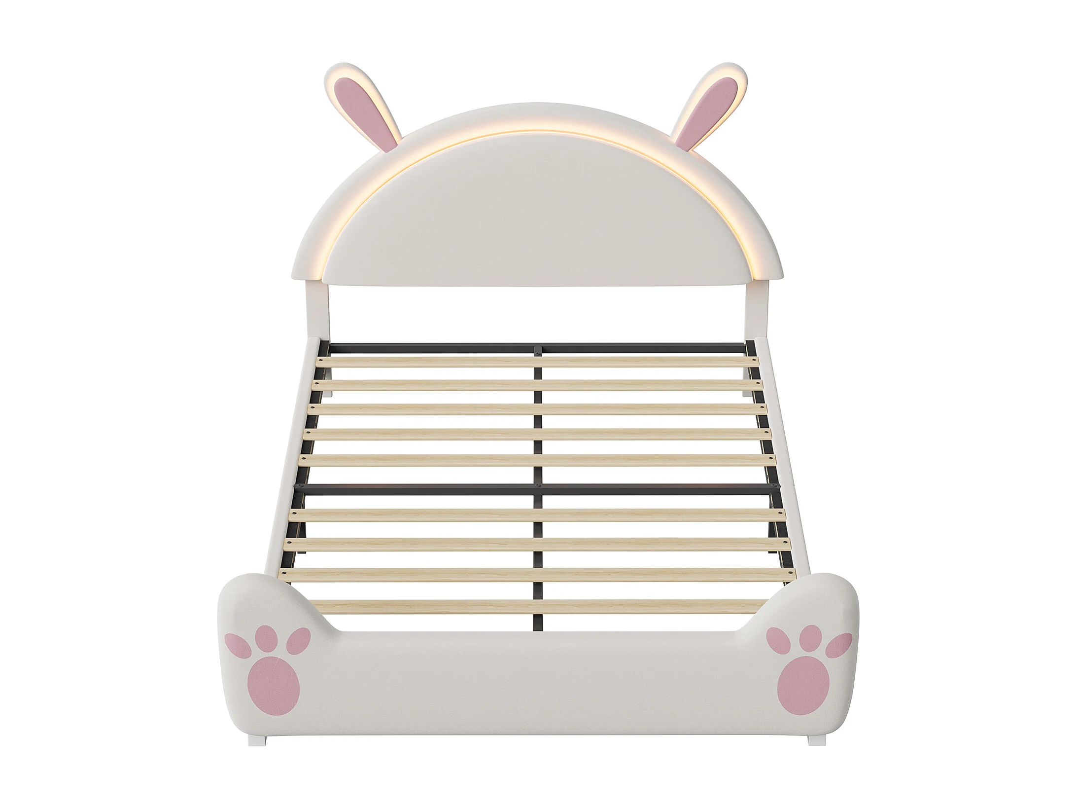 Kinderbett 140x200 cm Hase mit LED-Beleuchtung, Hasenohren-Design, weiß-rosa Gestell