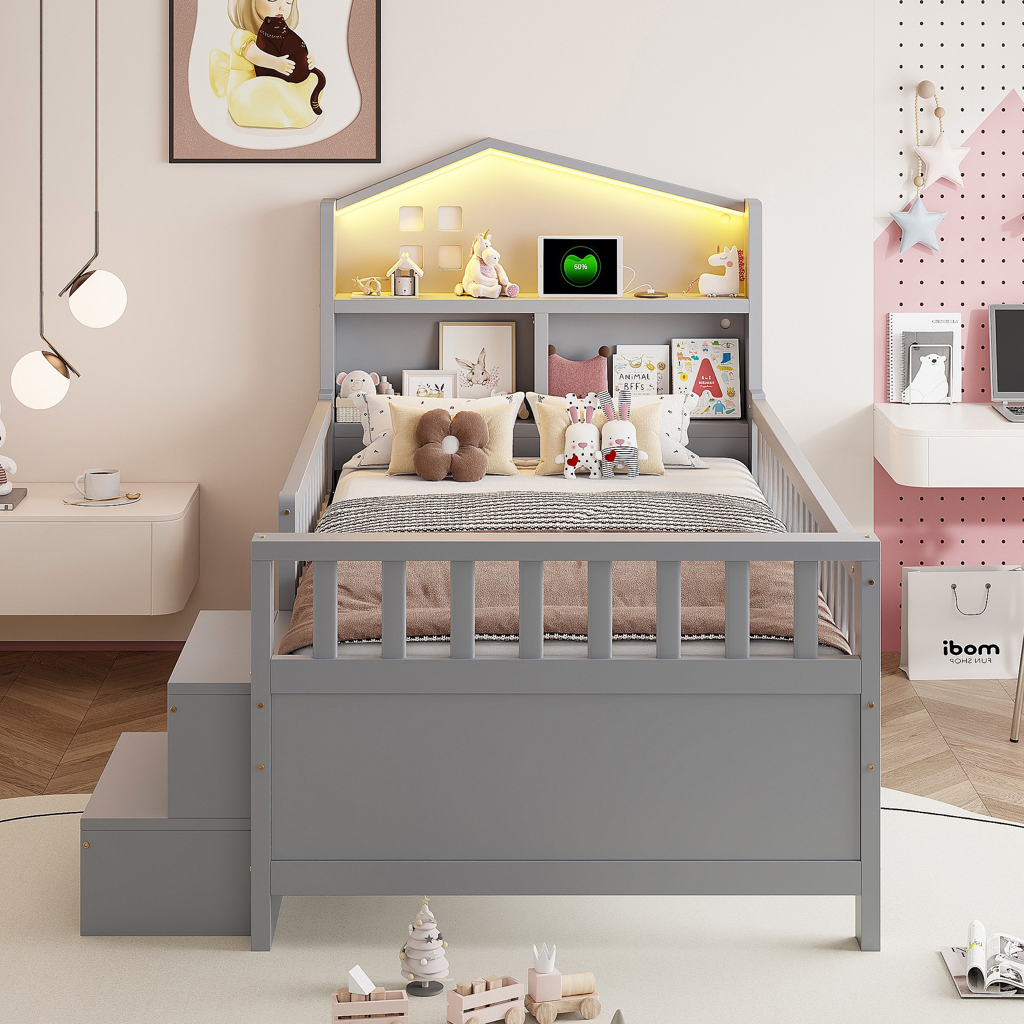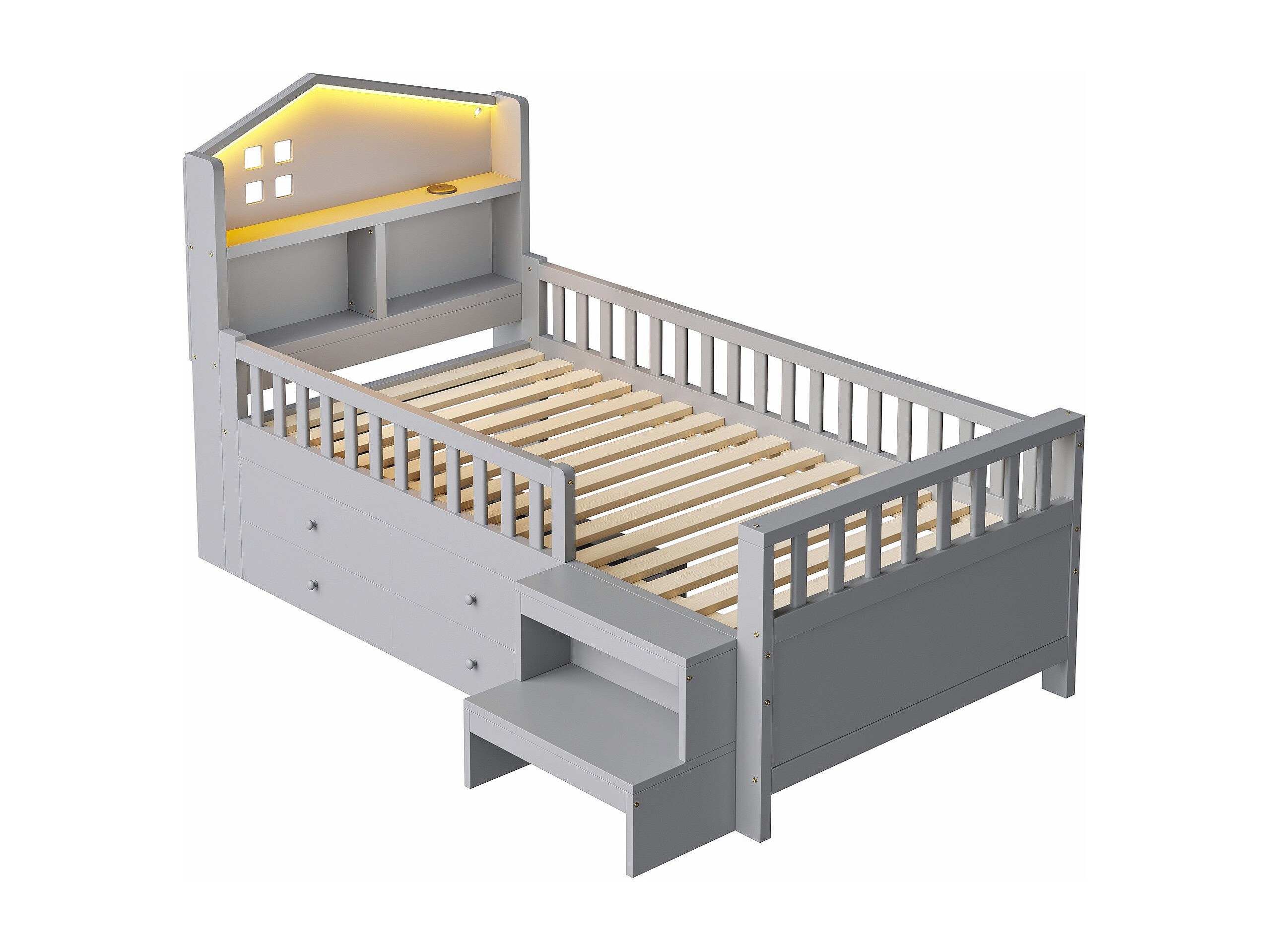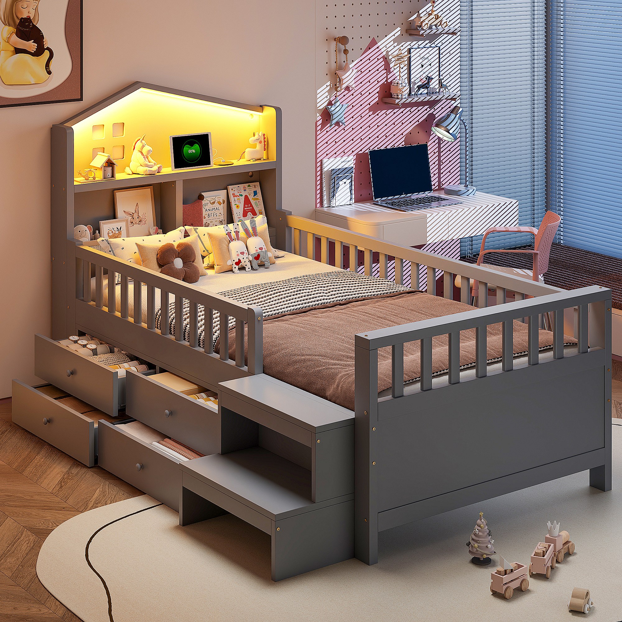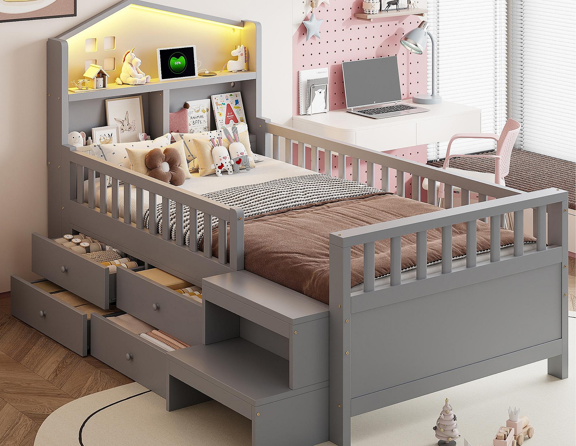 Kinderbett 90x200 cm - mit vier Schubladen - mit Stufen - mit LED-Beleuchtung - mit USB + Type-C Ladeanschluss - grau