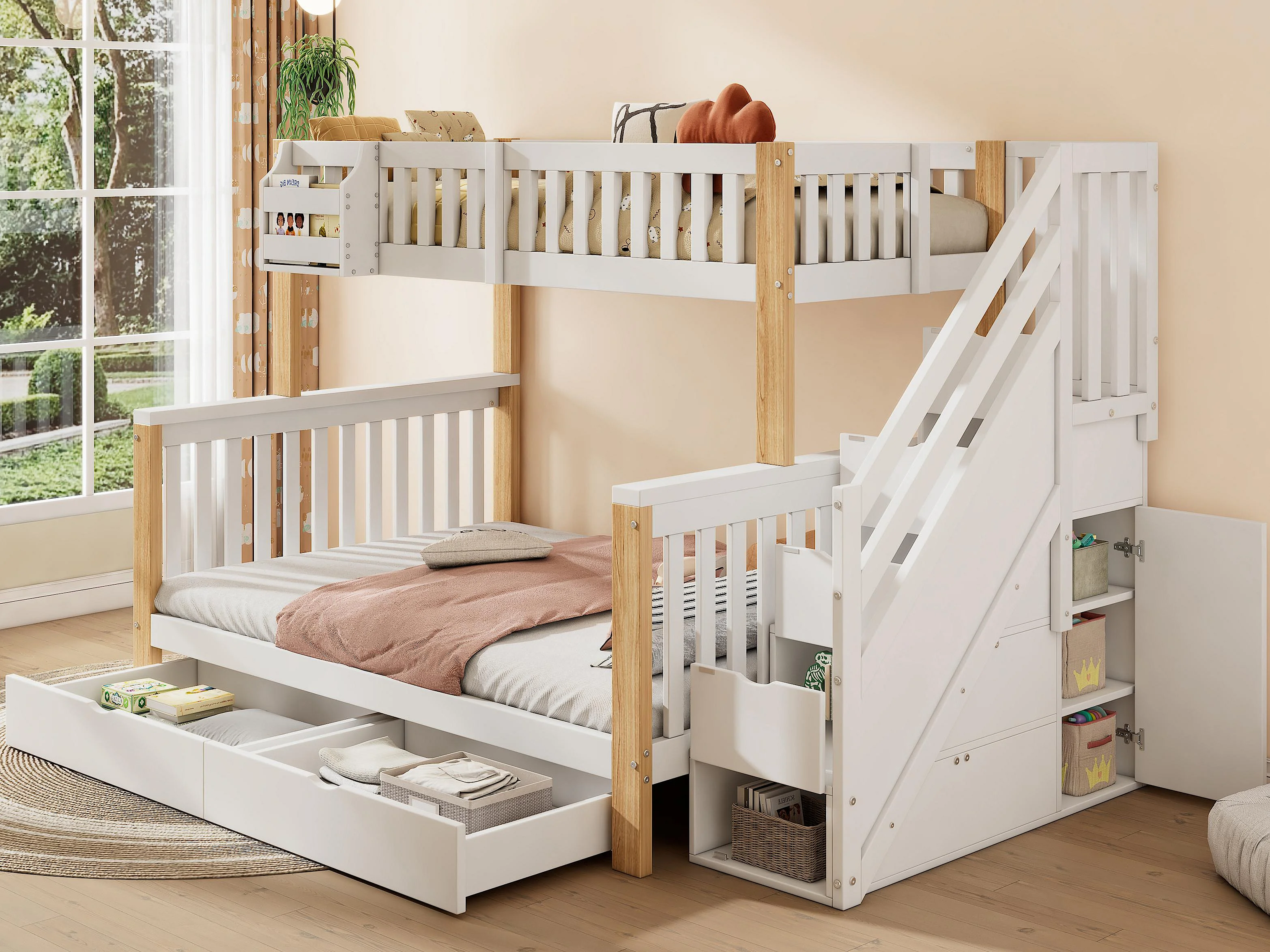 Kinderbett-Etagenbett für Kinder 90x200 + 140x200 cm - Doppelbett - mit 2 Schubladen - mit Schranktreppe - weiß + natur (Matratze nicht enthalten)