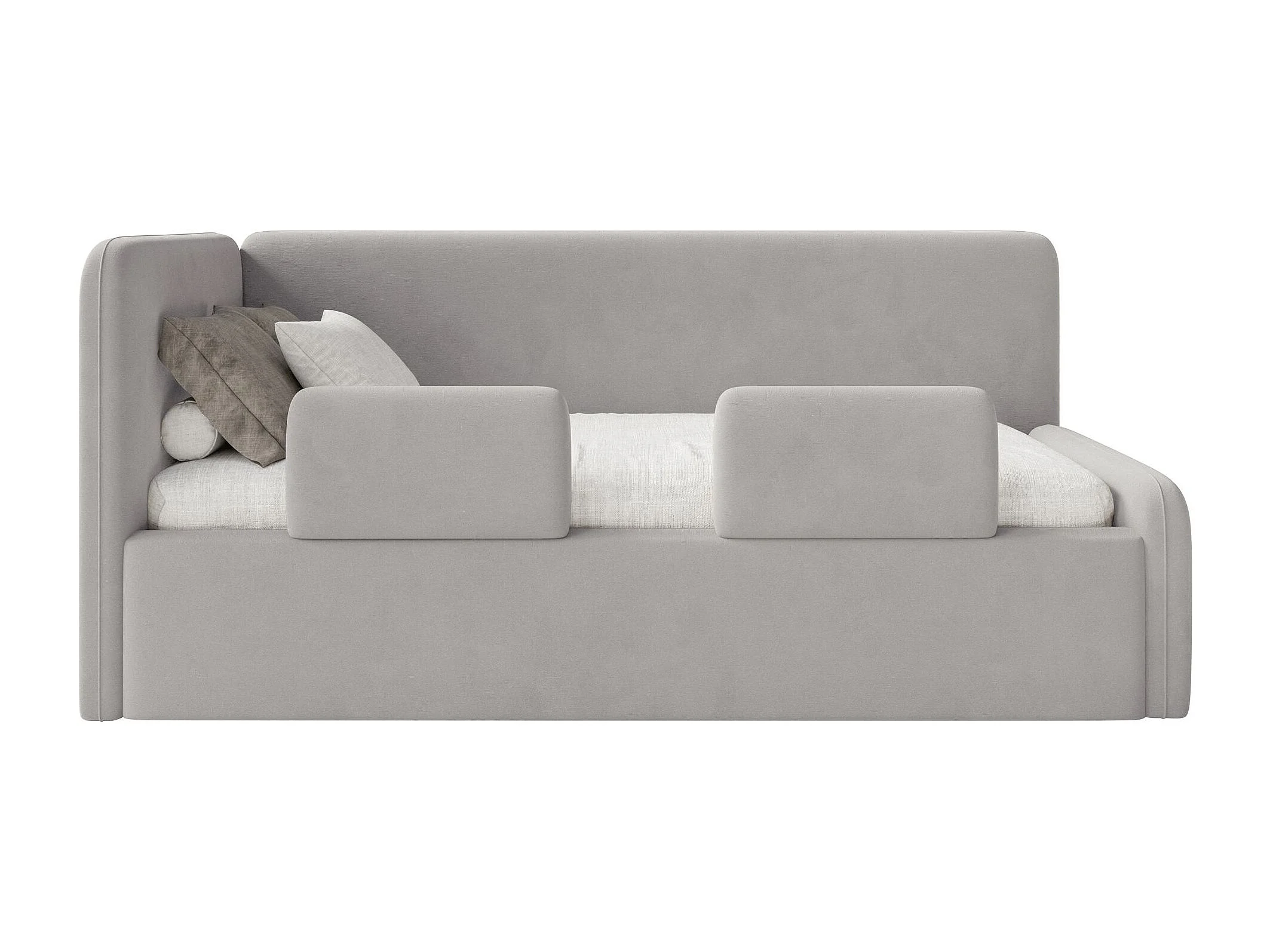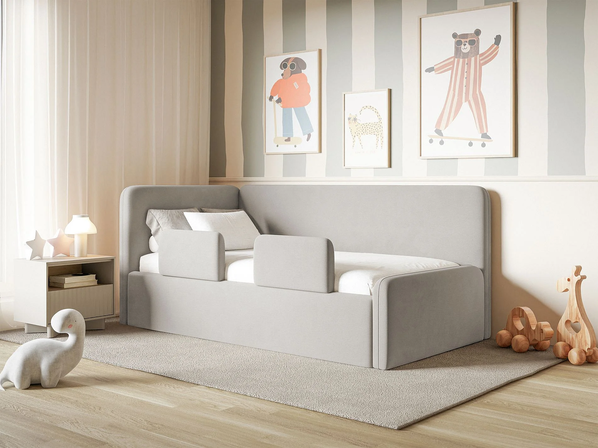 Kinderbett mit Kopfteil links – Matratze – Bettkasten und Rausfallschutz – Hellgrau – 90x200 cm – FANKO