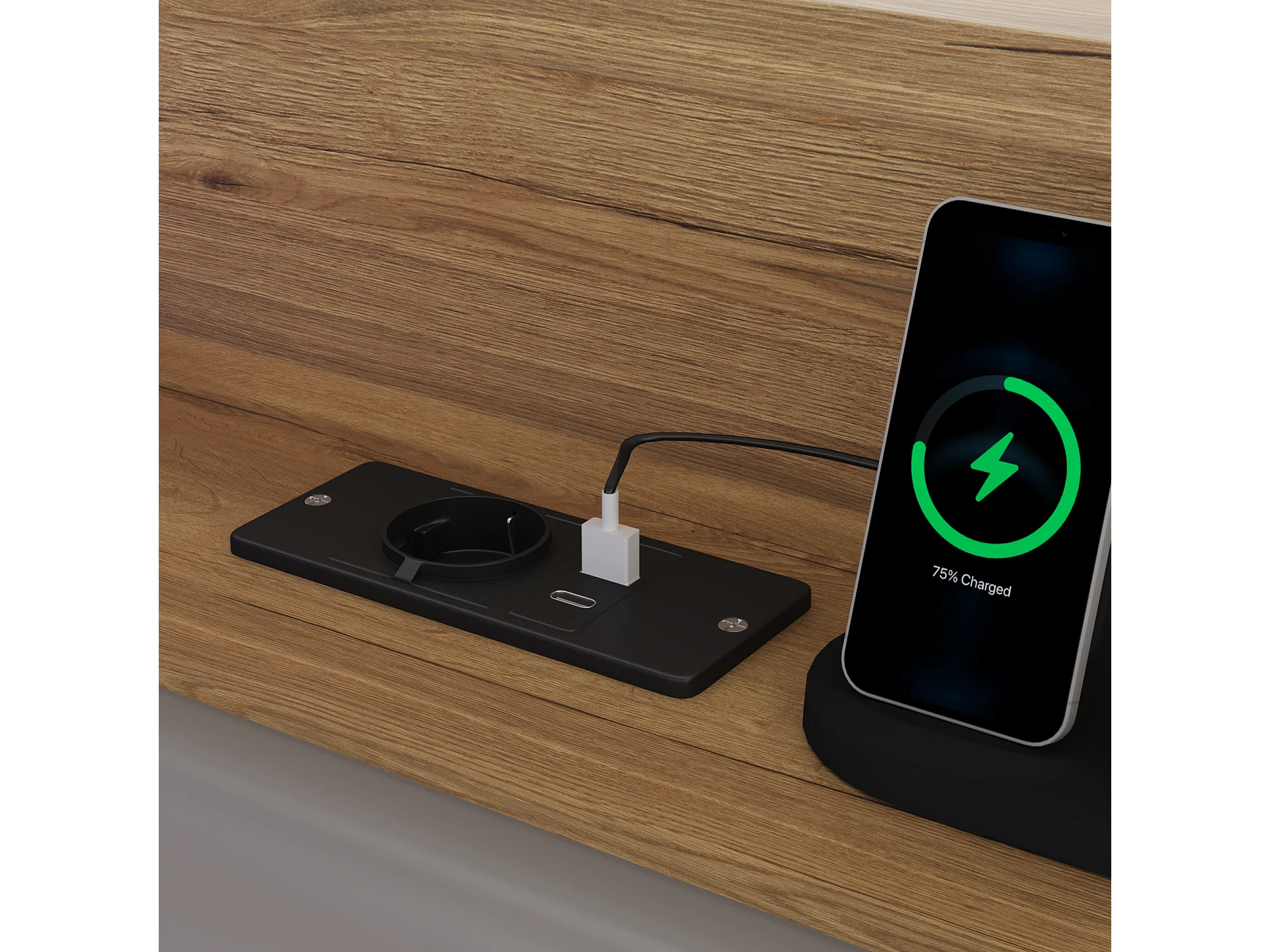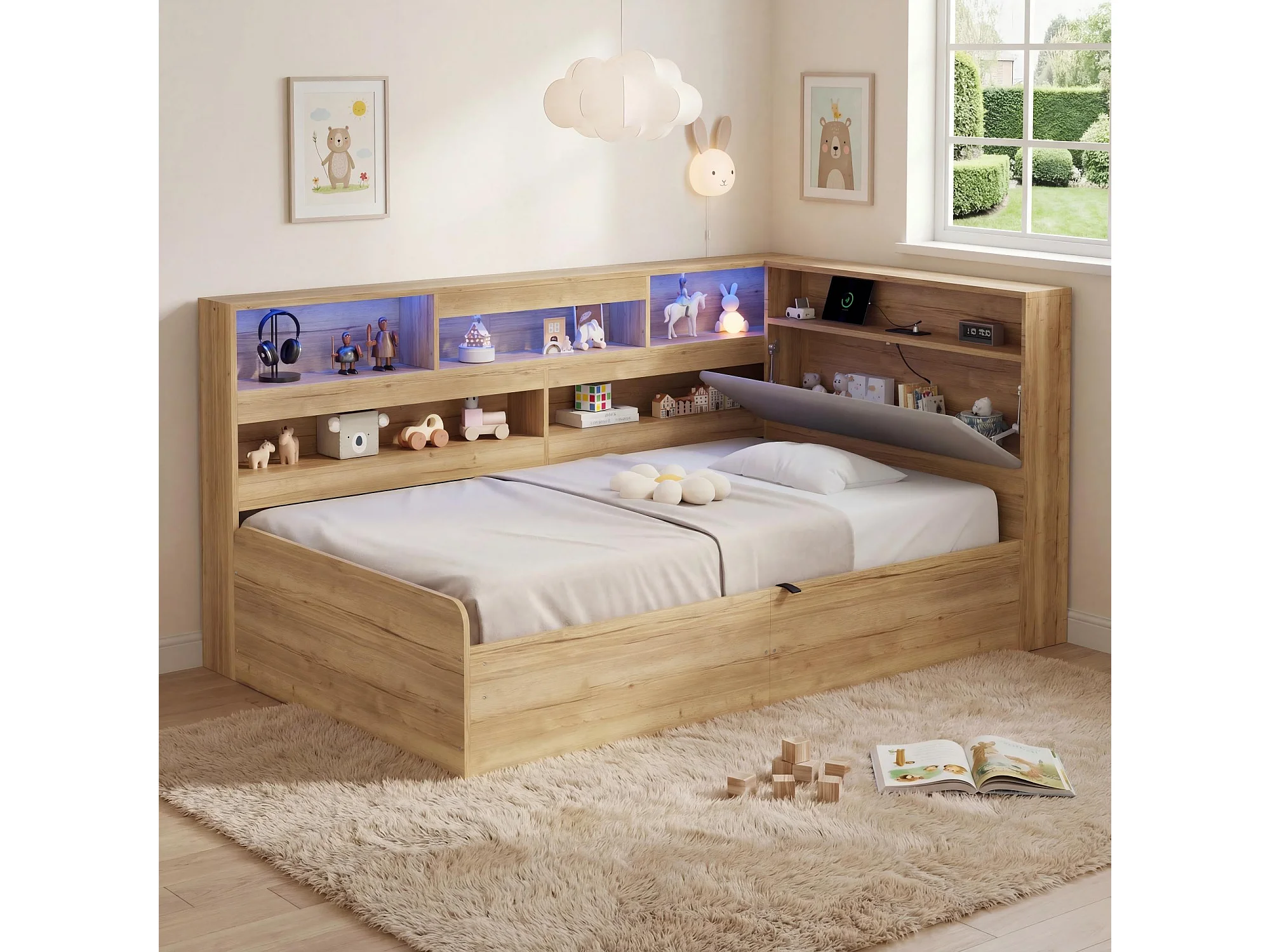 Kinderbett mit Stauraum 90x200cm - mit USB-Anschluss und LED - Stauraum unter dem Bett - Staufächer - MDF - Natur​ (ohne Matratze)