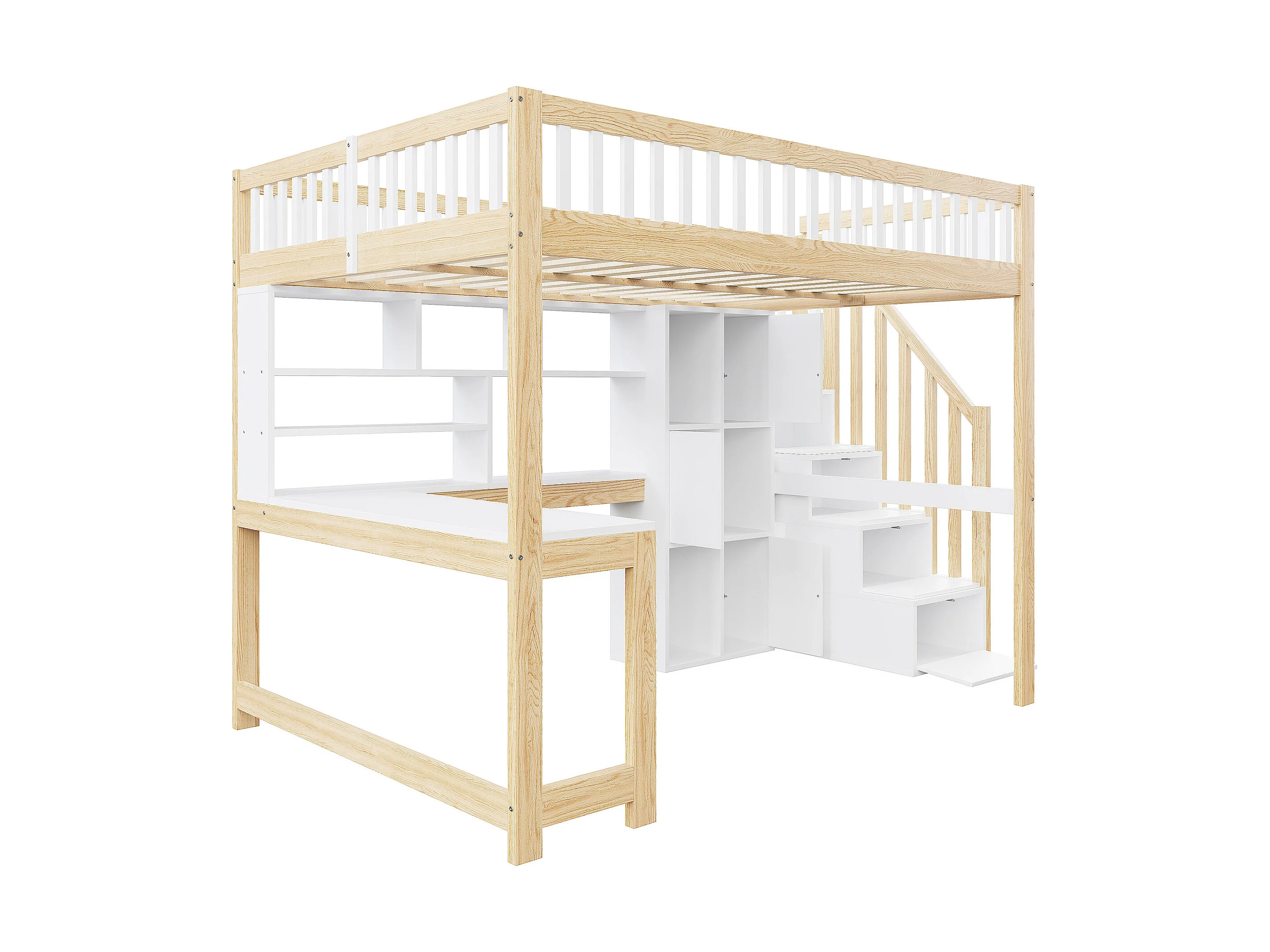 Kinderhochbett - 140 x 200 cm - mit LEDs + Stauraumleiter + Regale + Schreibtisch - Holz - weiß + natur