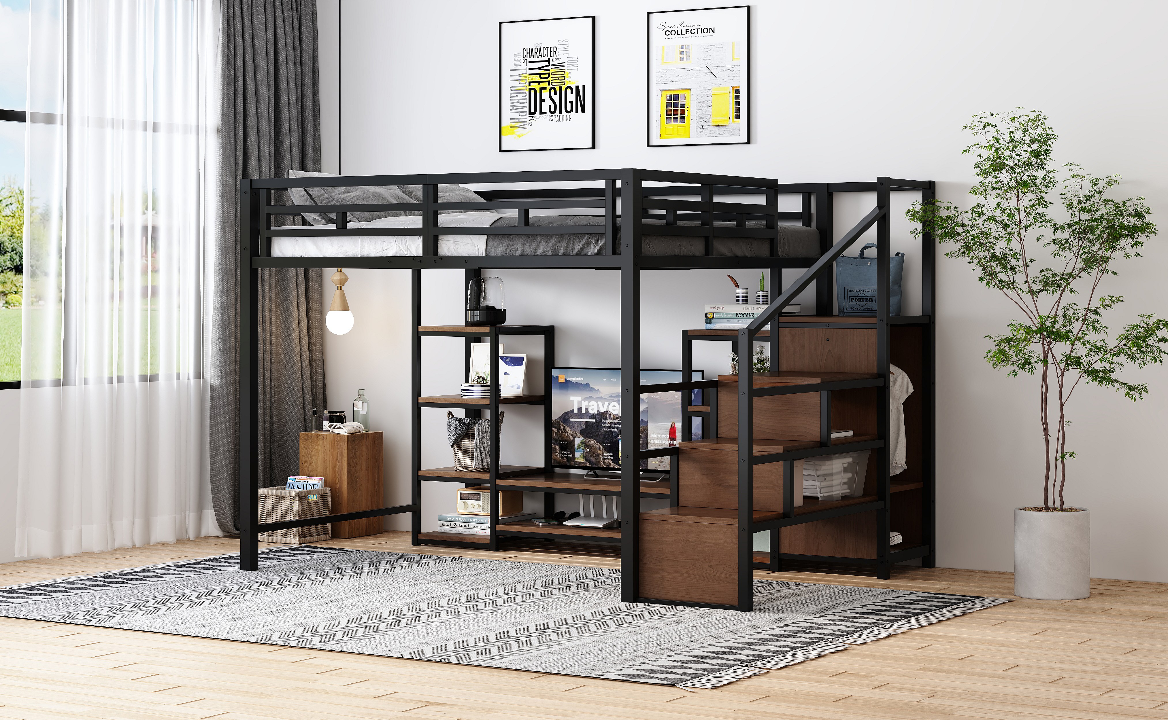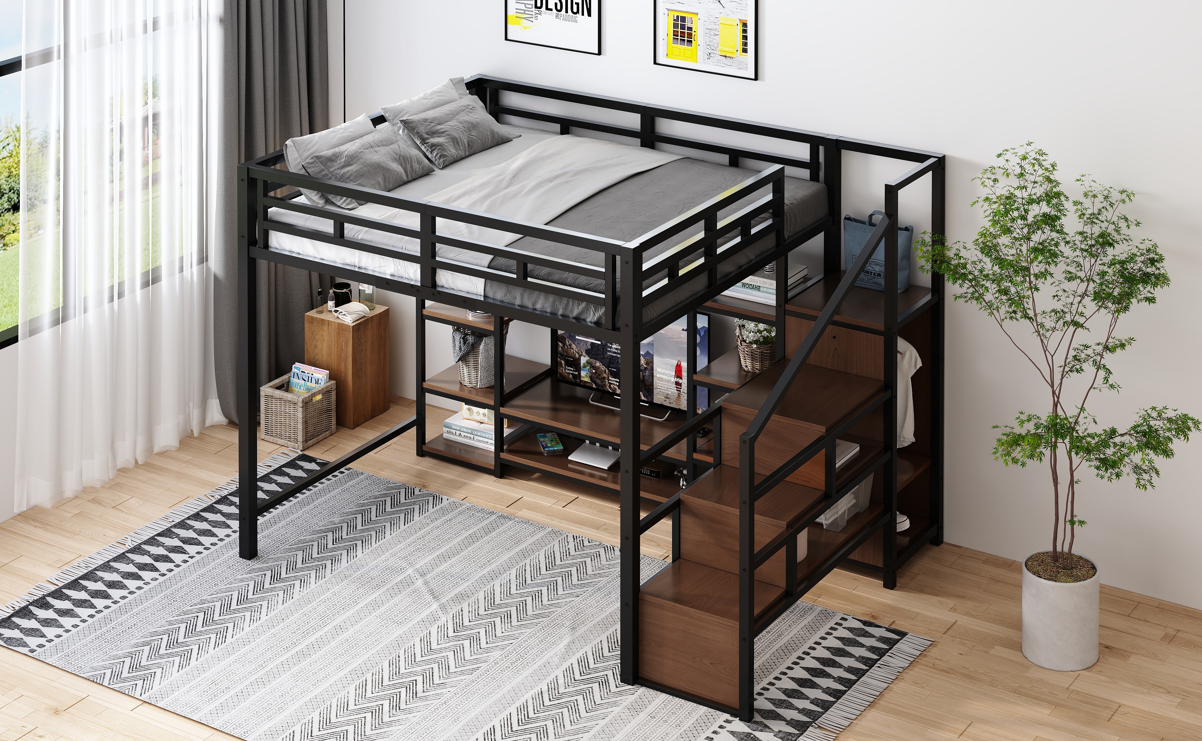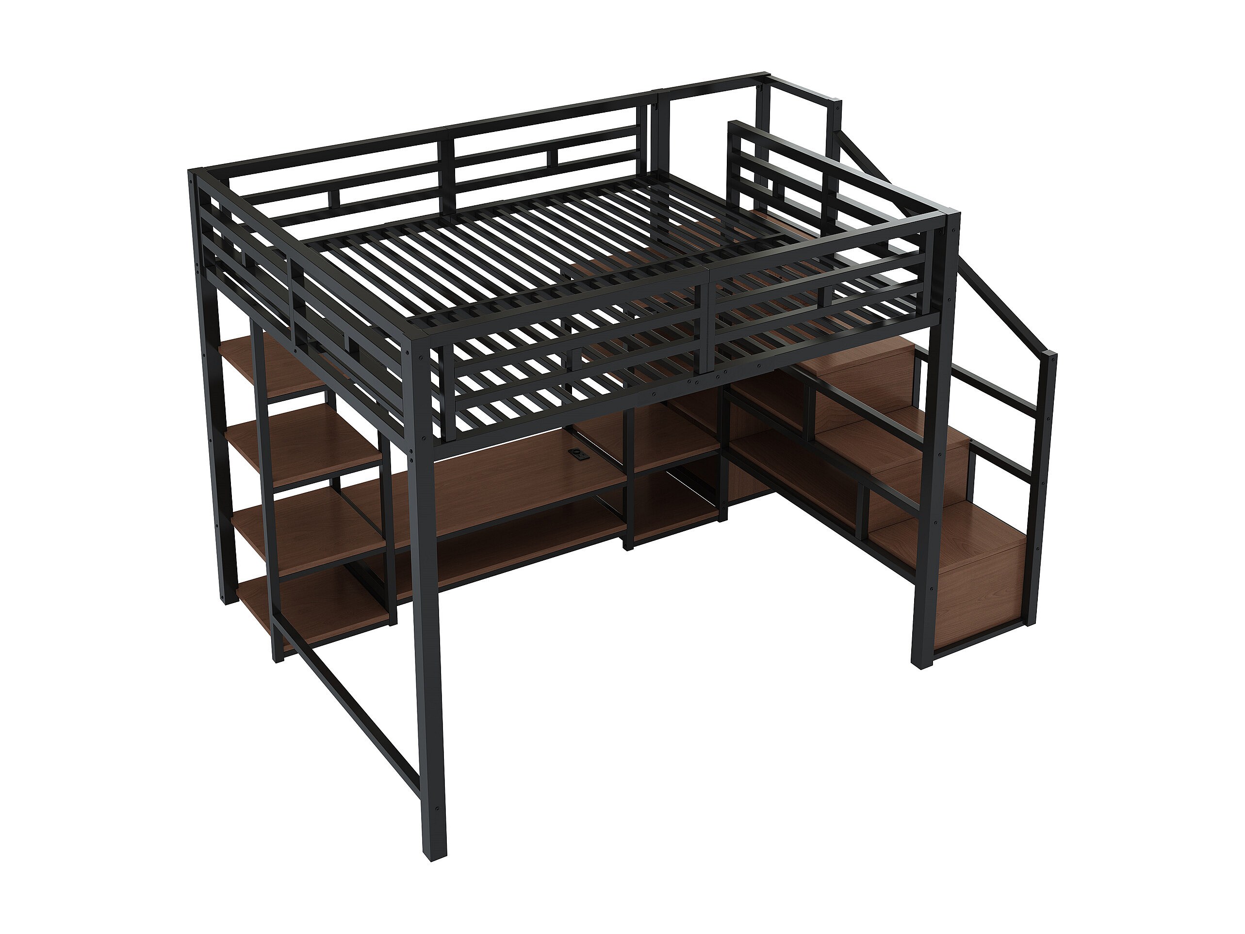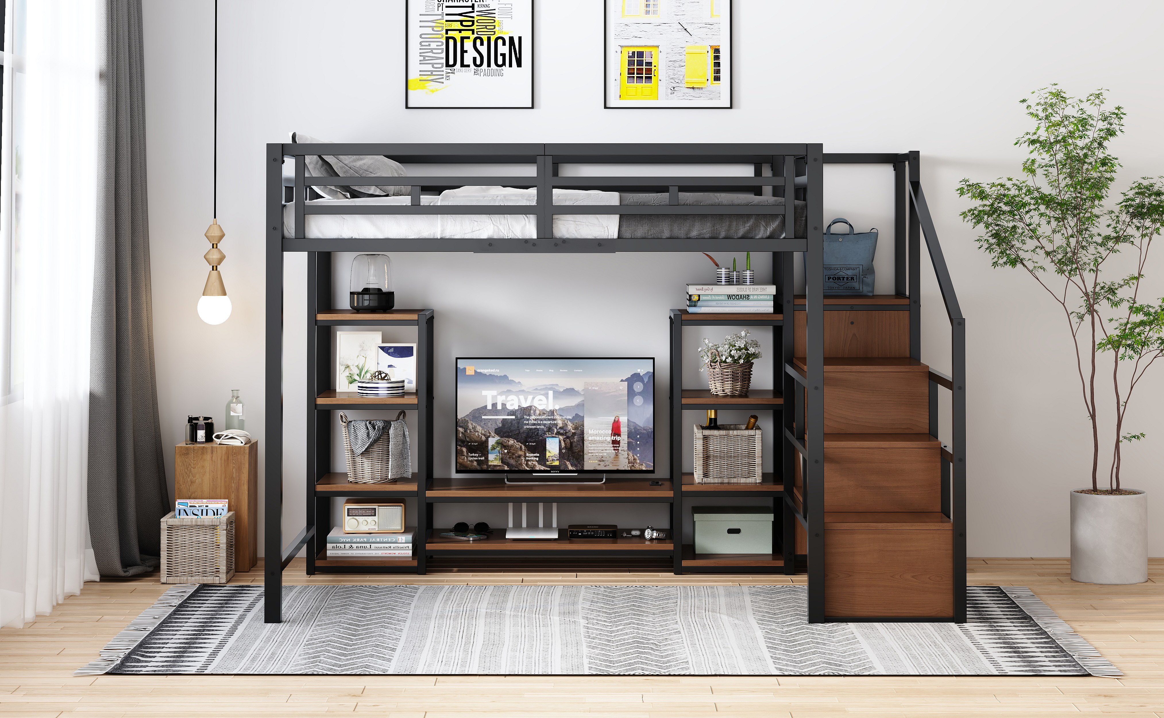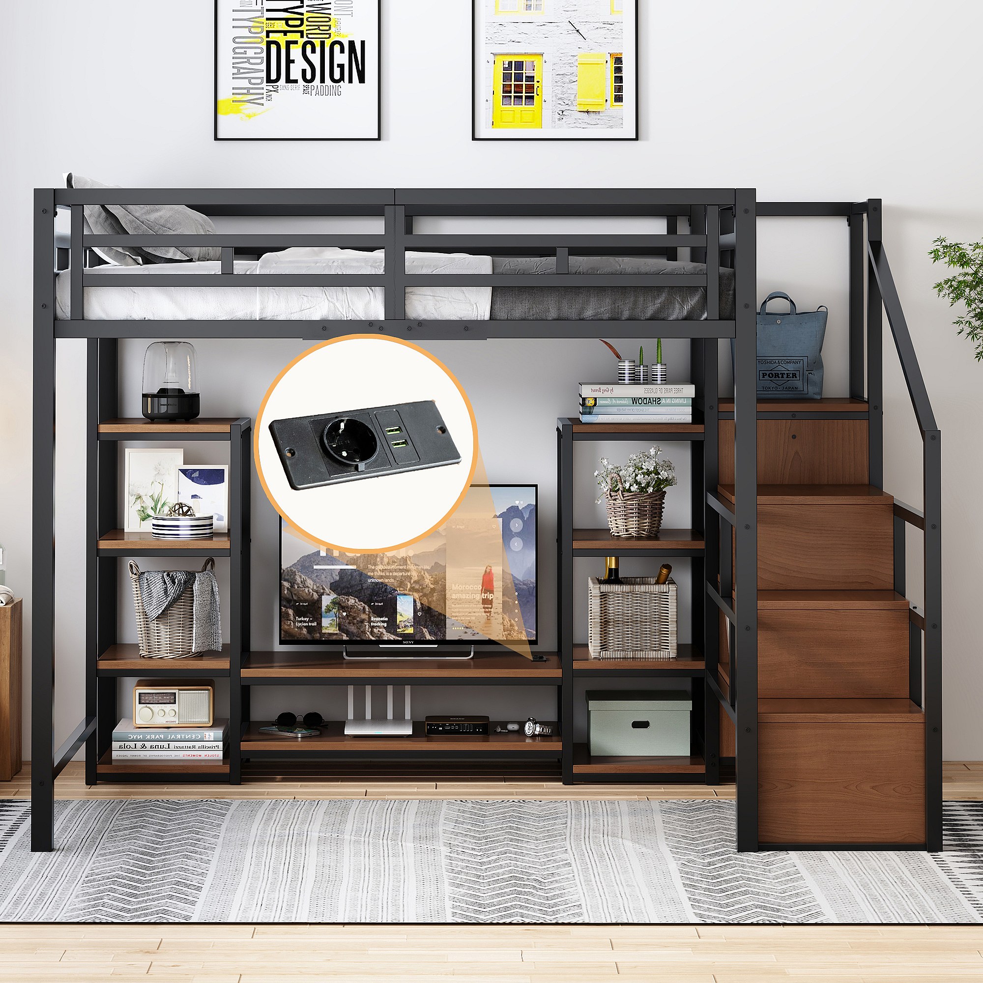 Kinderhochbett - 140 x 200 cm - mit TV-Schrank + Steckdose + Sicherheitsleiter + Ablageboden - Metall - schwarz