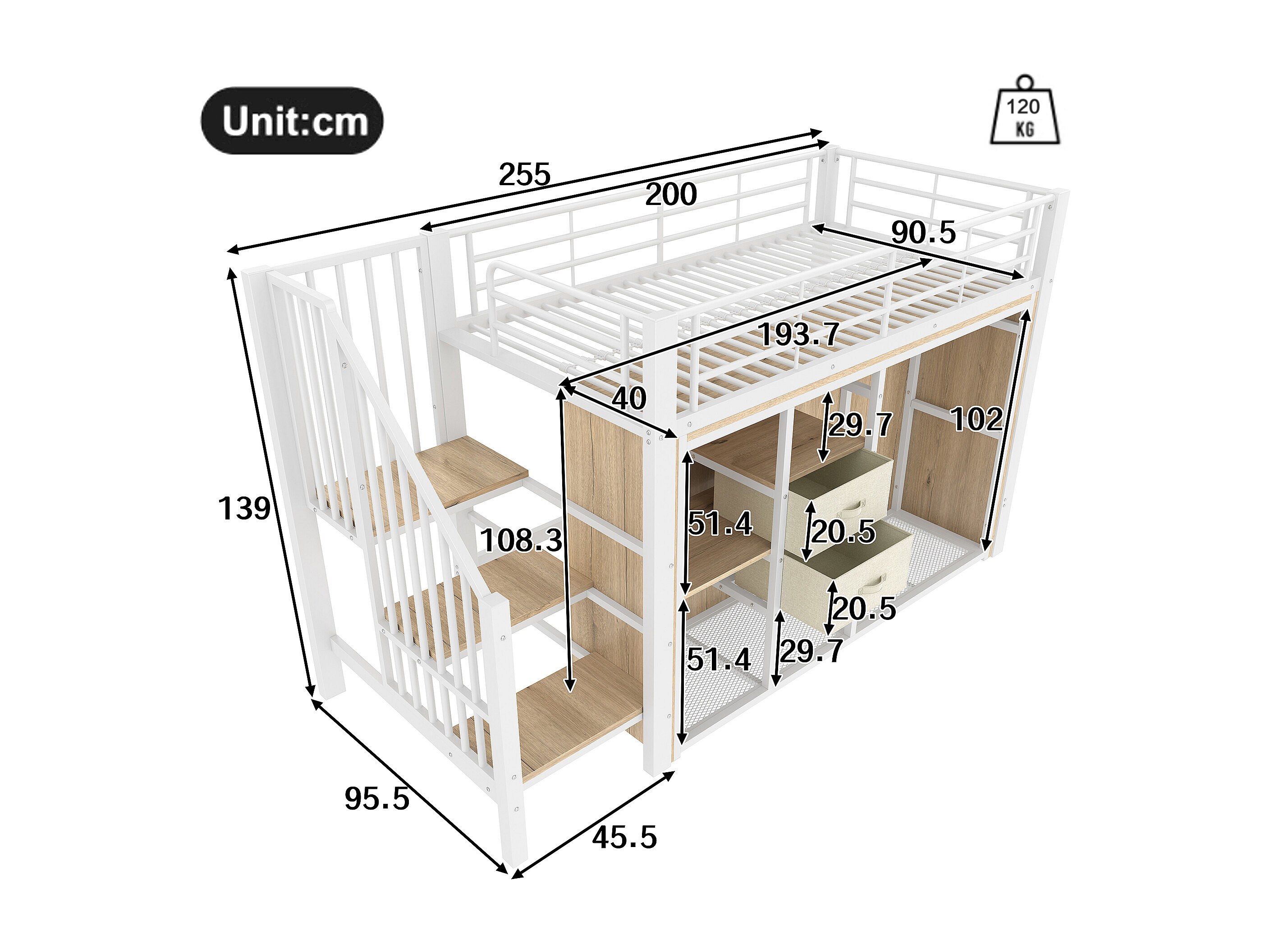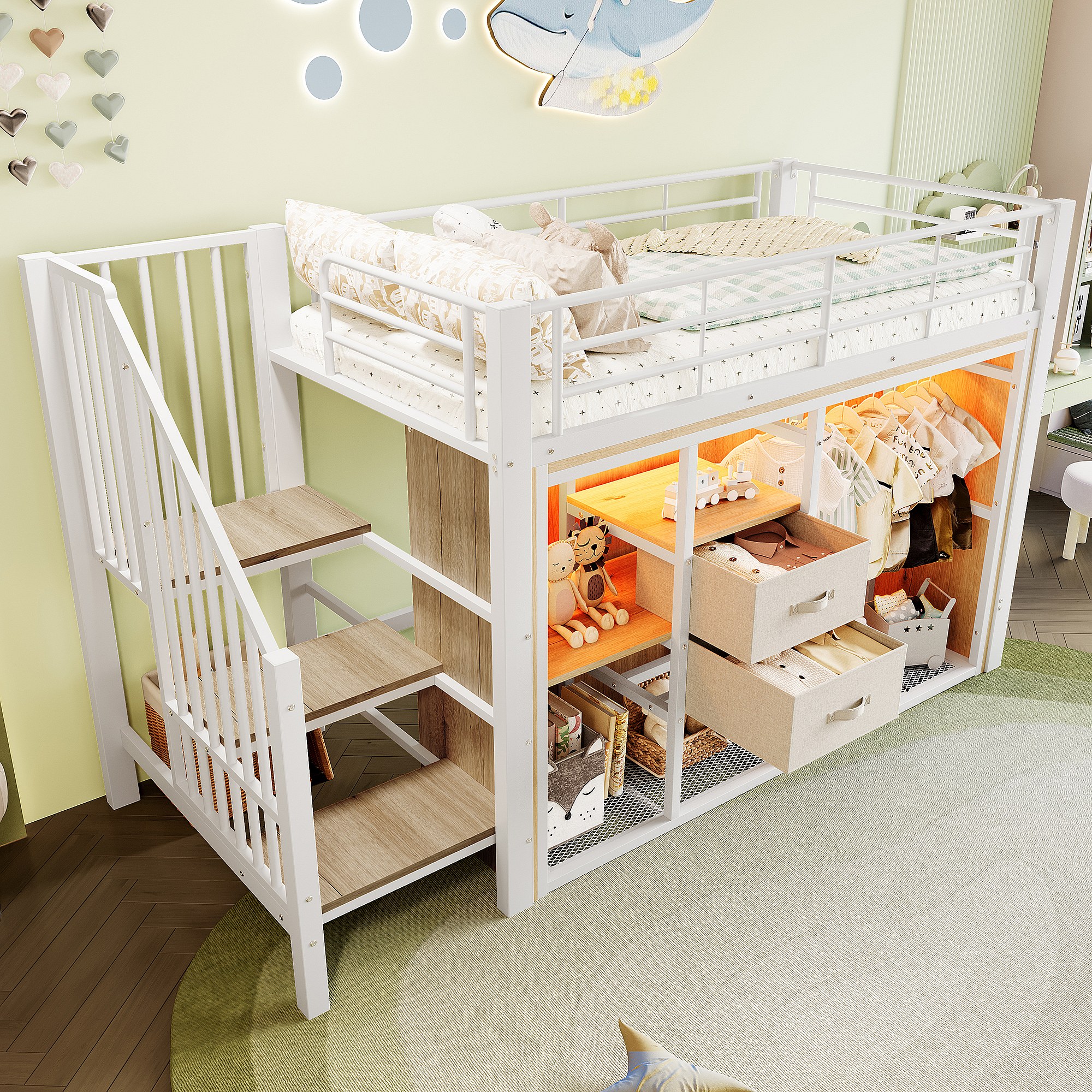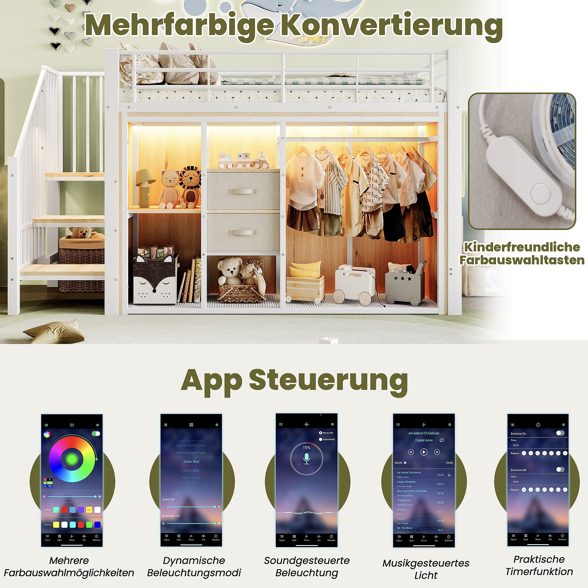 Kinderhochbett - 90 x 200 cm - mit 2 Schubladen + offenem Kleiderschrank + LEDs - Metall - weiß