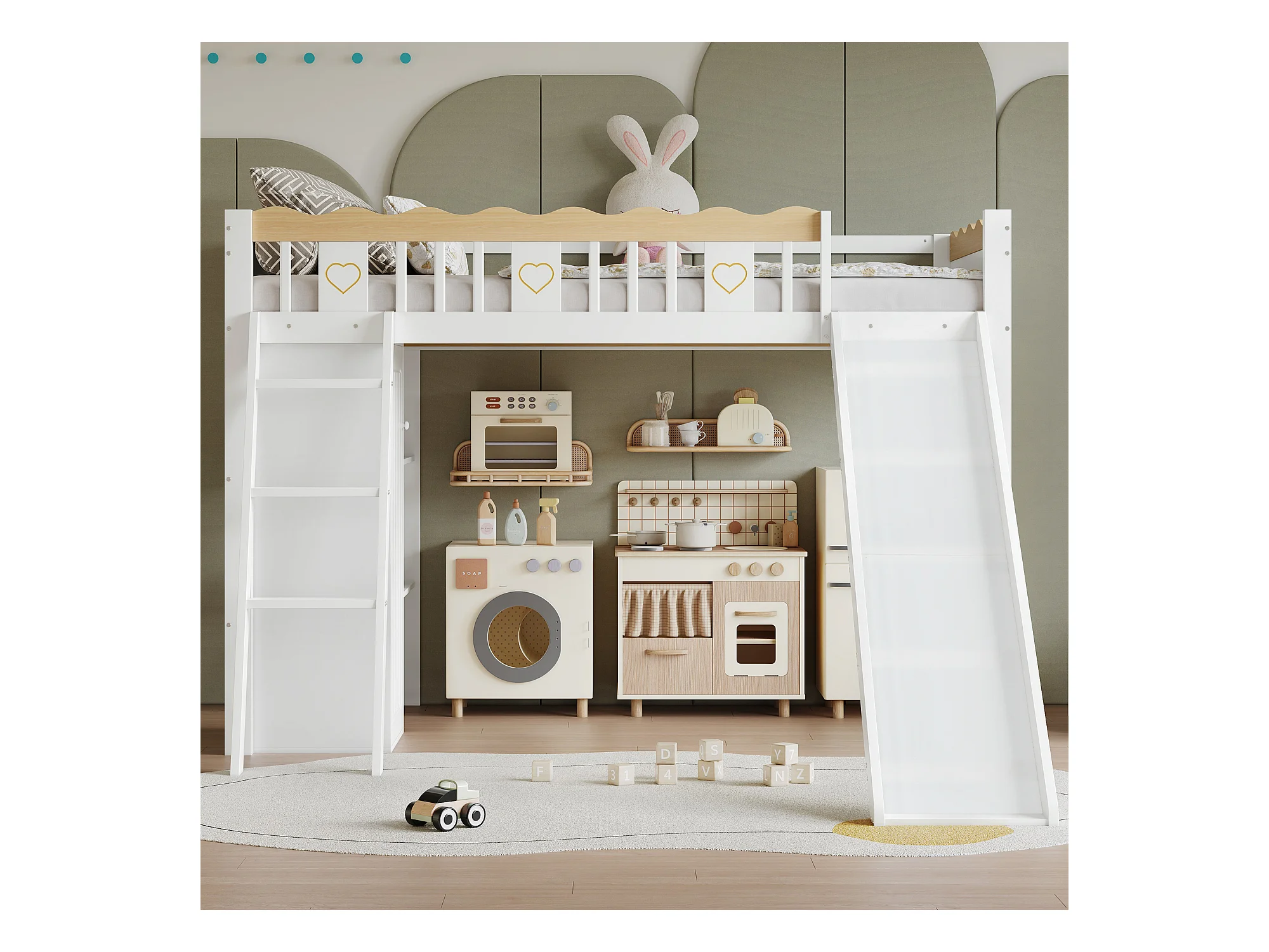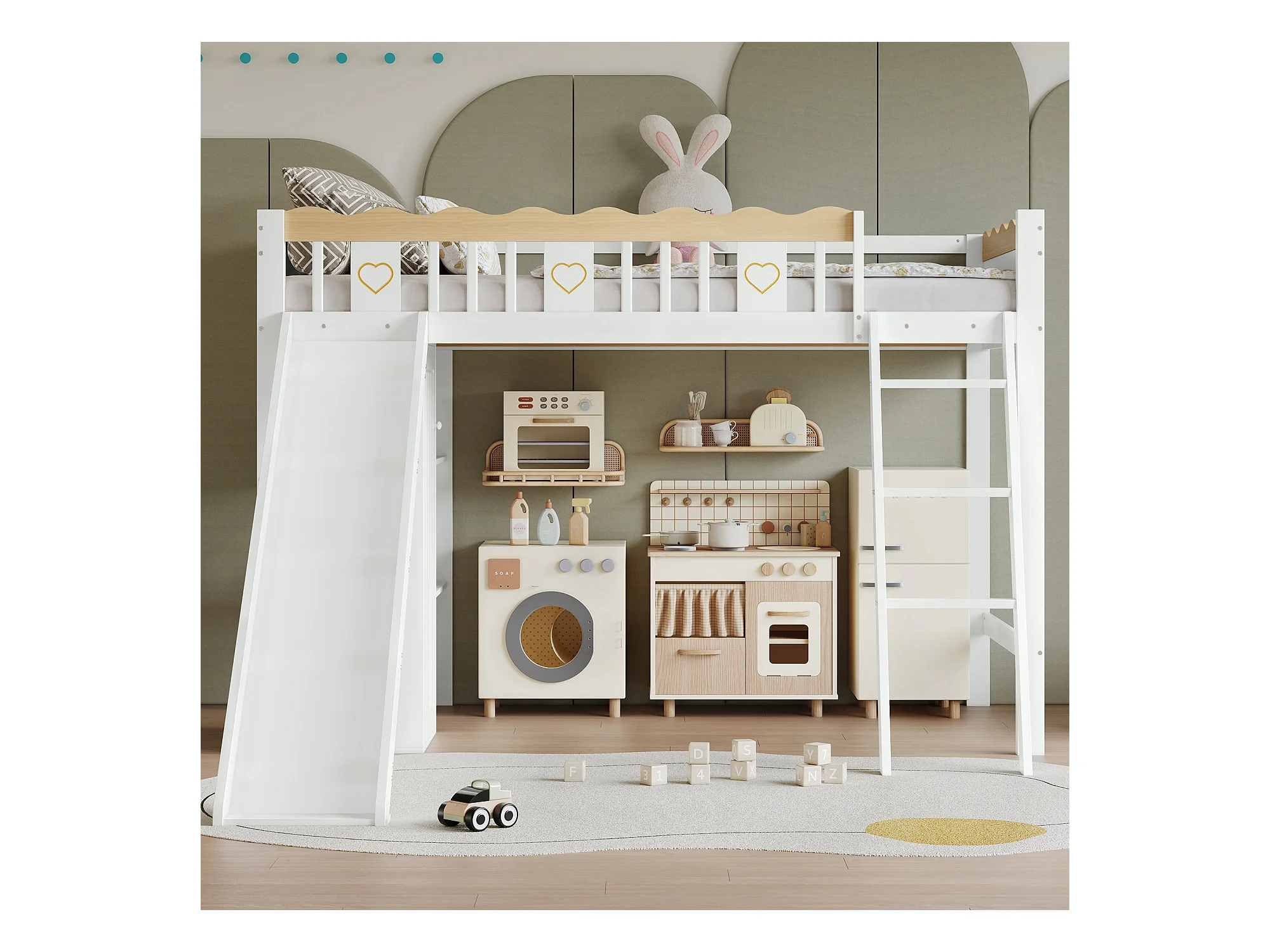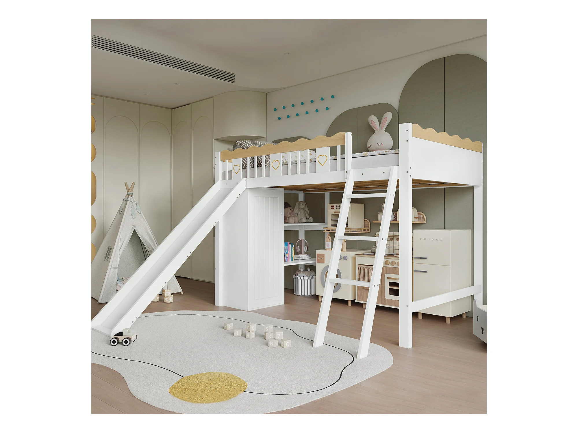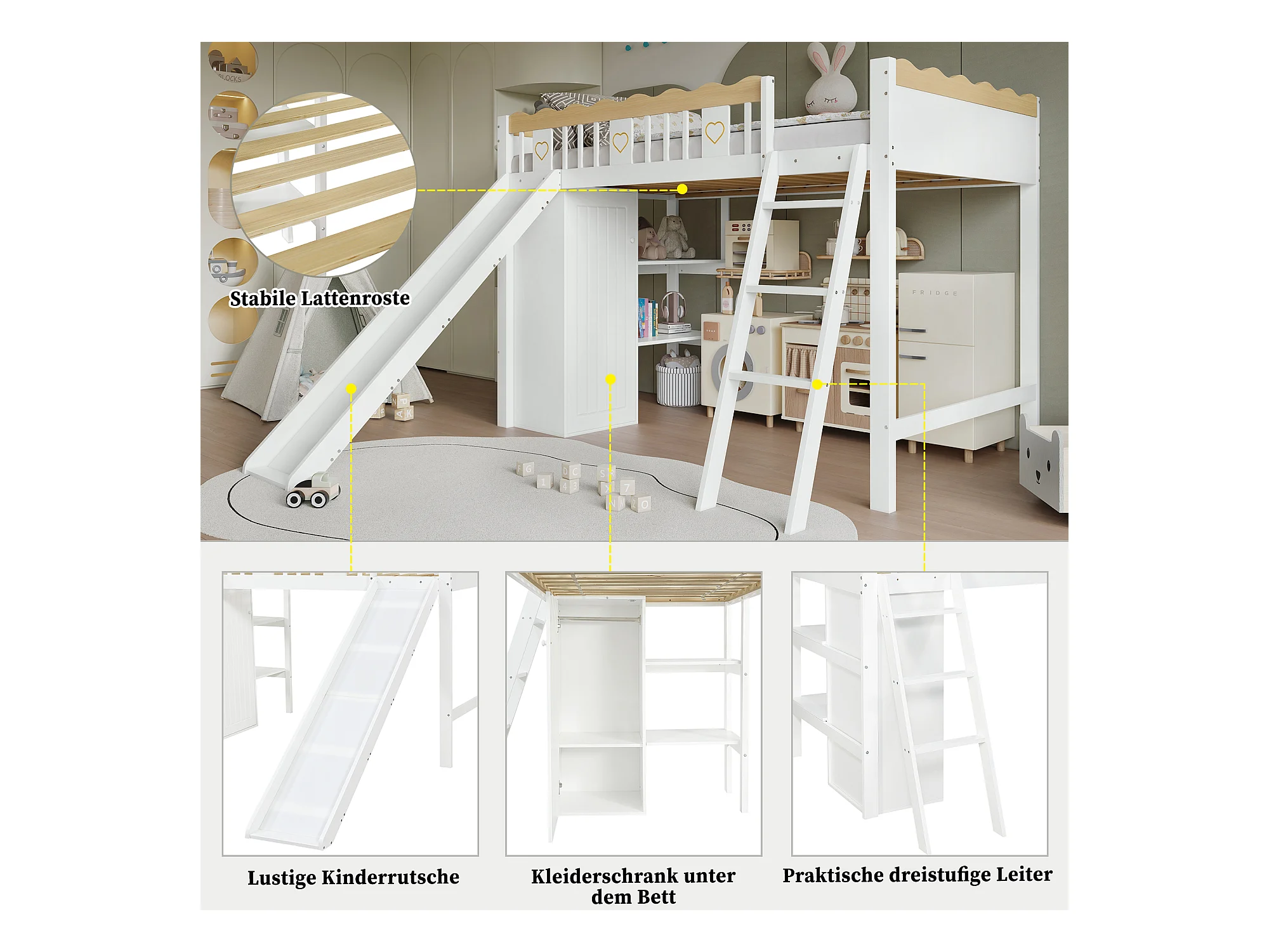 Kinderhochbett - 90 x 200 cm - mit Rutsche + Kleiderschrank + Ablageboden - Kiefer + MDF - weiß