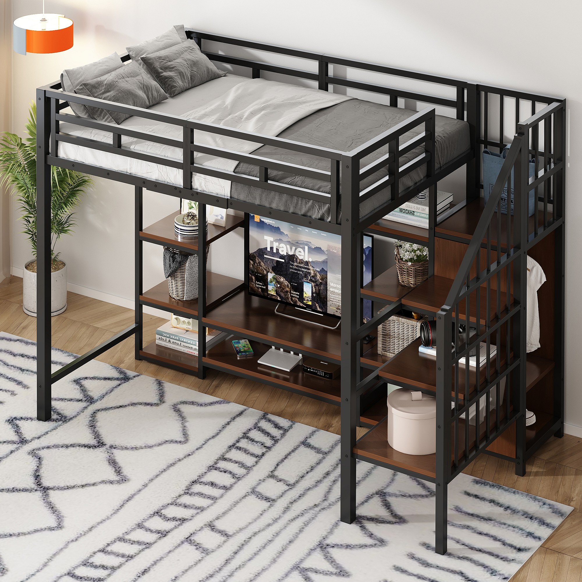 Kinderhochbett - 90 x 200 cm - mit TV-Schrank + Steckdose + Sicherheitsleiter + Ablageboden - Metall - schwarz