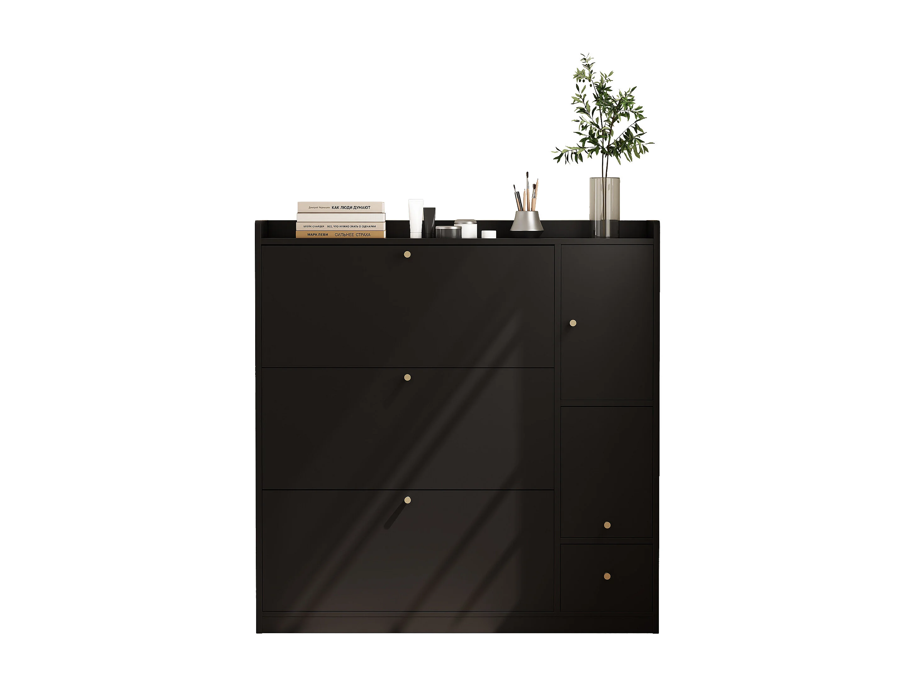Kippbarer Schuhschrank – 119 x 24 x 122 cm – mit 3 Klapptüren + Schublade + Klappbank – MDF – schwarz