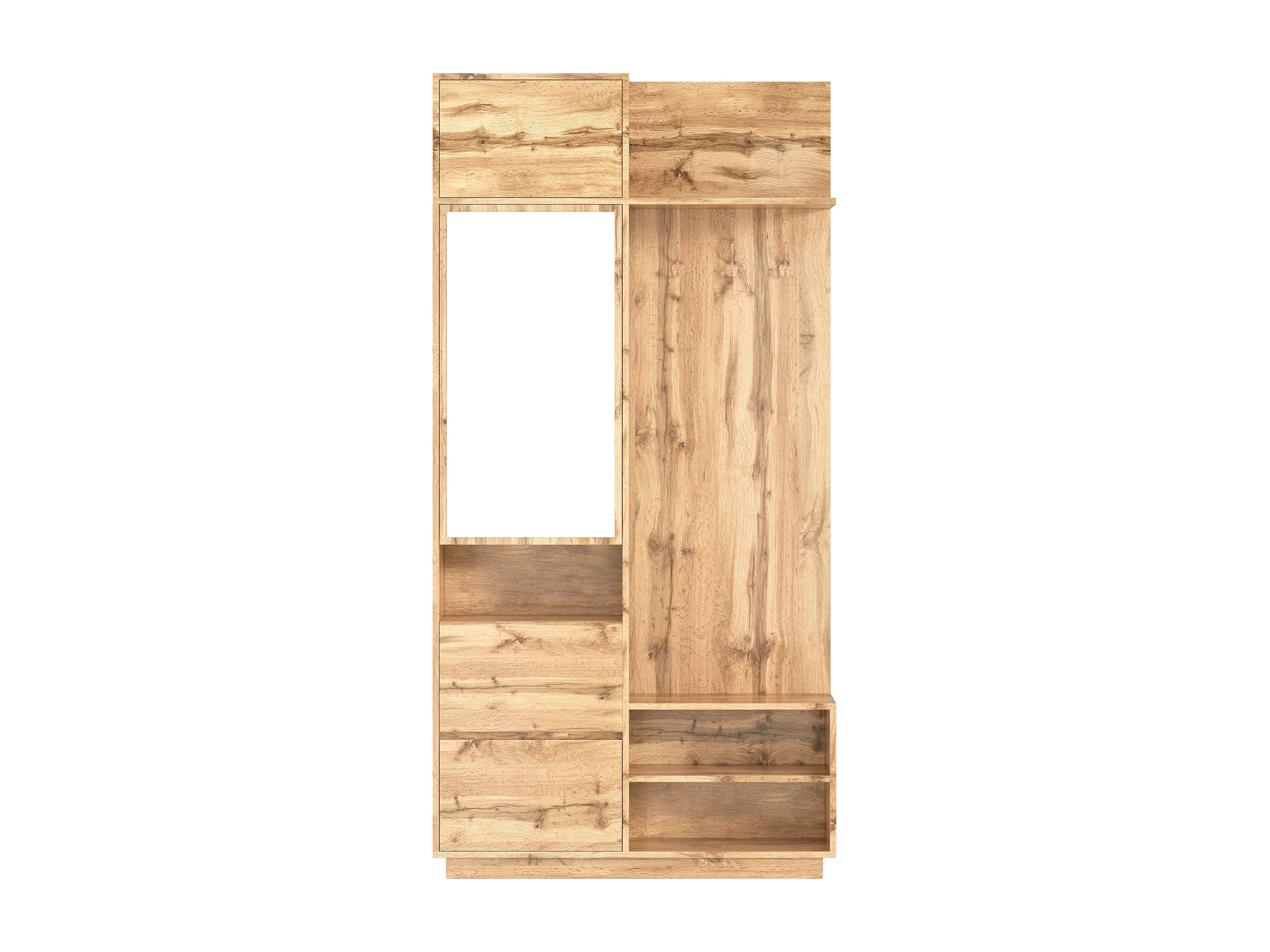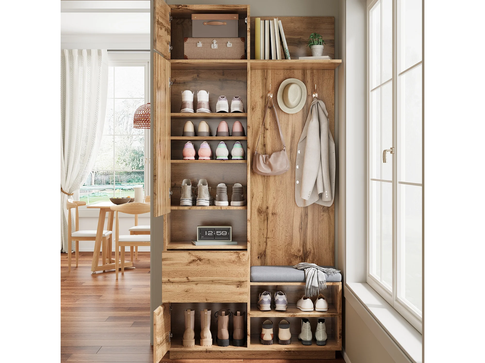Kleiderschrank mit Spiegel und Sitzbank – 90 x 34,5 x 190 cm – mit Schuhregal, Haken und Schublade – hell natur