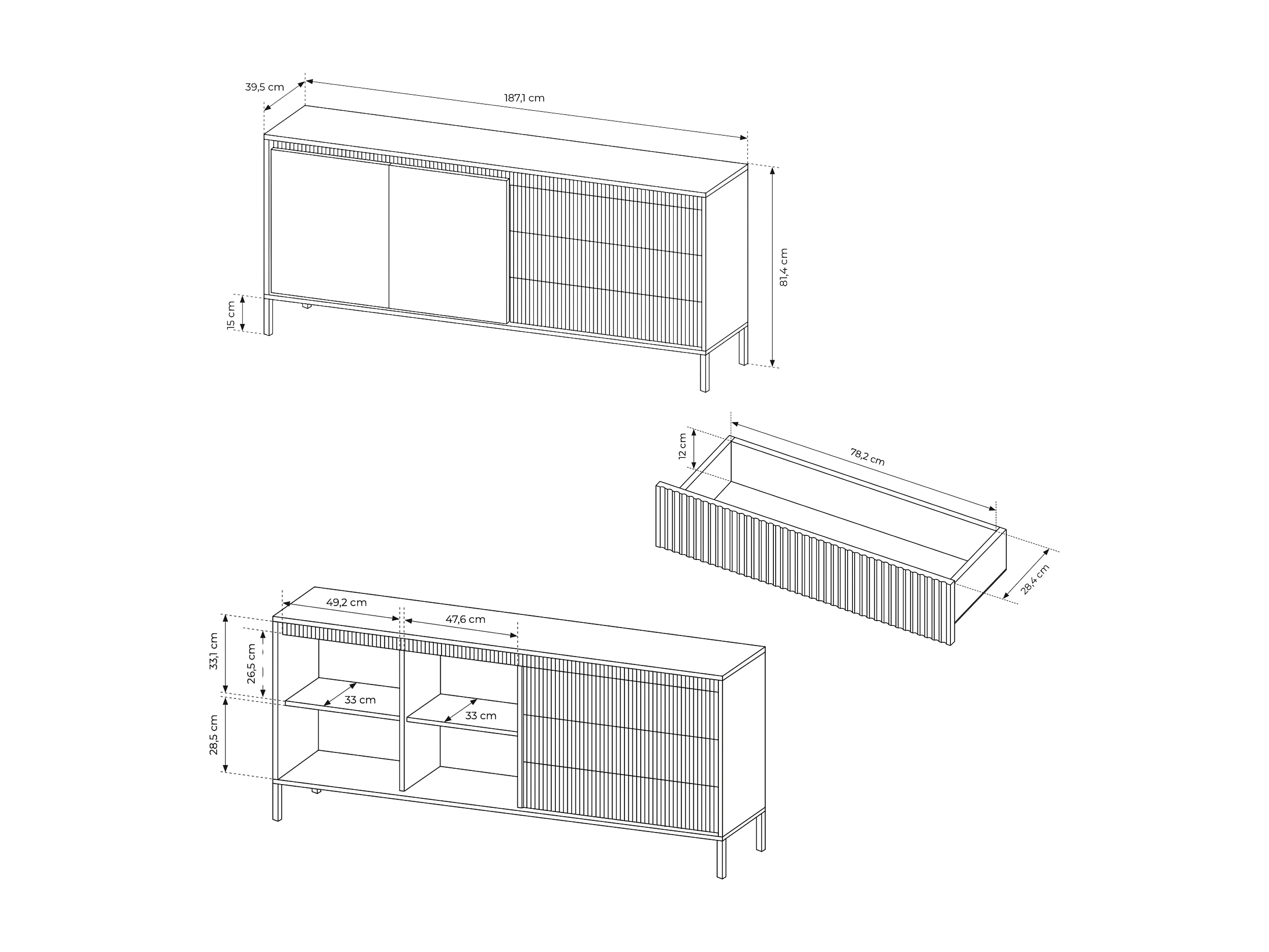 Kommode: 3 Schubladen, 2 Türen, schwarz, 81,4 x 187,1 x 39,5 cm