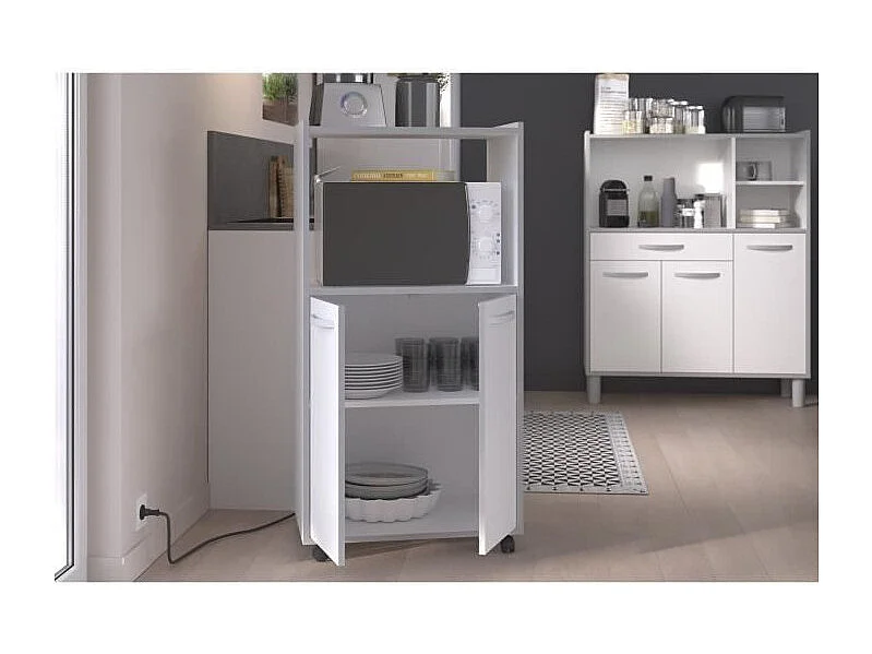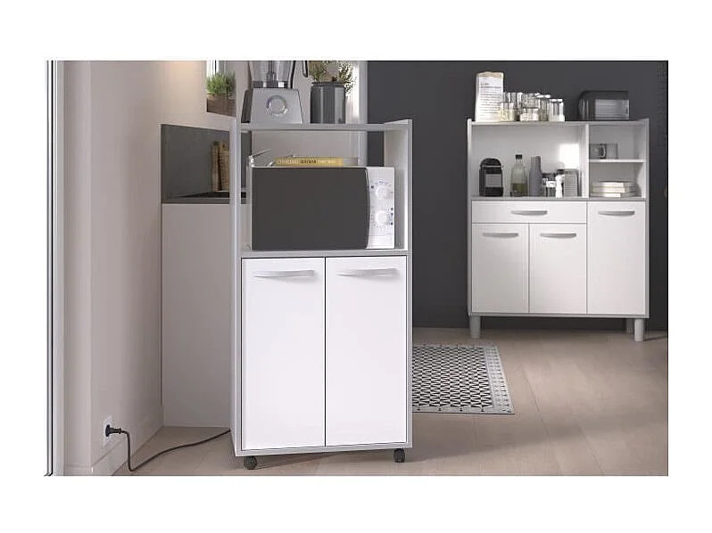 Kompakter Küchenwagen 60 cm mattweiß 2 Türen + Nische mit Regal, Mikrowellenfach, Kunststofffüße, Made in France