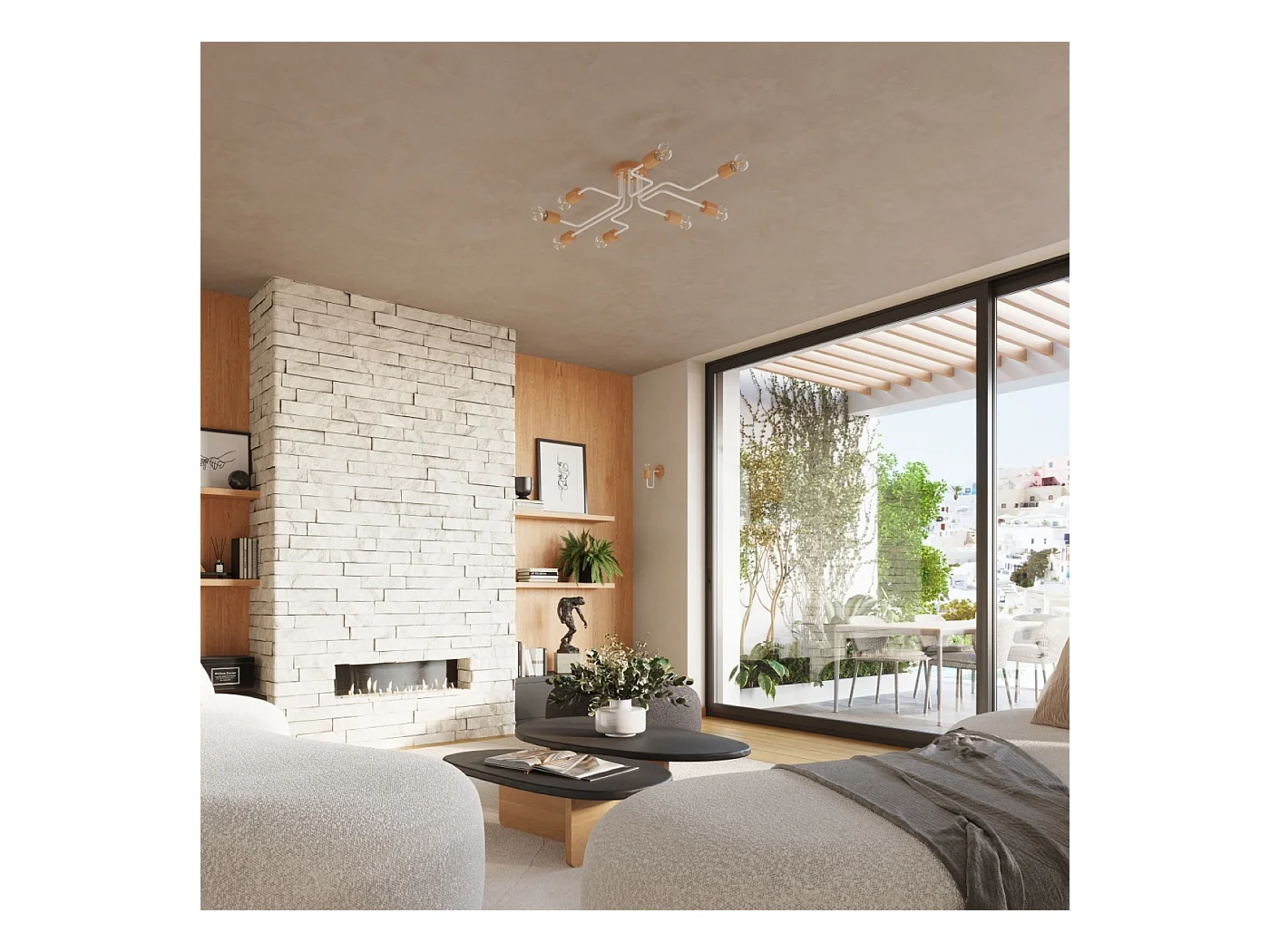 Kronleuchter Timbo Dachboden Aus Stahl/Holz - 6 Lichtquellen - L.85 X H. Cm - Weiß/Naturholz