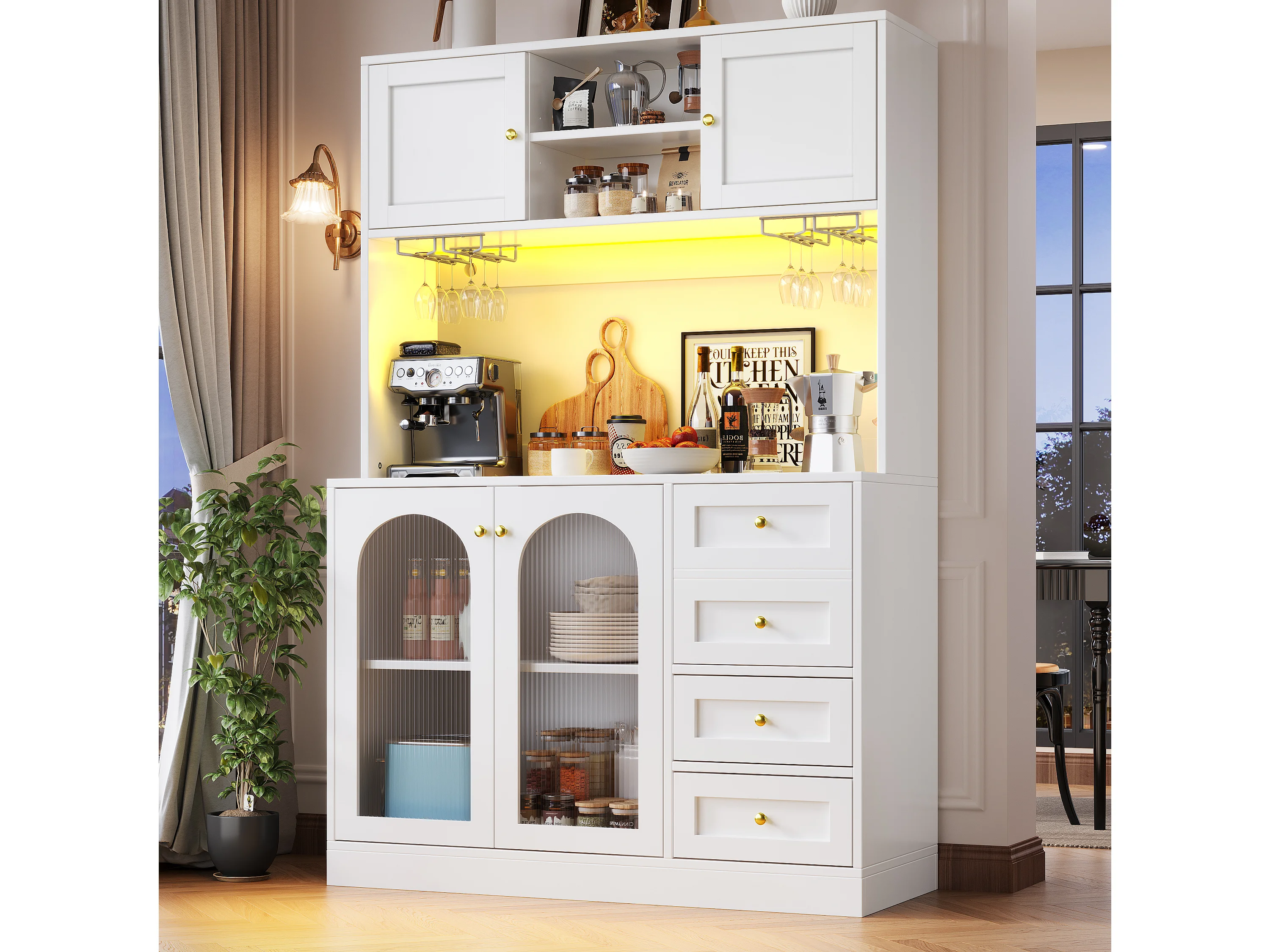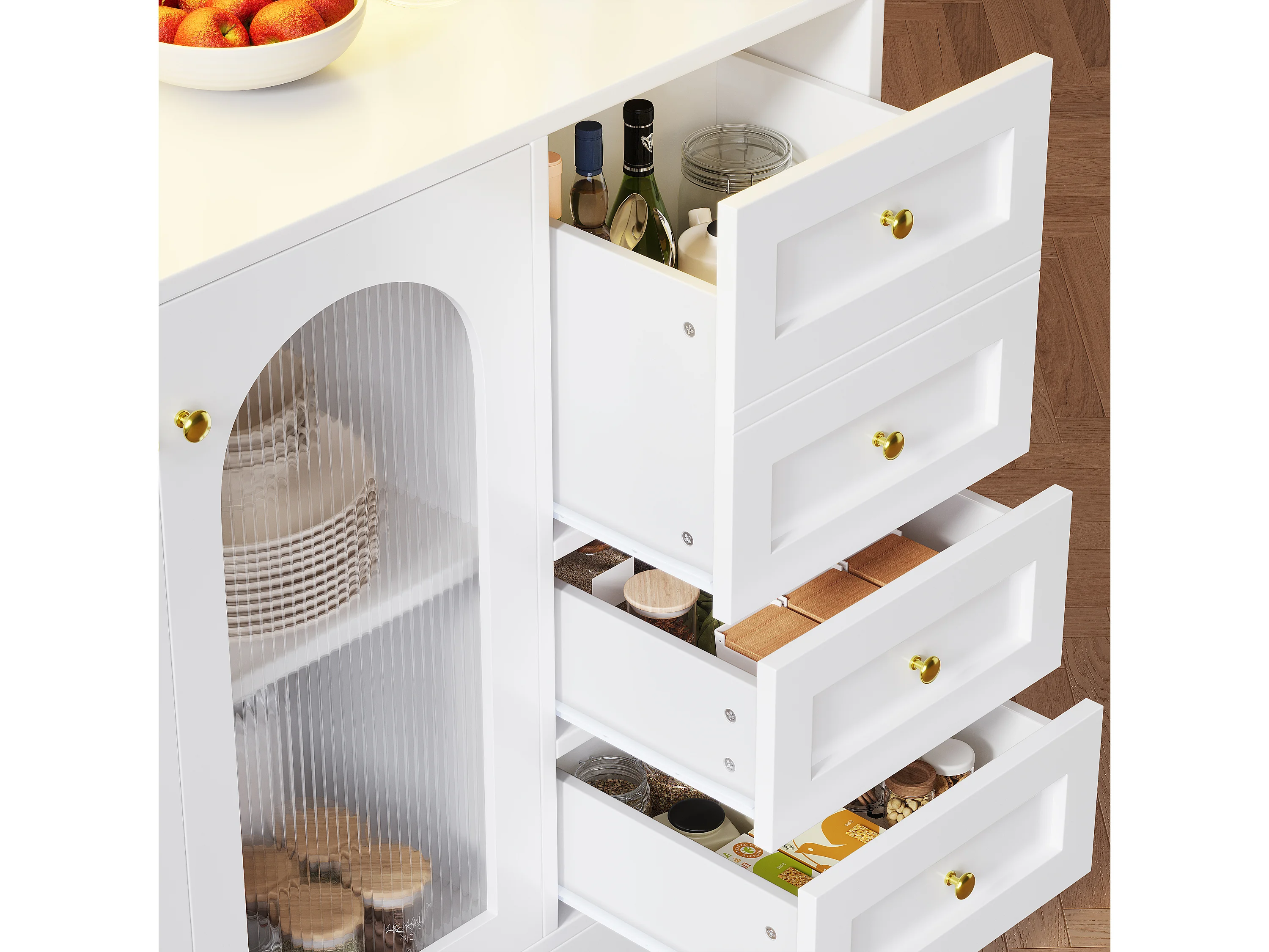Küchen-Sideboard im Landhausstil – 120 x 40 x 188 cm – mit 4 Türen, LED-Beleuchtung, Ablagefächern und Schubladen – MDF – weiß