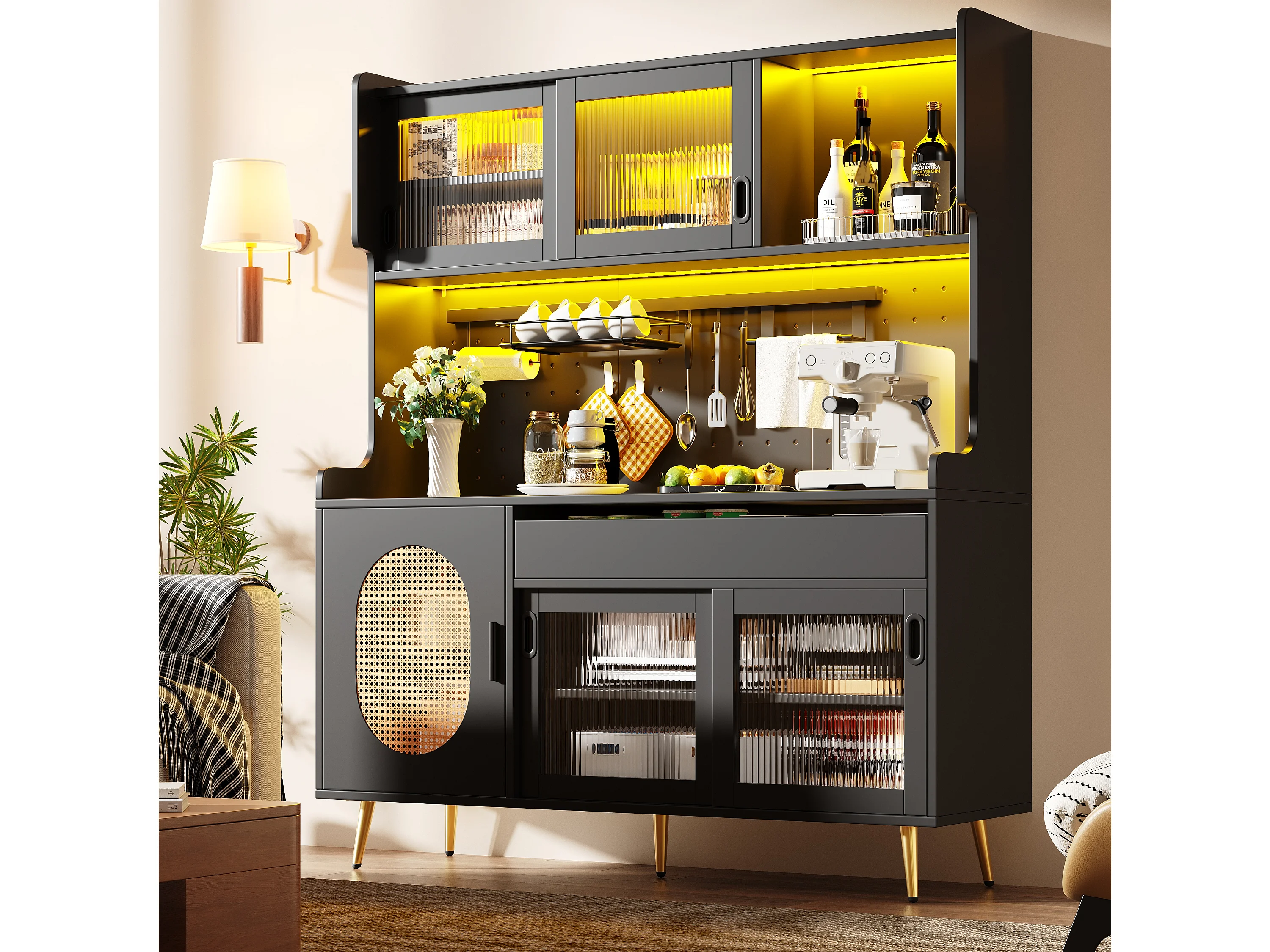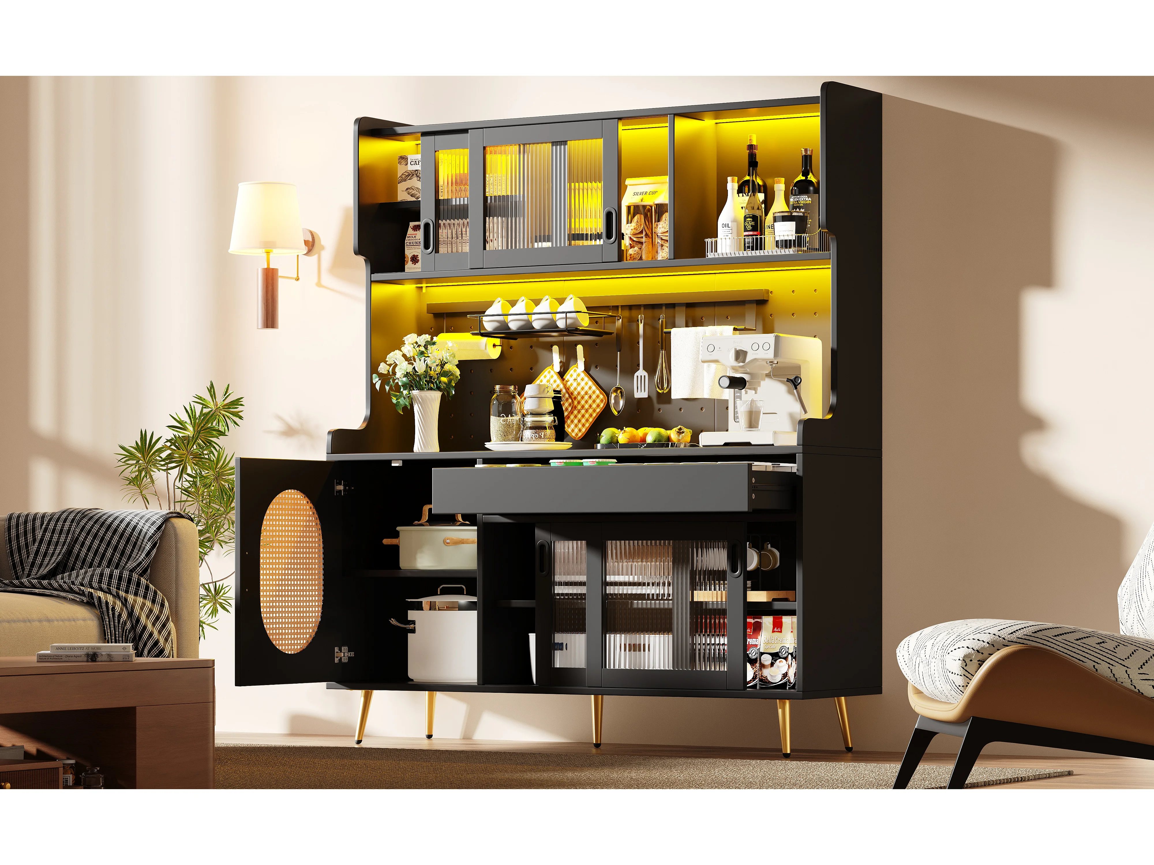 Küchen-Sideboard im Landhausstil – 145 x 39 x 171 cm – mit 5 Türen, LED-Beleuchtung, Ablagefach und Schublade – MDF – schwarz