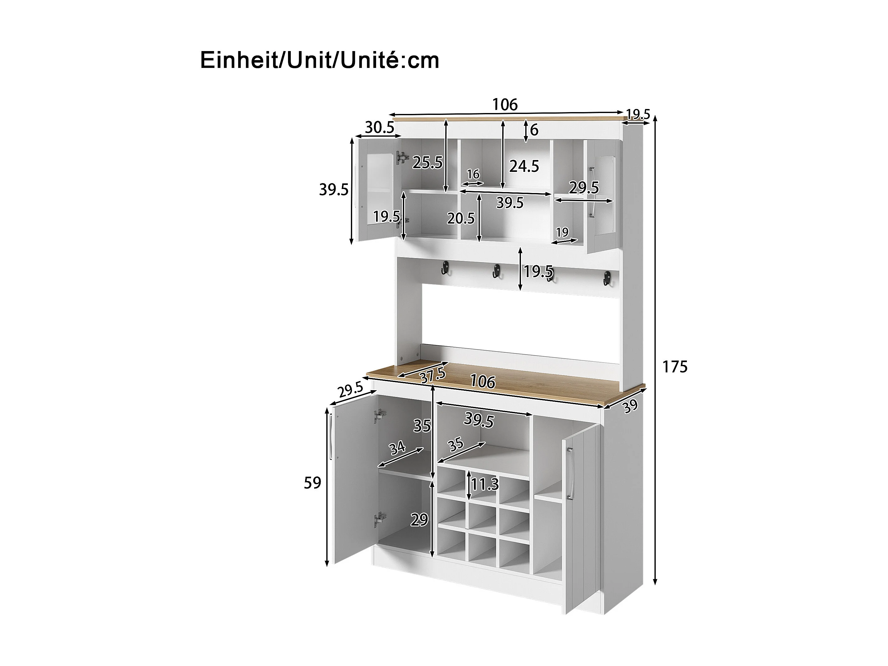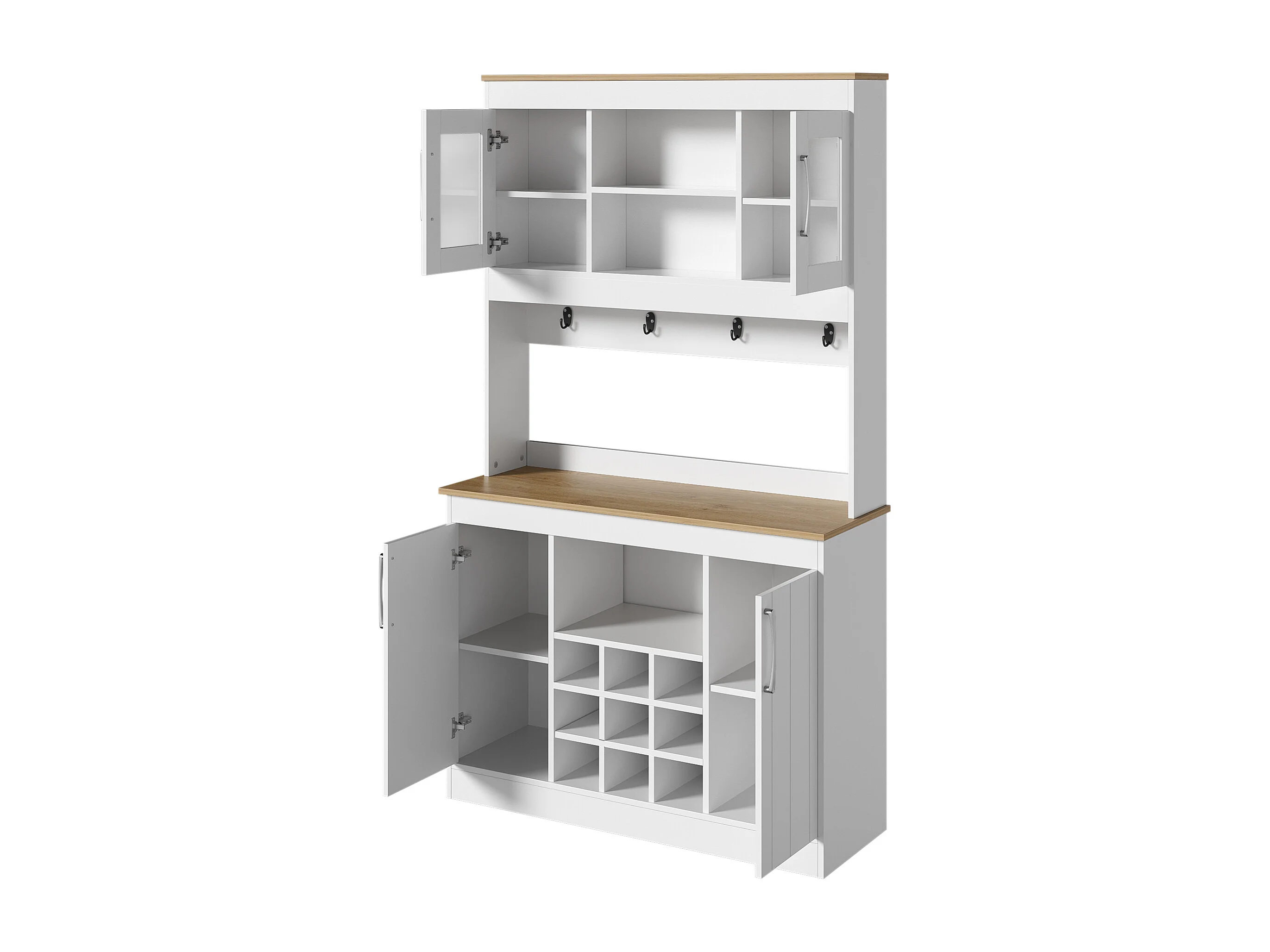 Küchenbuffet 106x39x175 cm - 4 Türen - Weinregal und Haken - Spanplatten - Weiß + Natur
