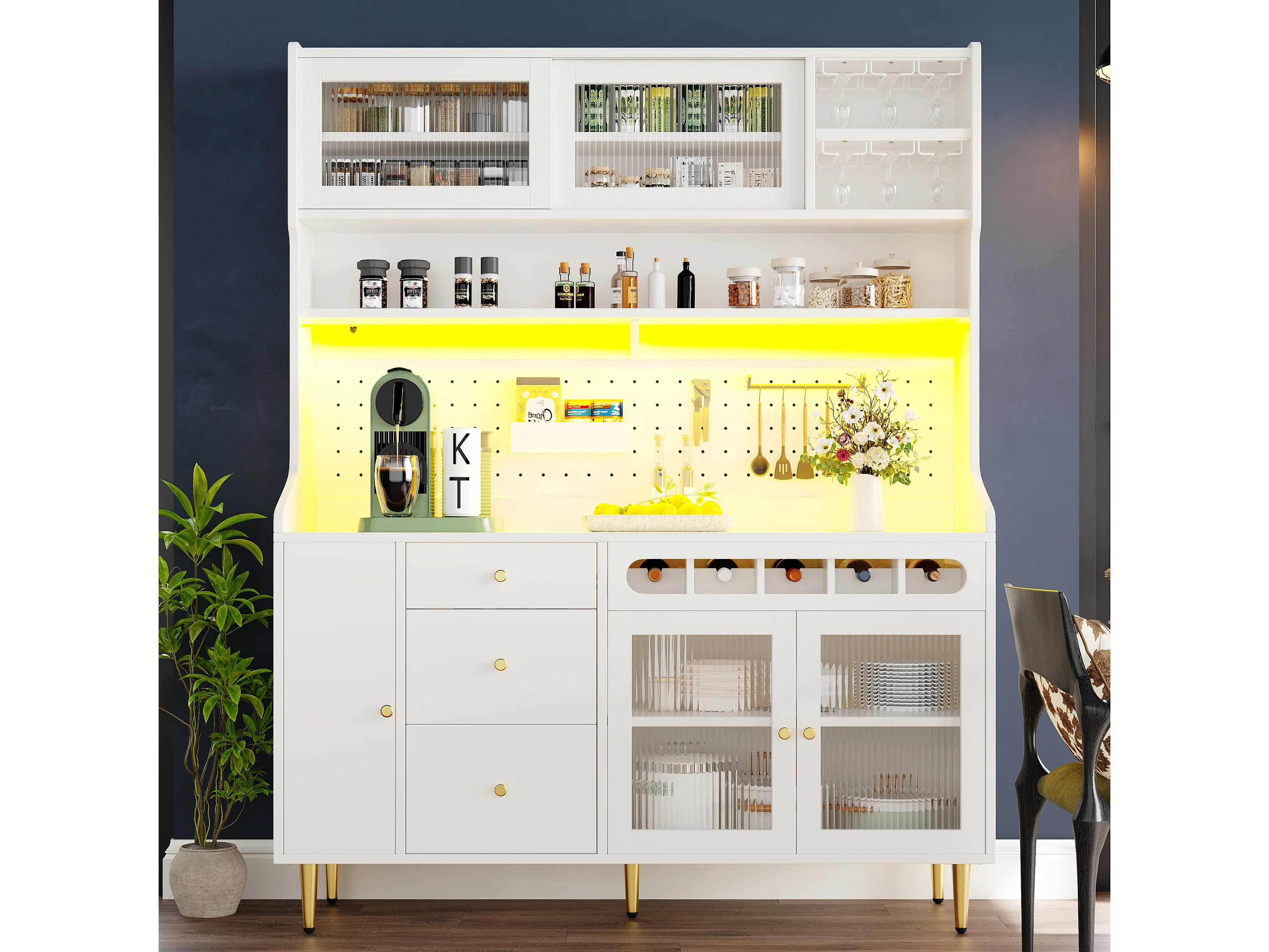 Küchenbuffet 145x39x171 cm - mit LED-Beleuchtung - 4 Glastüren - 3 Schubladen - mit Lochplatte - weiß
