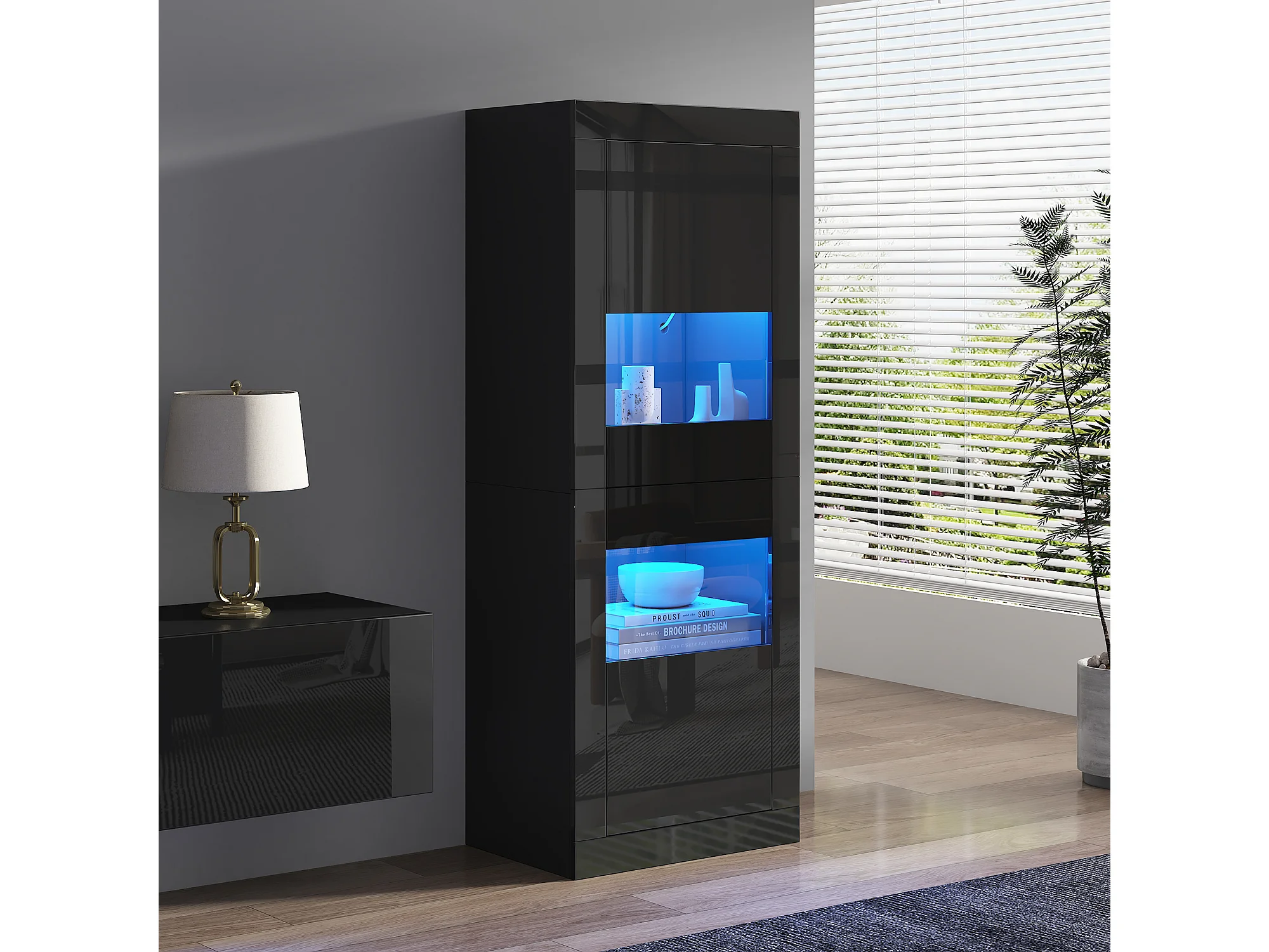 Lackierte Vitrine mit LEDs, 1 Glasboden und Tür – 61 x 42 x 162 cm – Spanplatte – schwarz