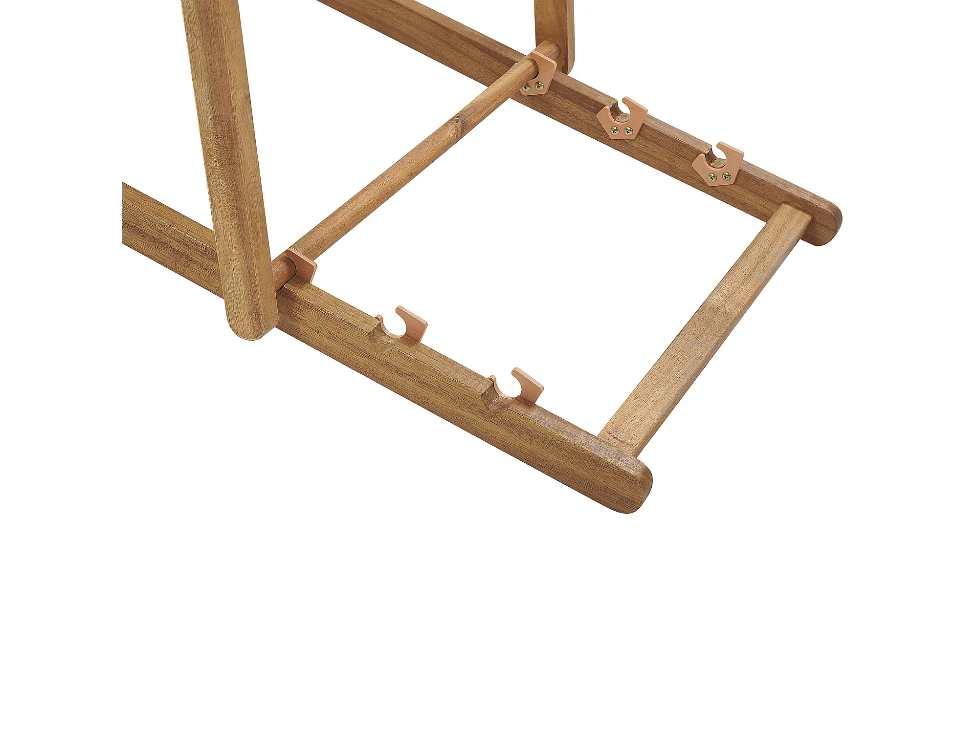 Zwei Liegestühle aus hellem Akazienholz Stoffbezüge Pelikanmuster bunt Anzio