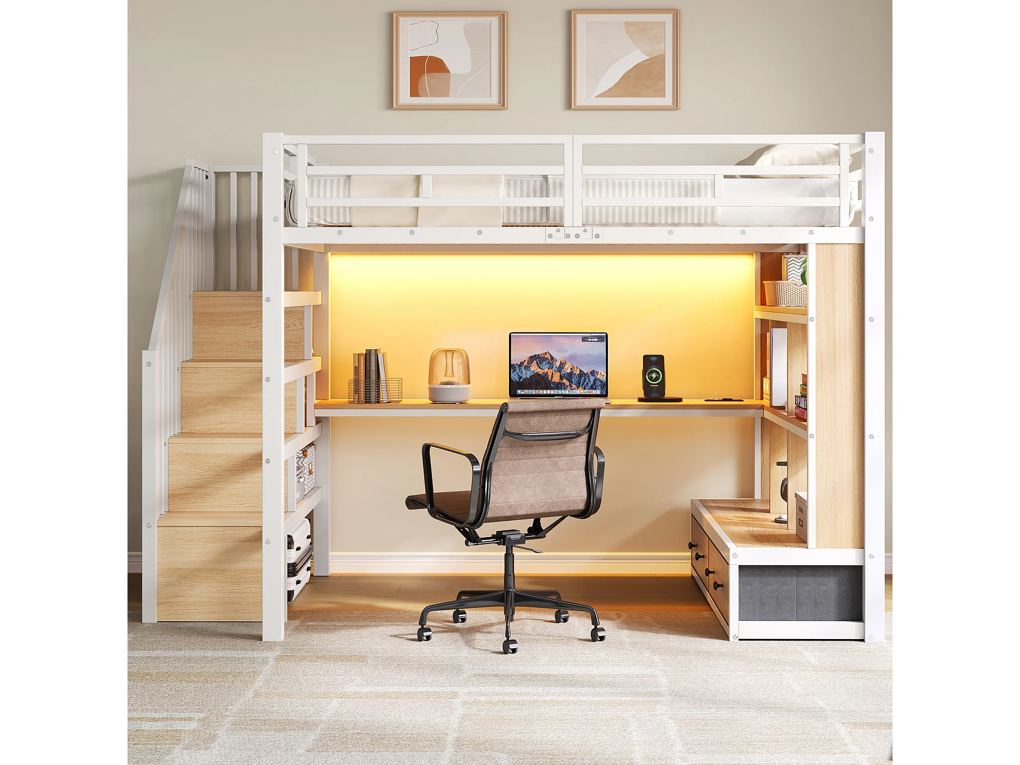 Metall-Hochbett – 140 x 200 cm – mit Schreibtisch, Regalen, 2 Schubladen und Leiter mit Stauraum – weiß