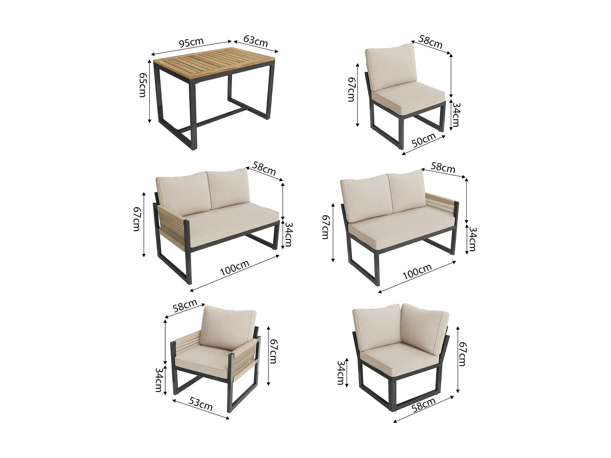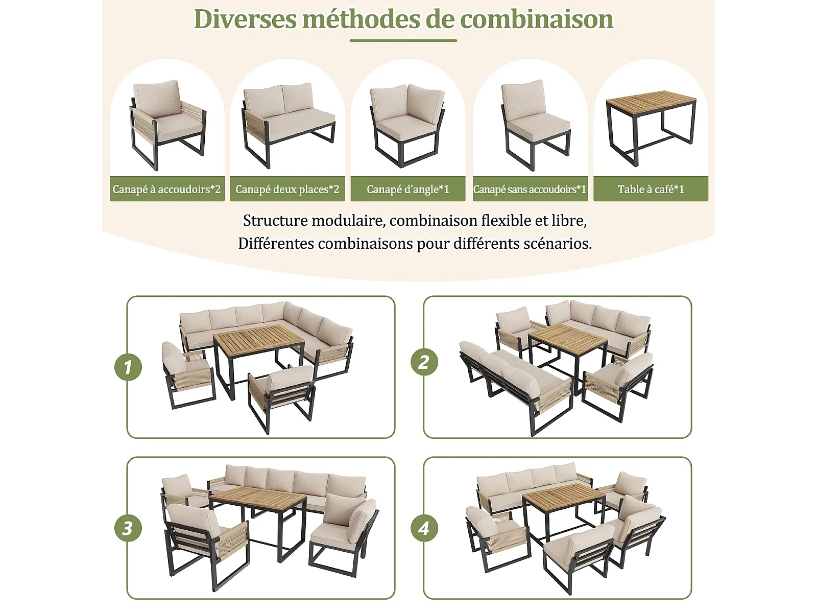 Metallgartenmöbel, modulares Sofa und Couchtisch mit 2 Sesseln, 7-8 Sitze, Beige