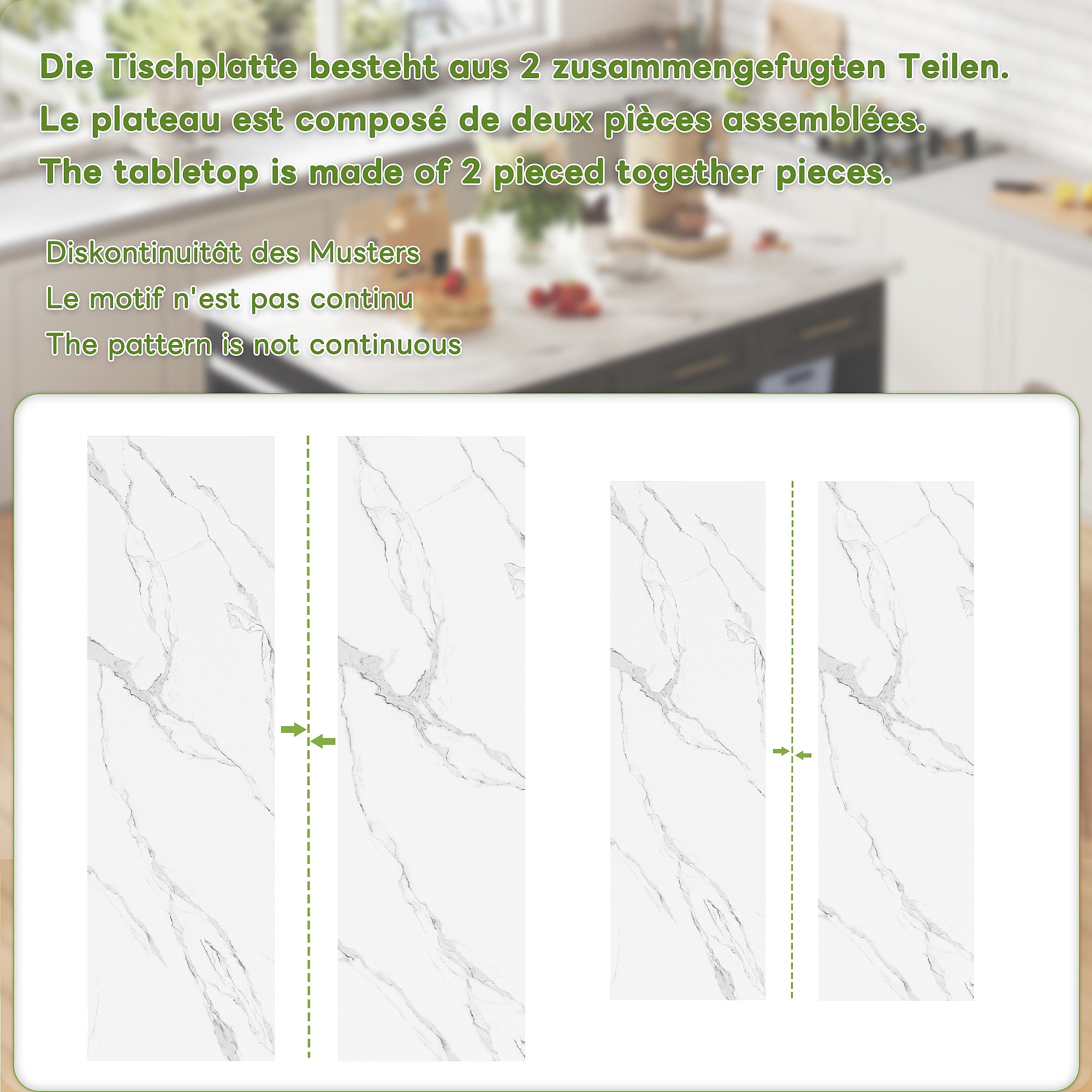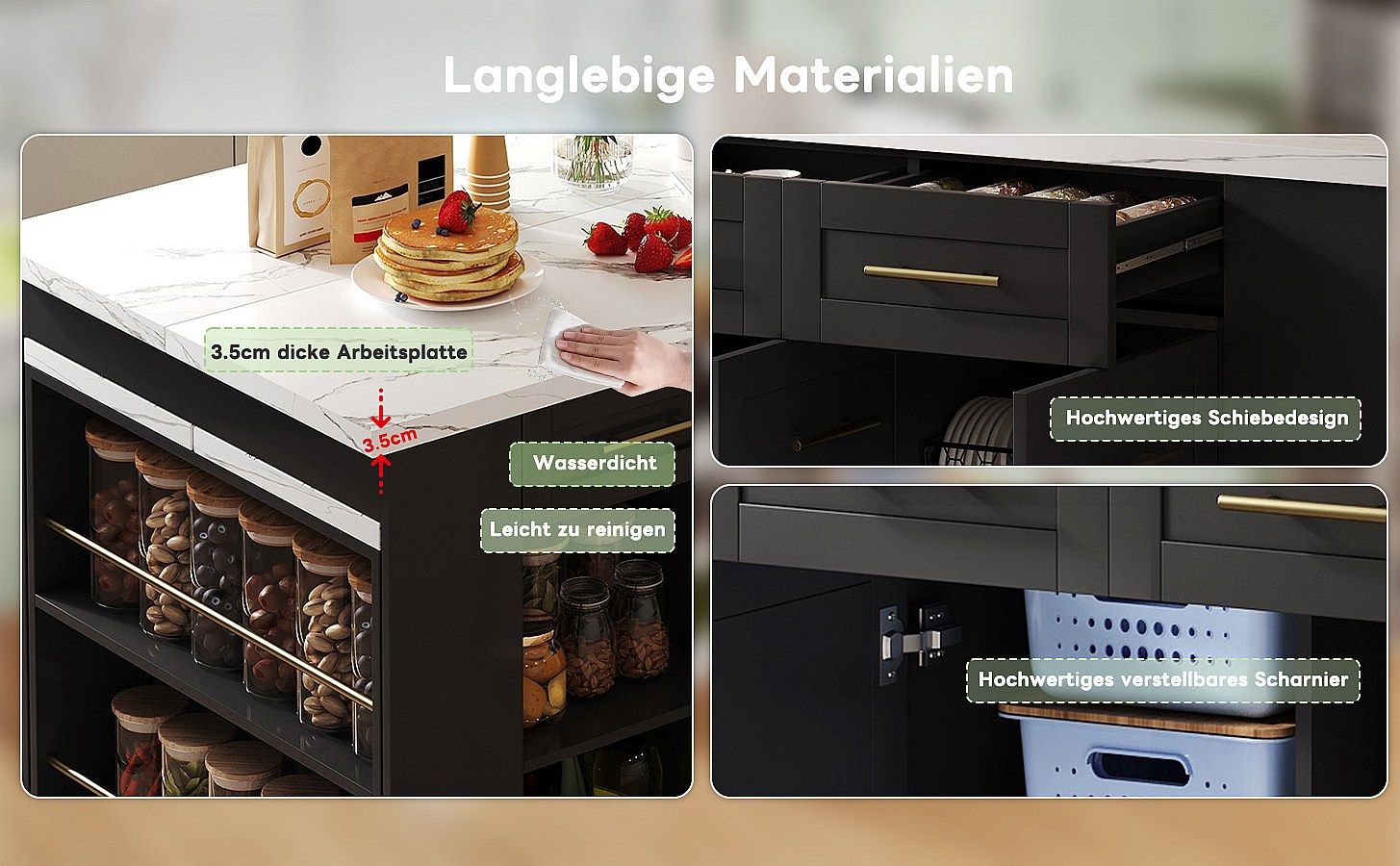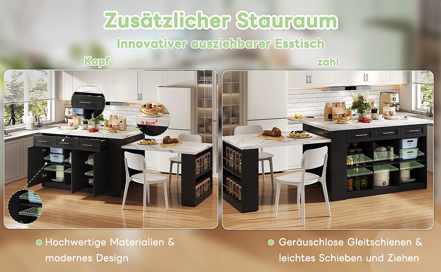 Mittelinsel mit 3 Türen + 6 Schubladen und Regal - ausziehbare Platte - 150/246 x 90 x 90 cm - MDF - Weiß + Schwarz