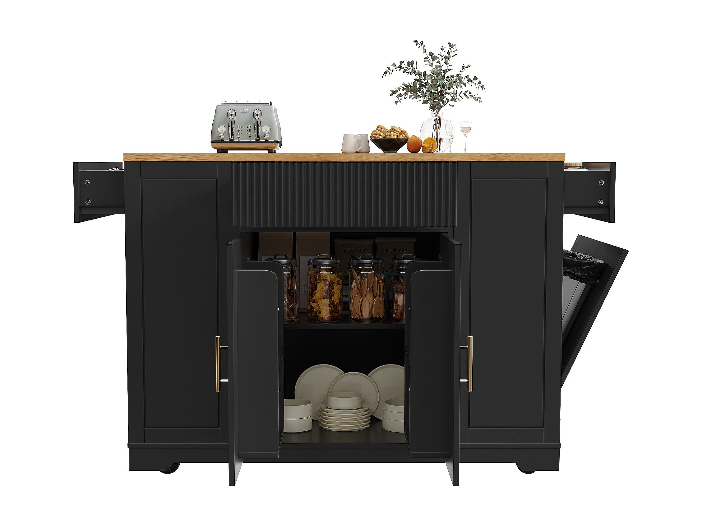 Mobile Kücheninsel - 3 Türen und 2 Schubladen - Offene Ablagefächer - Mit Mülltrennfach - MDF - Schwarz